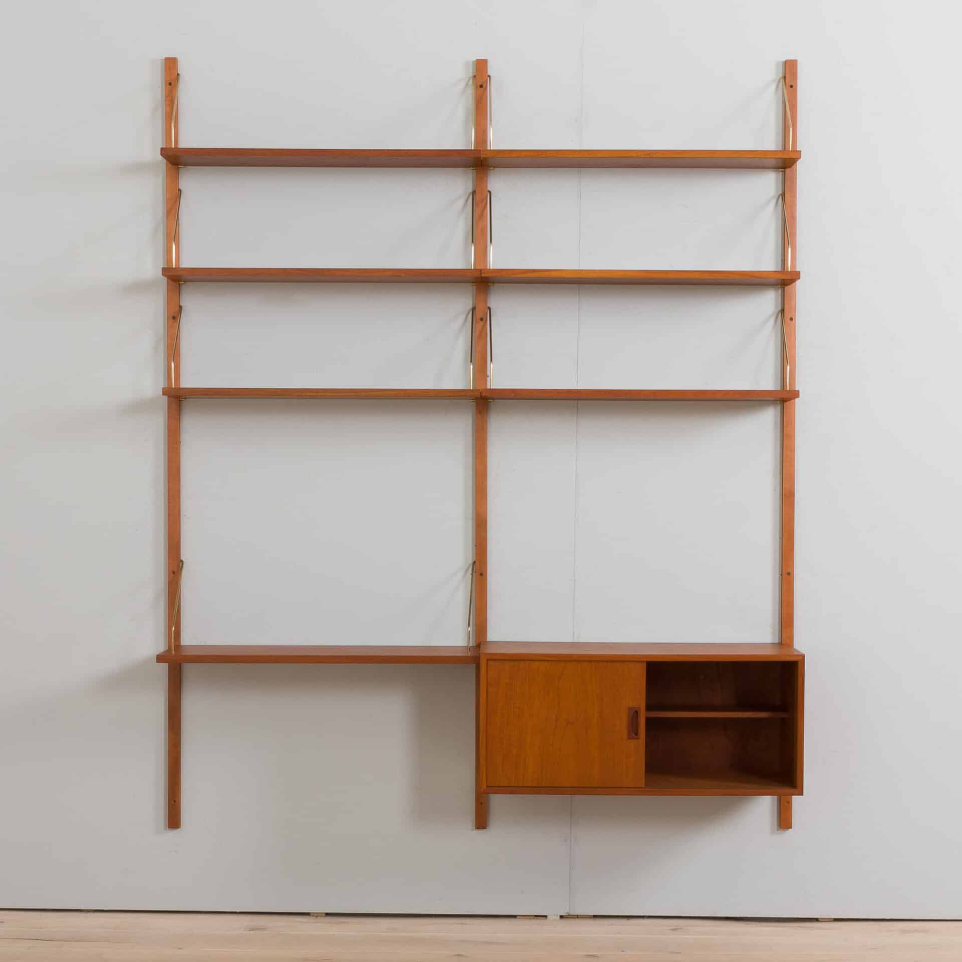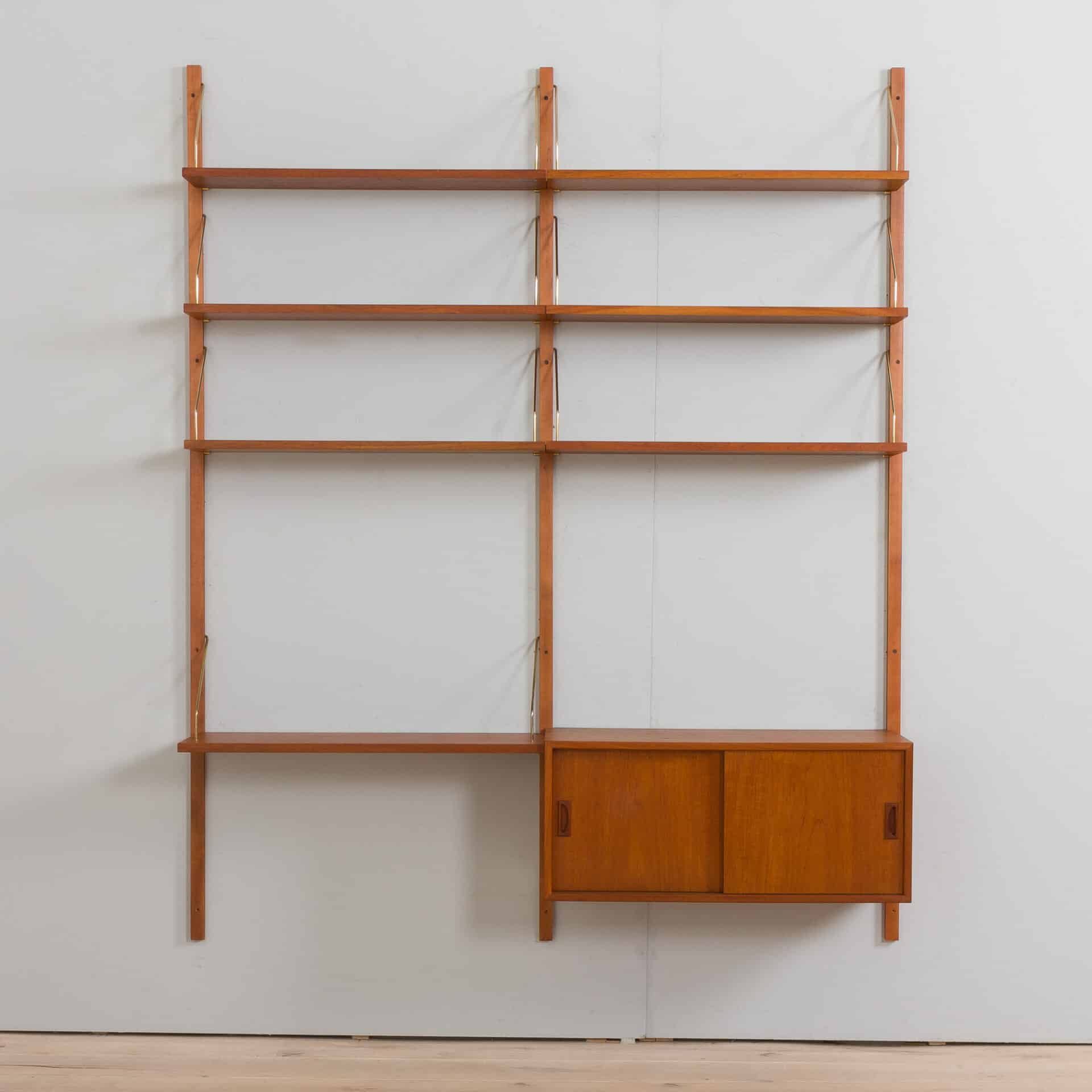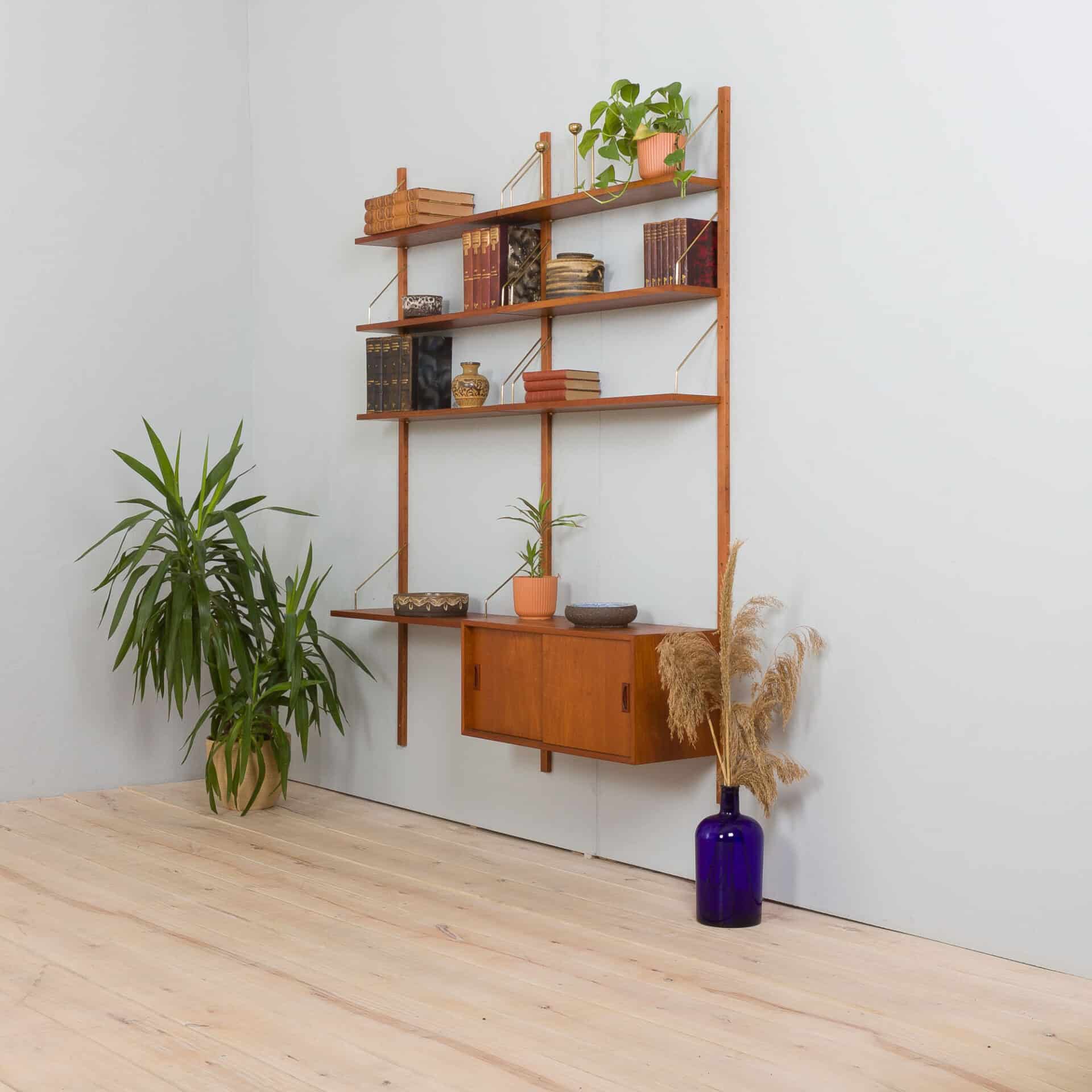 Danish two bay teak wall in Poul Cadovius style with a cabinet and modular shelving, 1960s