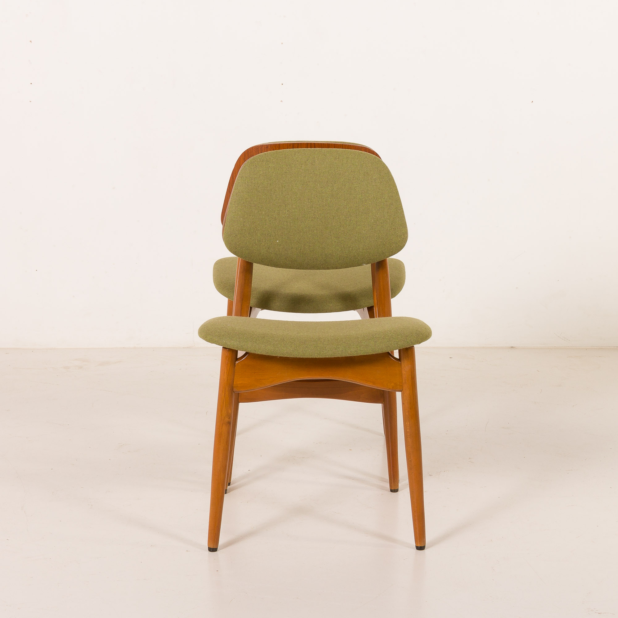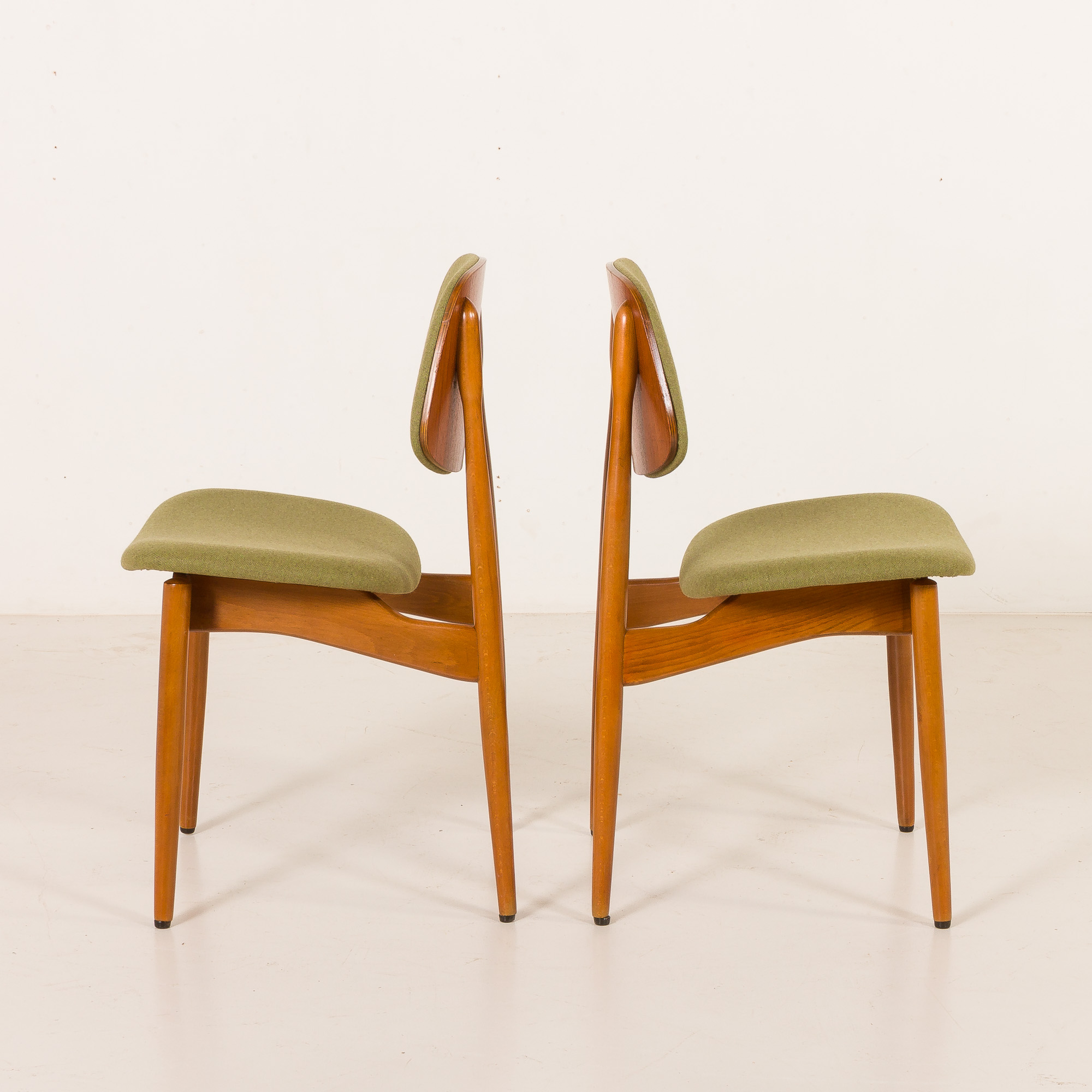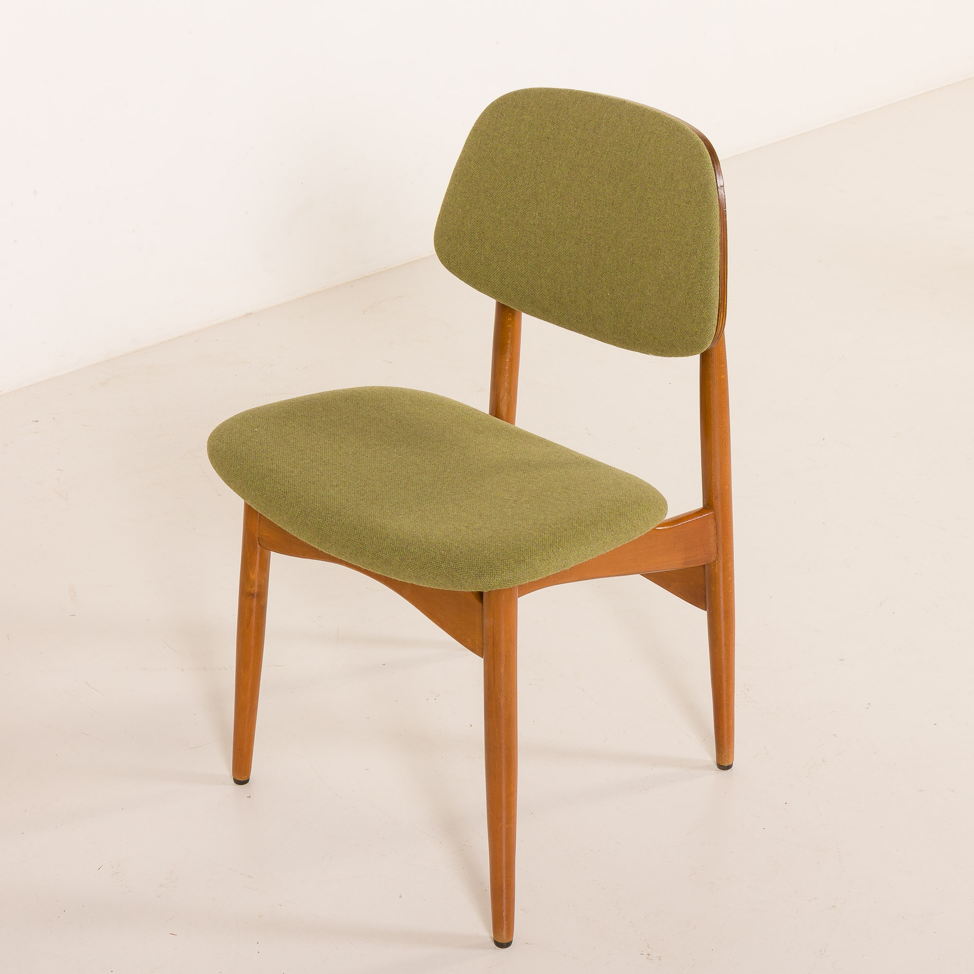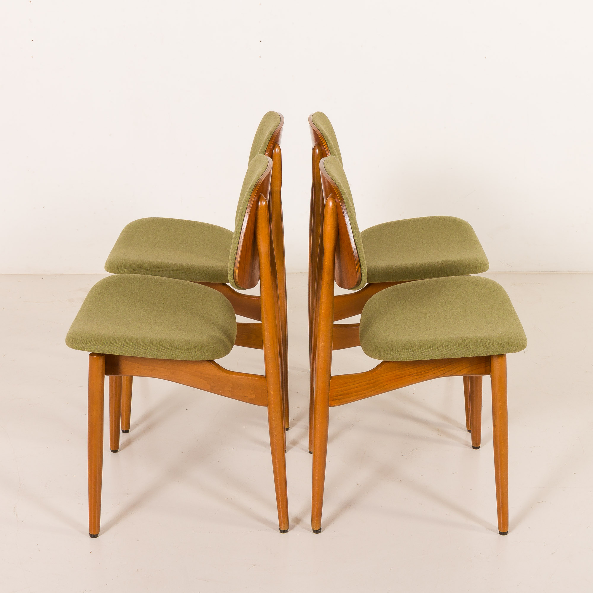 The veneered molded plywood backrests are ergonomically contoured. The seats have been newly upholstered in a soft, light-green wool fabric, offering a fresh, contemporary accent that complements the warmth of the wood.