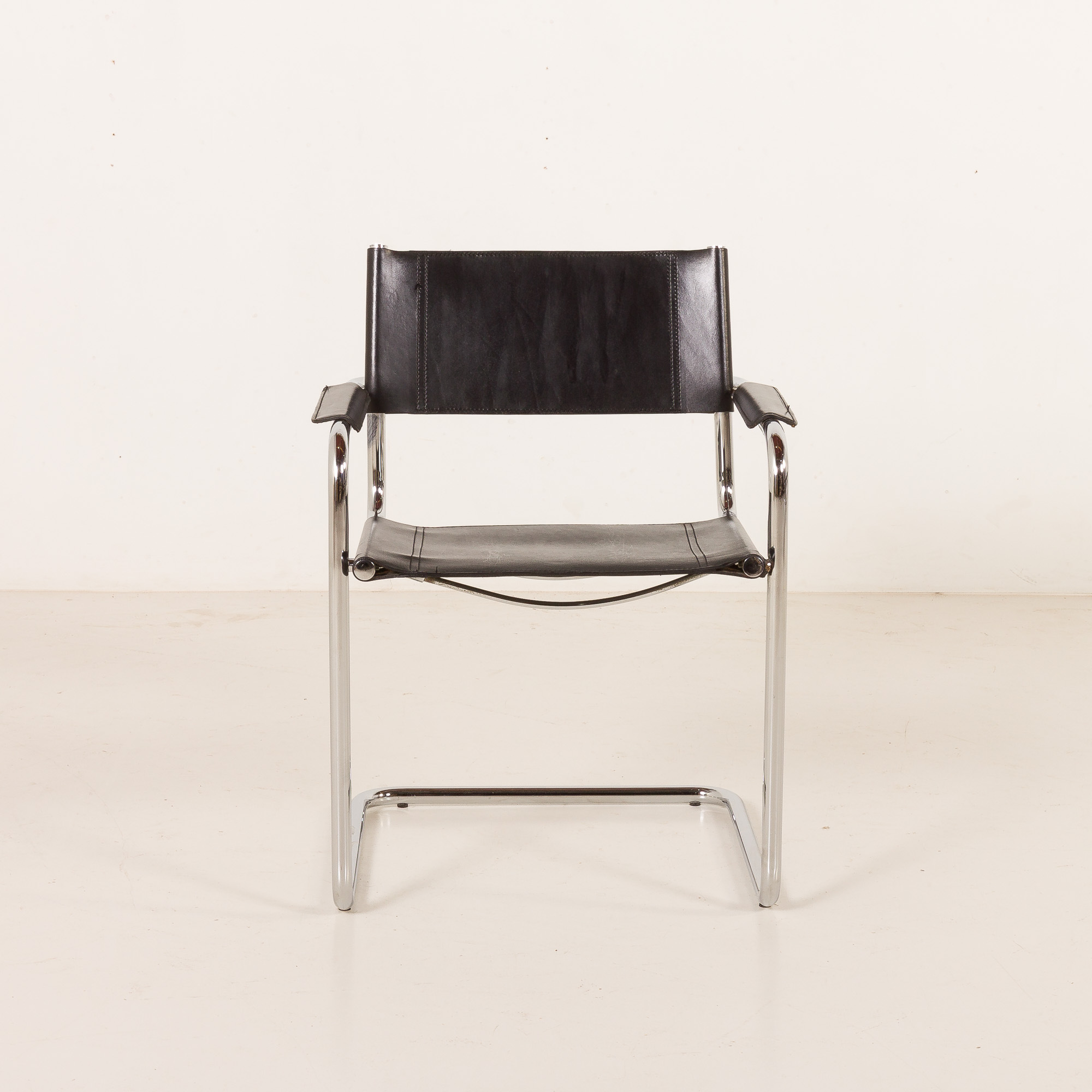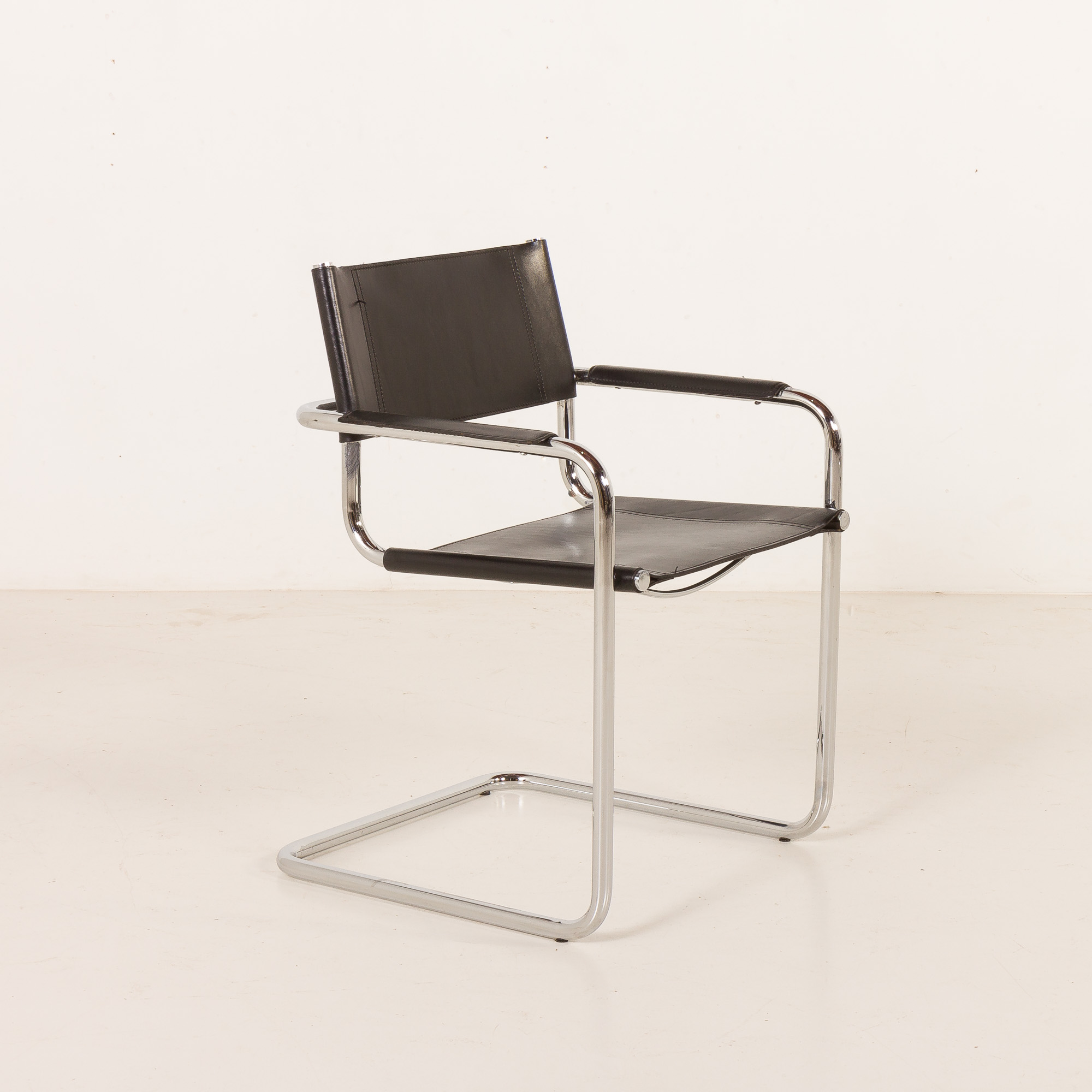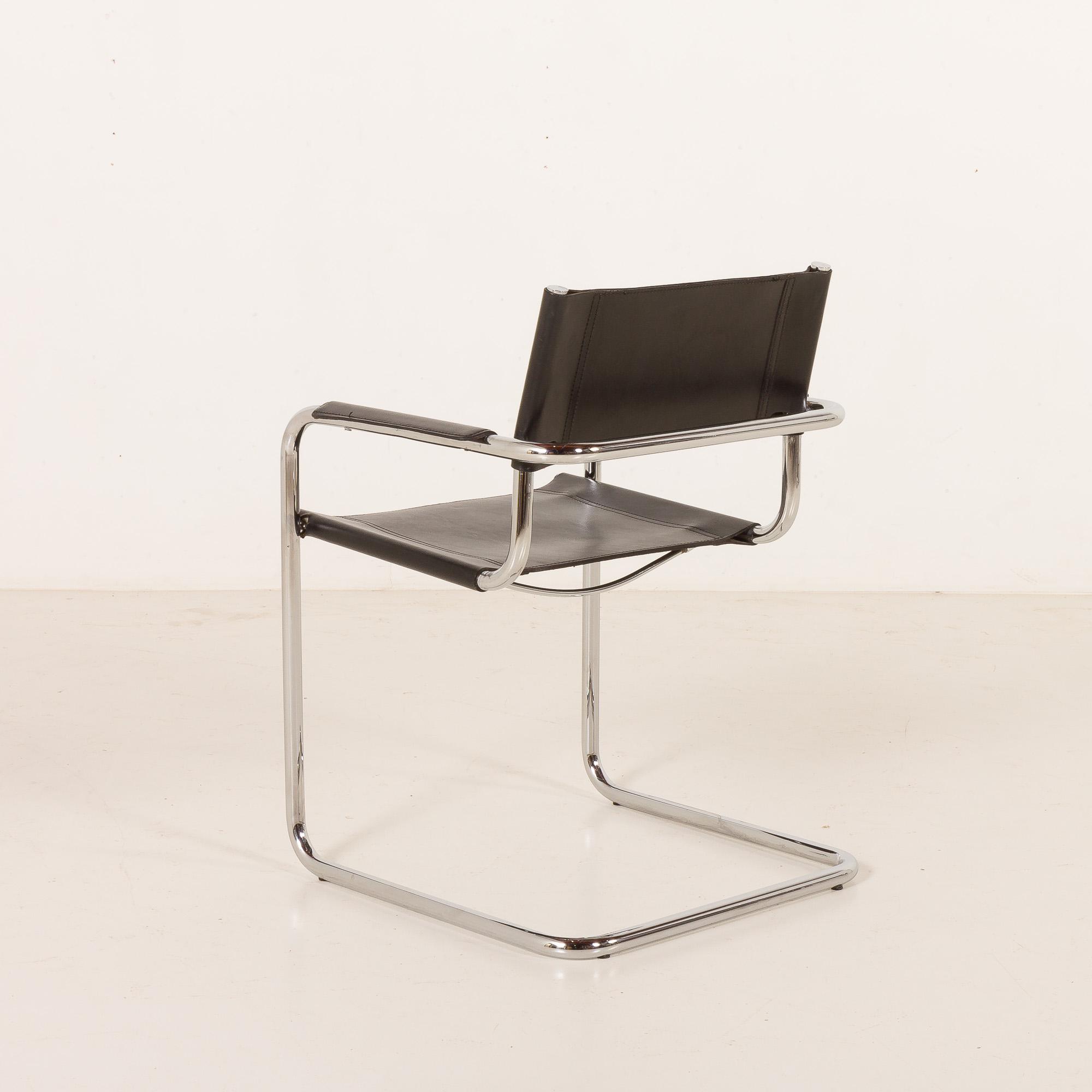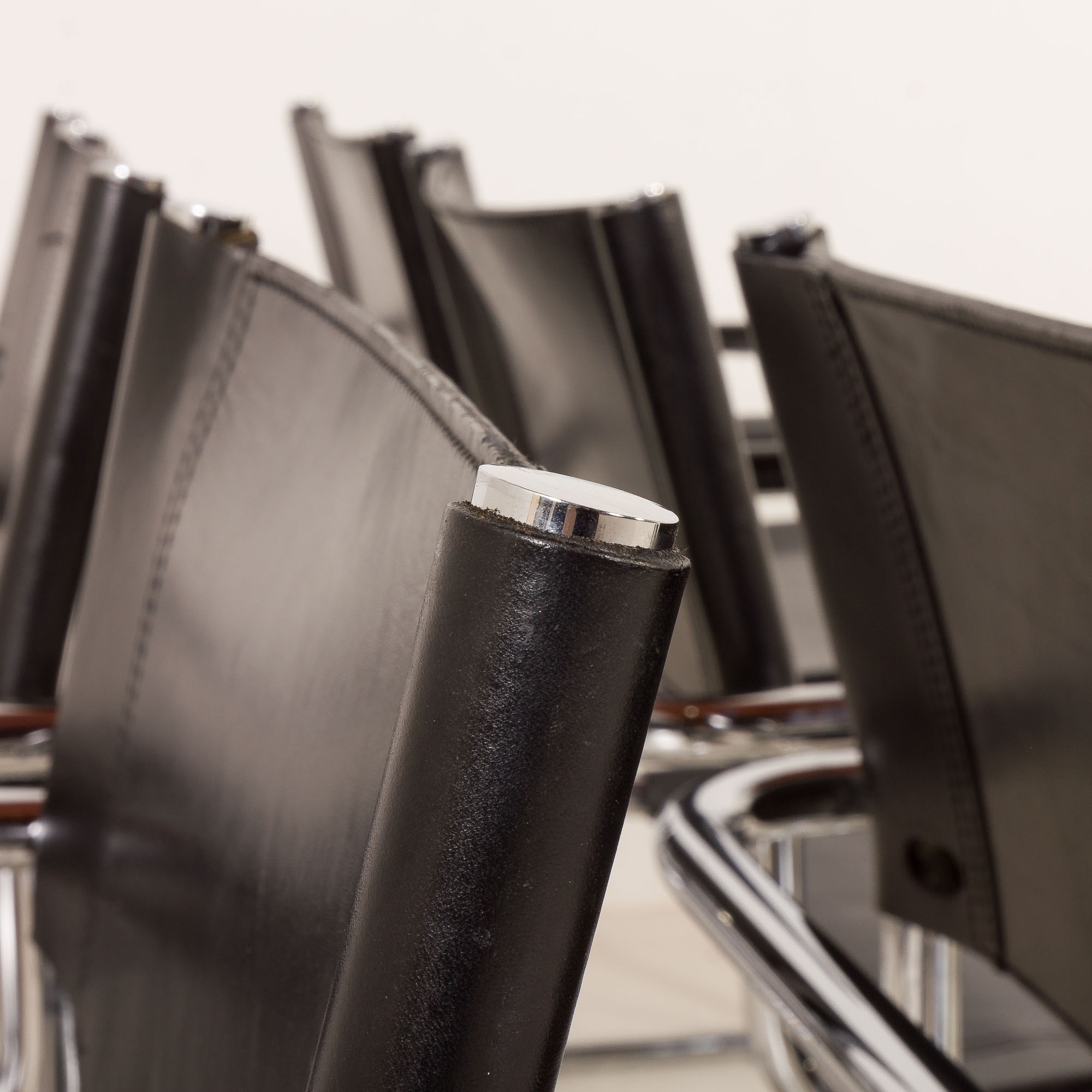 These Italian chairs from the 1970s have been manufactured most likely by Matteo Grassi and designed in iconic Bauhaus designer Mart Stam style. This is a revival of his S34 chair. The most striking feature of these chairs is very thick high quality black leather.