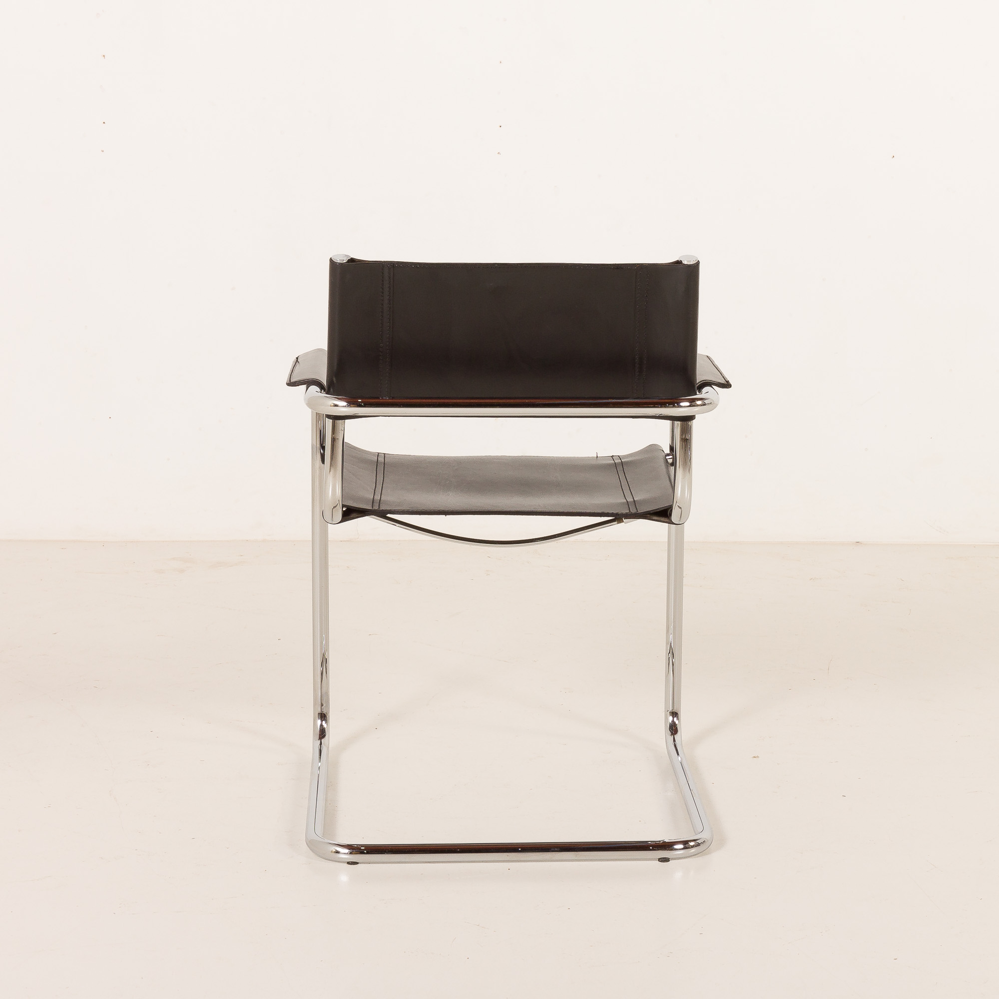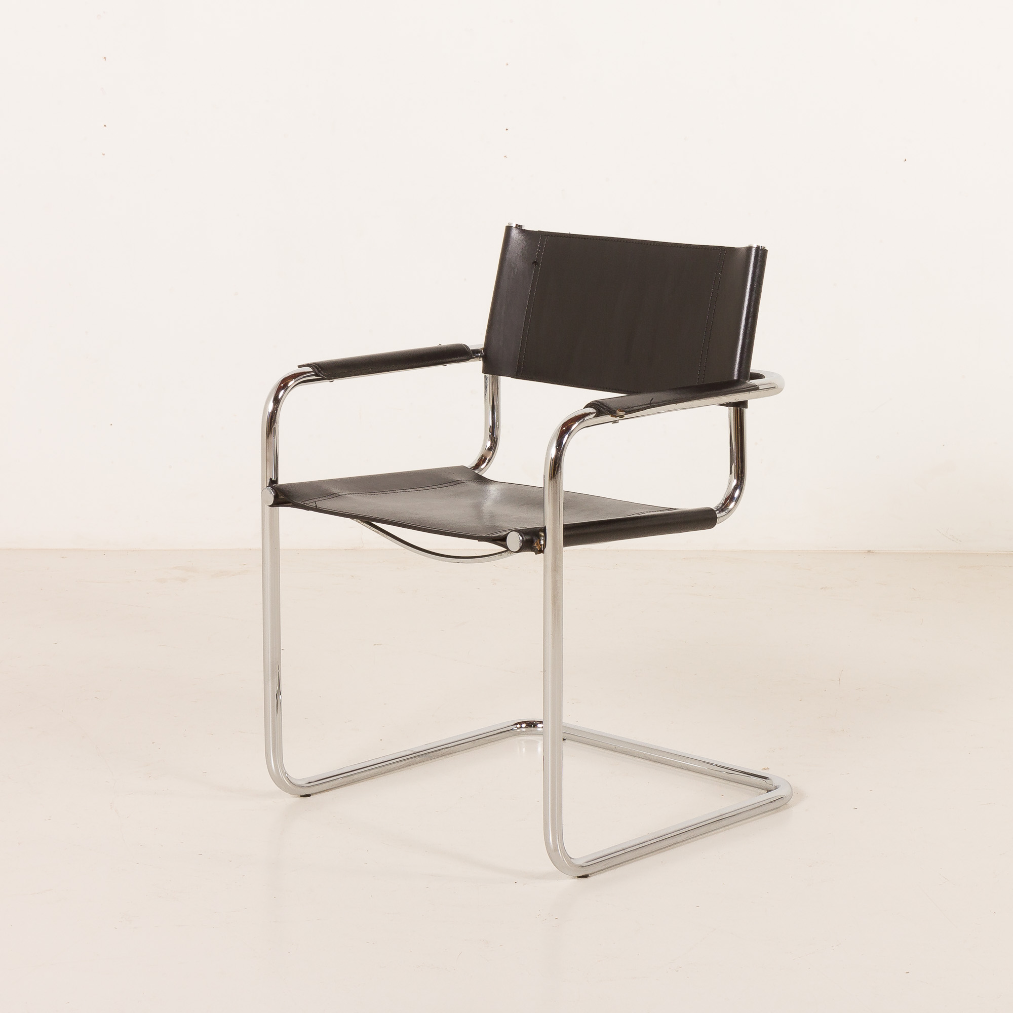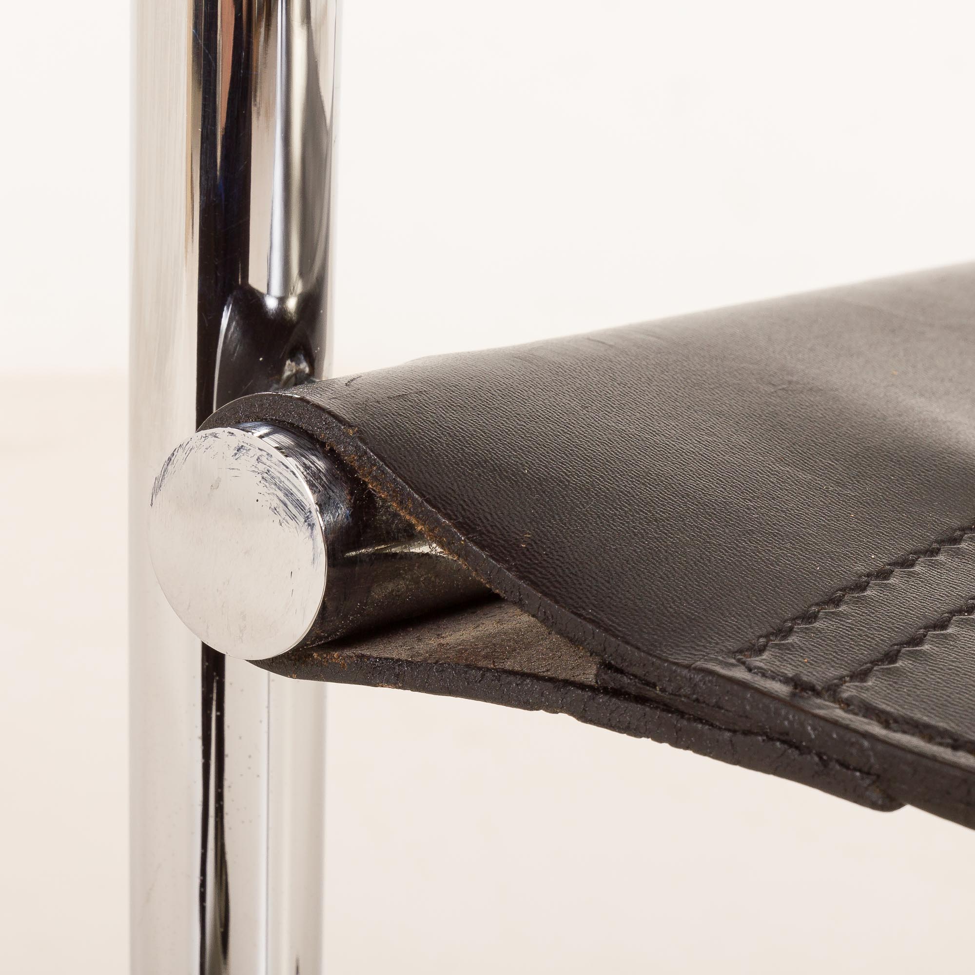 These Italian chairs from the 1970s have been manufactured most likely by Matteo Grassi and designed in iconic Bauhaus designer Mart Stam style. This is a revival of his S34 chair. The most striking feature of these chairs is very thick high quality black leather.