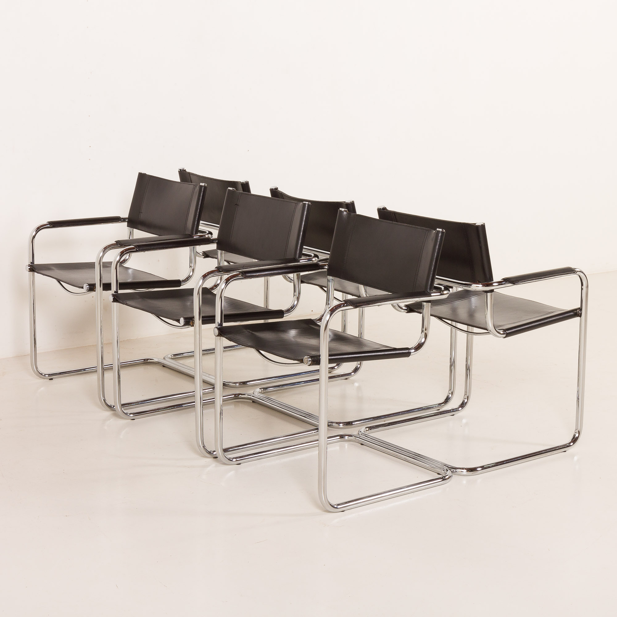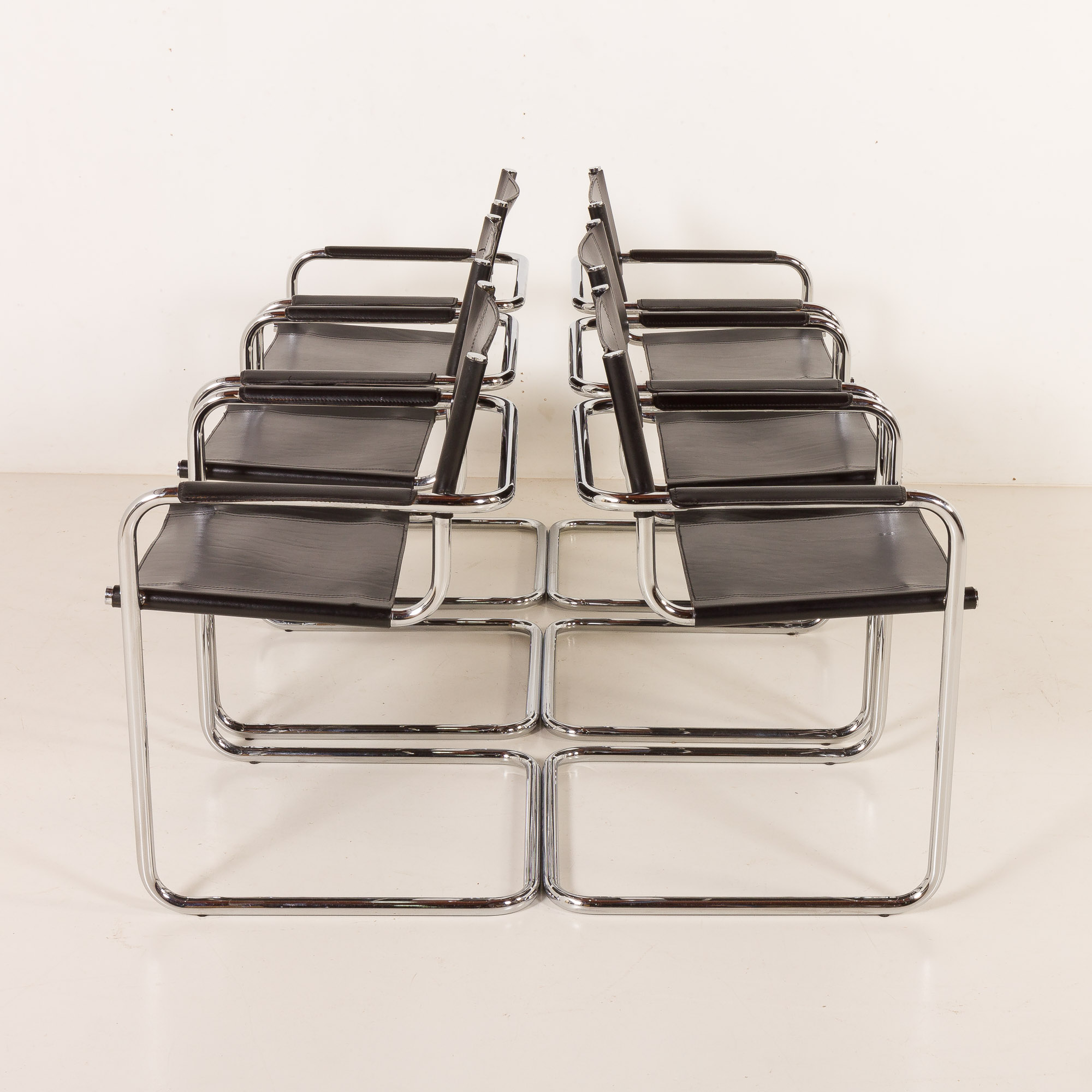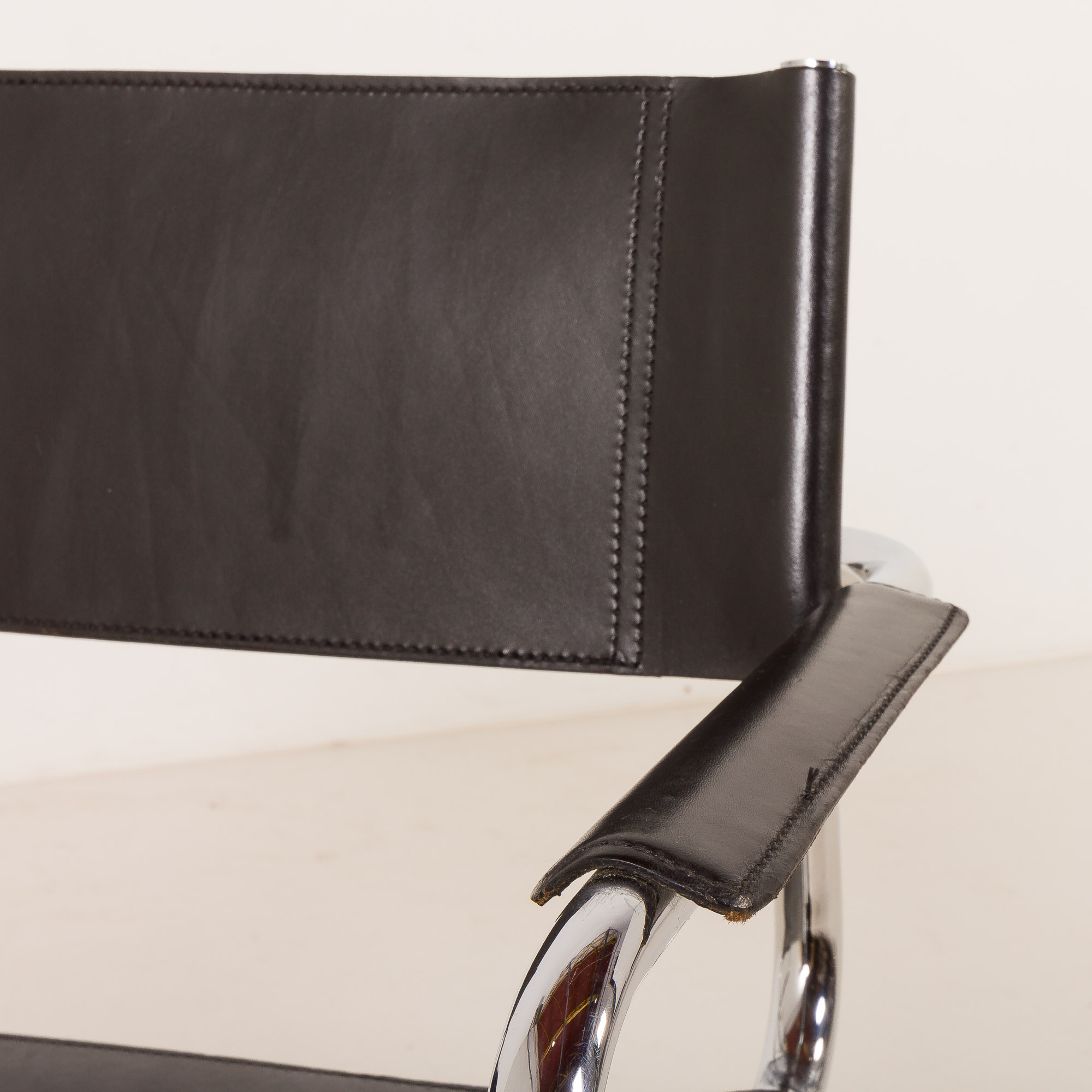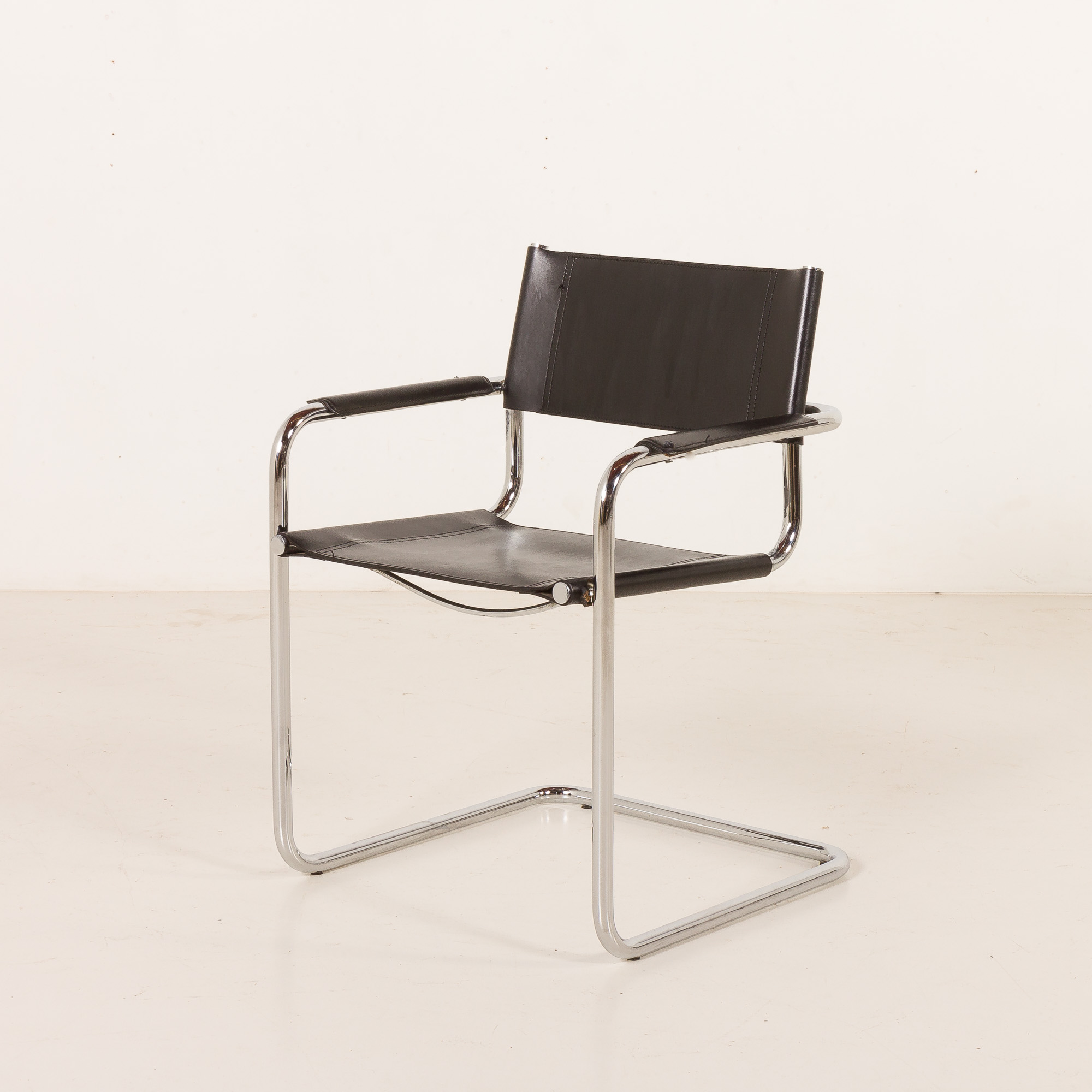 These Italian chairs from the 1970s have been manufactured most likely by Matteo Grassi and designed in iconic Bauhaus designer Mart Stam style. This is a revival of his S34 chair. The most striking feature of these chairs is very thick high quality black leather.