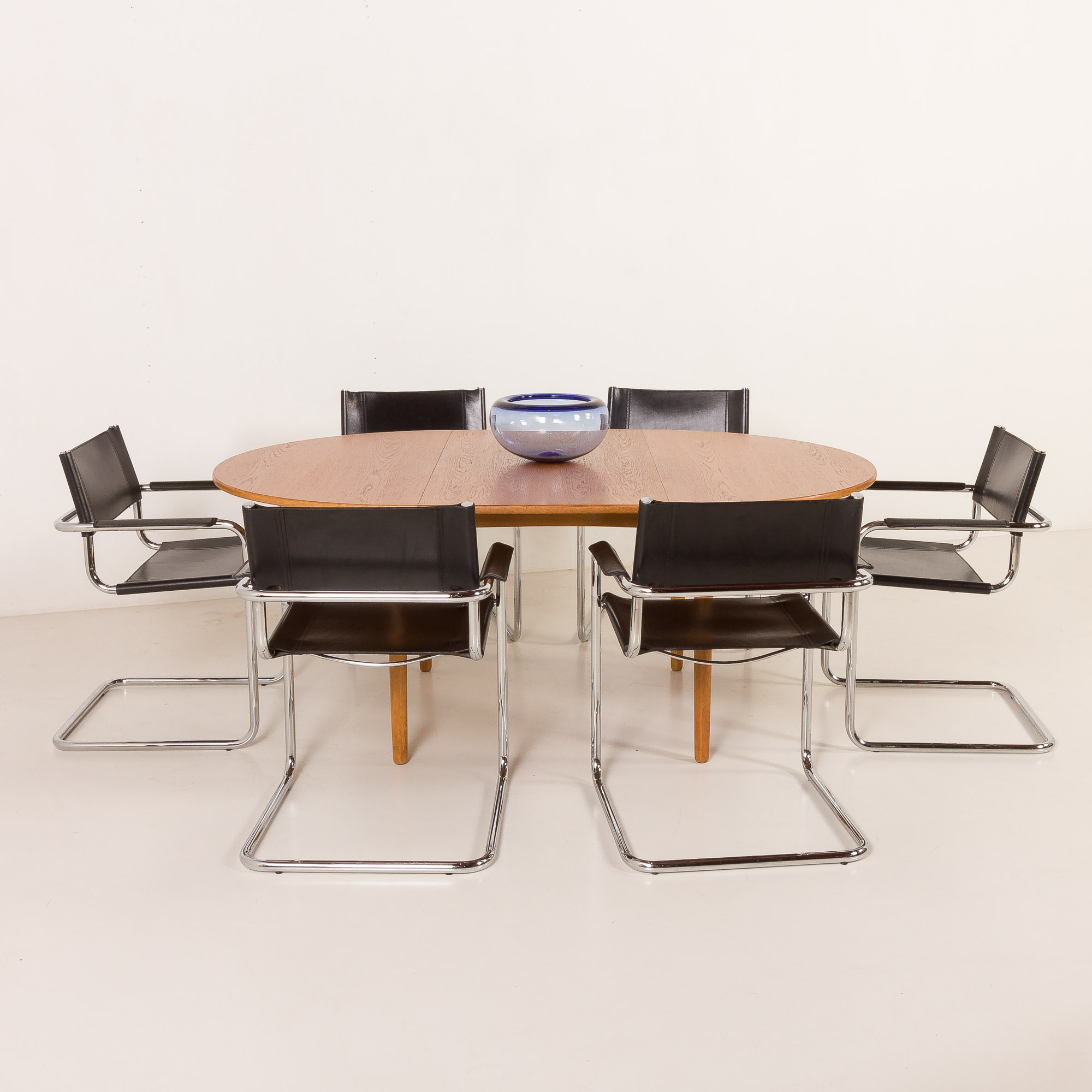 The design is characterized by a minimalist, architectural form. The chairs feature a tubular chromed steel frame (very high end metal work), which gives them industrial elegance typical of Bauhaus-inspired design. These chairs will work equally well in dining, office, or living interiors.