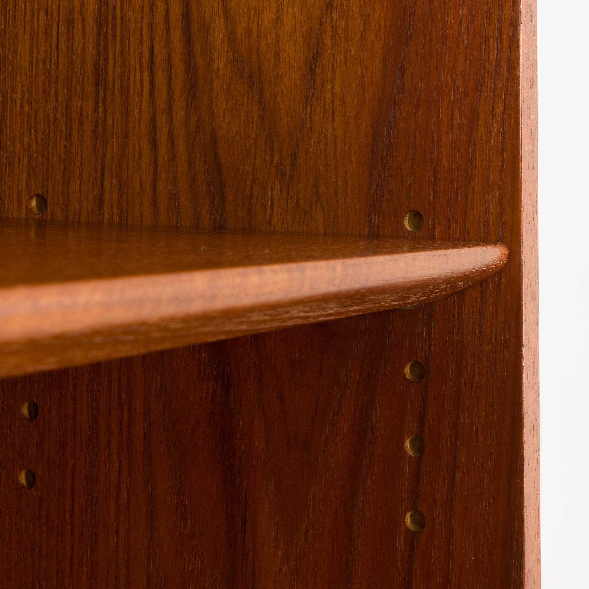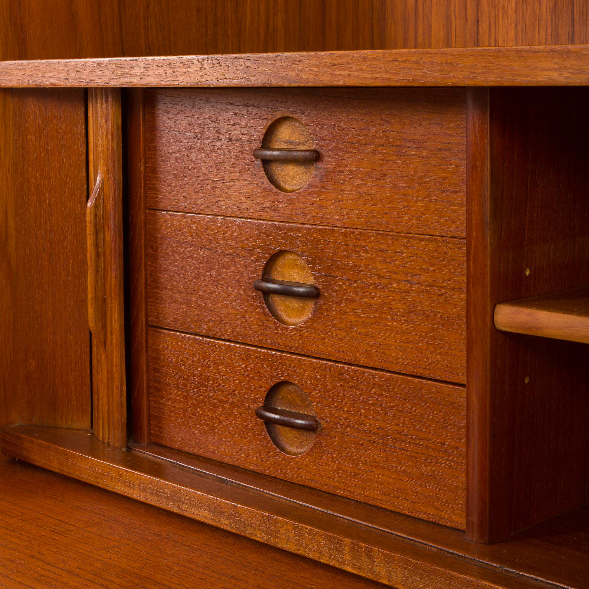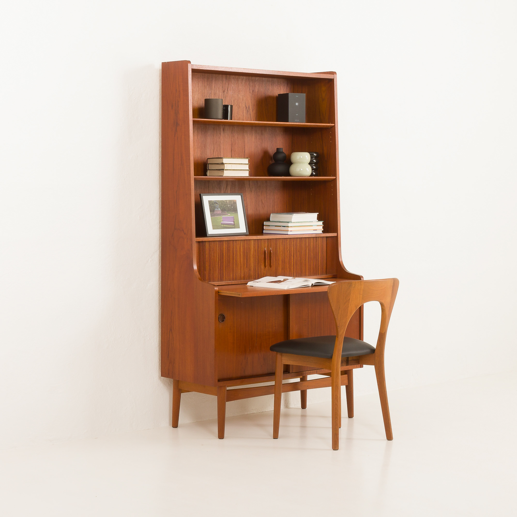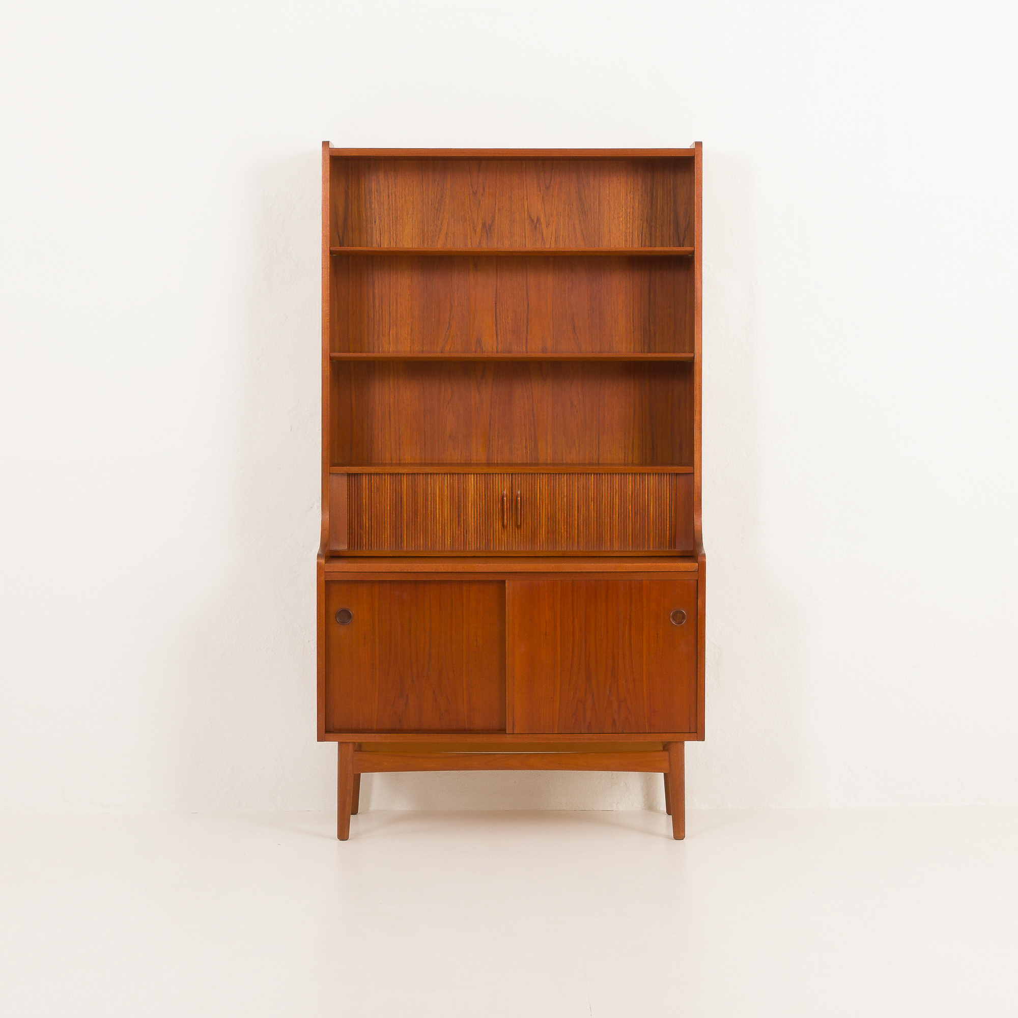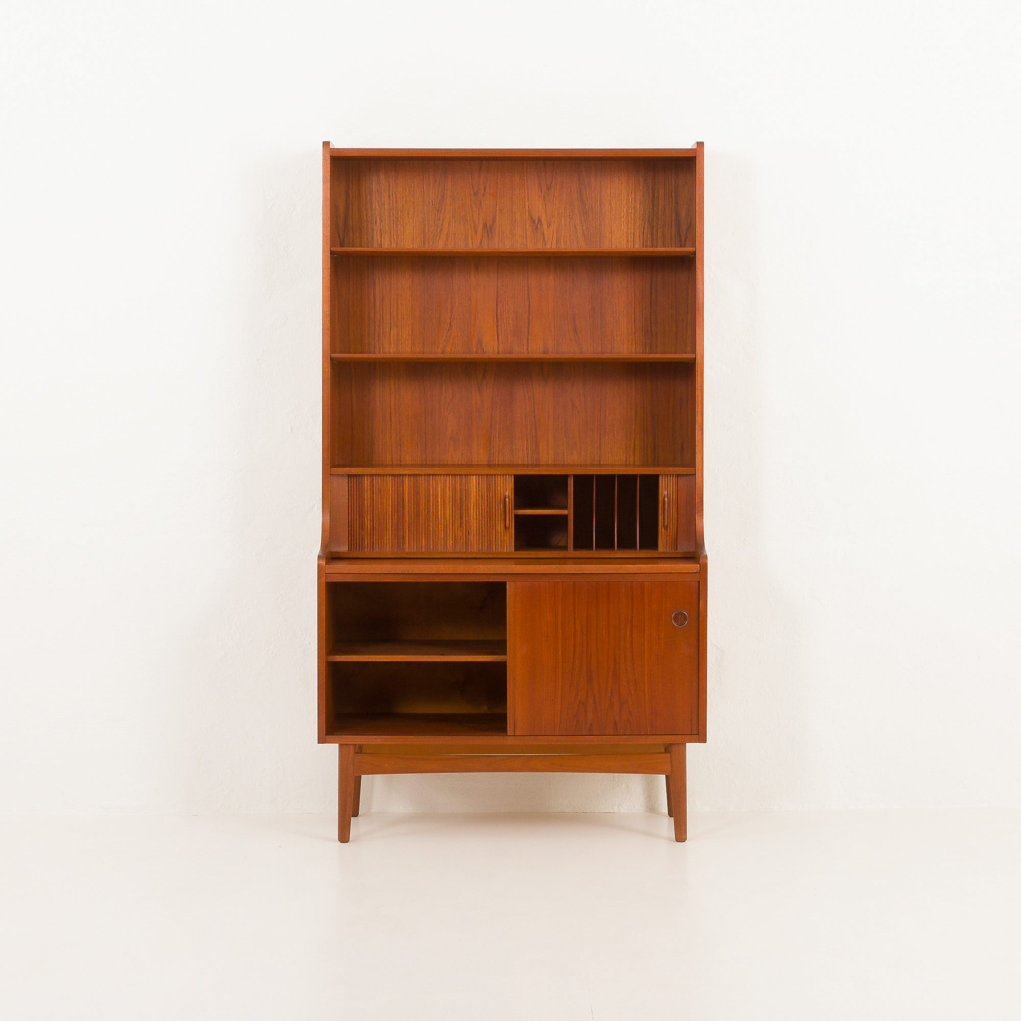The bookcase consists of two adjustable shelves, a spacious cabinet with sliding doors and an inner shelf, and a secretaire with several small compartments and three small drawers hidden behind tambour doors and a pull-out desk. This piece of furniture will create a discreet space for a home office while providing ample storage space for books or other items. Crafted from beautiful and durable teak wood, the bookcase features slightly rounded edges and a nicely carved base, adding lightness to the construction. All of these elements add a touch of warmth and intimacy to any interior.