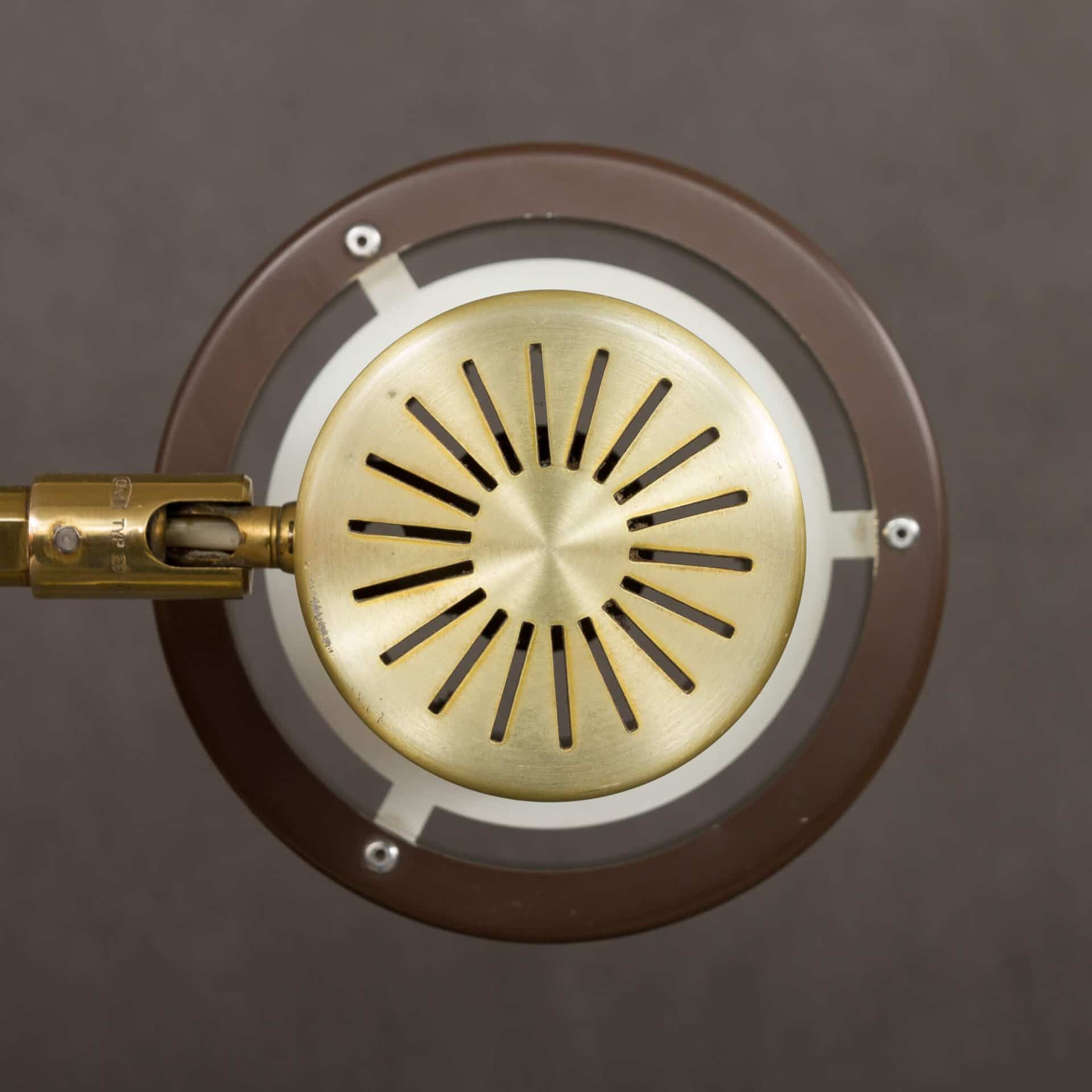 This brass and brown version of the Studio floor lamp was designed by Jo Hammerborg for Fog & Mørup. Very rare Danish vintage design from the early 1960s. A moderate height floor lamp, highly flexible, the shade can be adjusted up and down and sideways. In very good original condition surface has been polished.