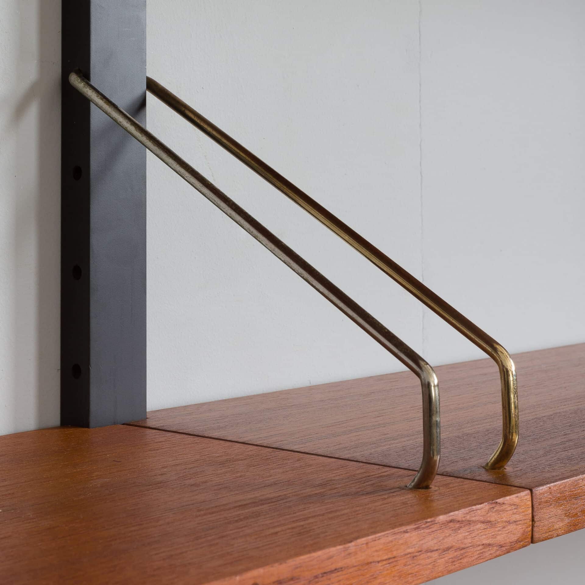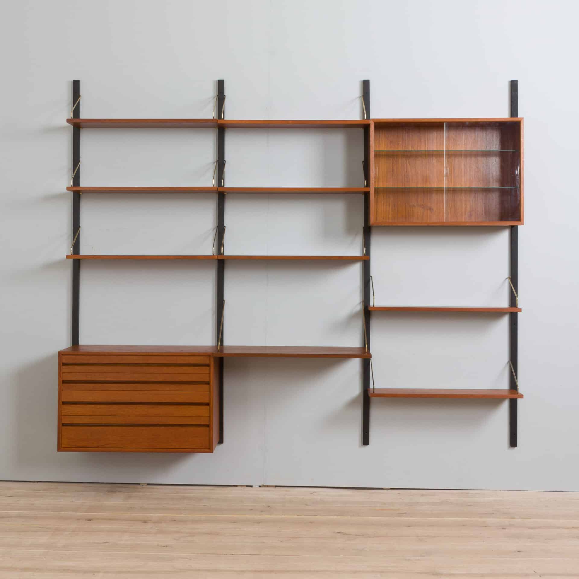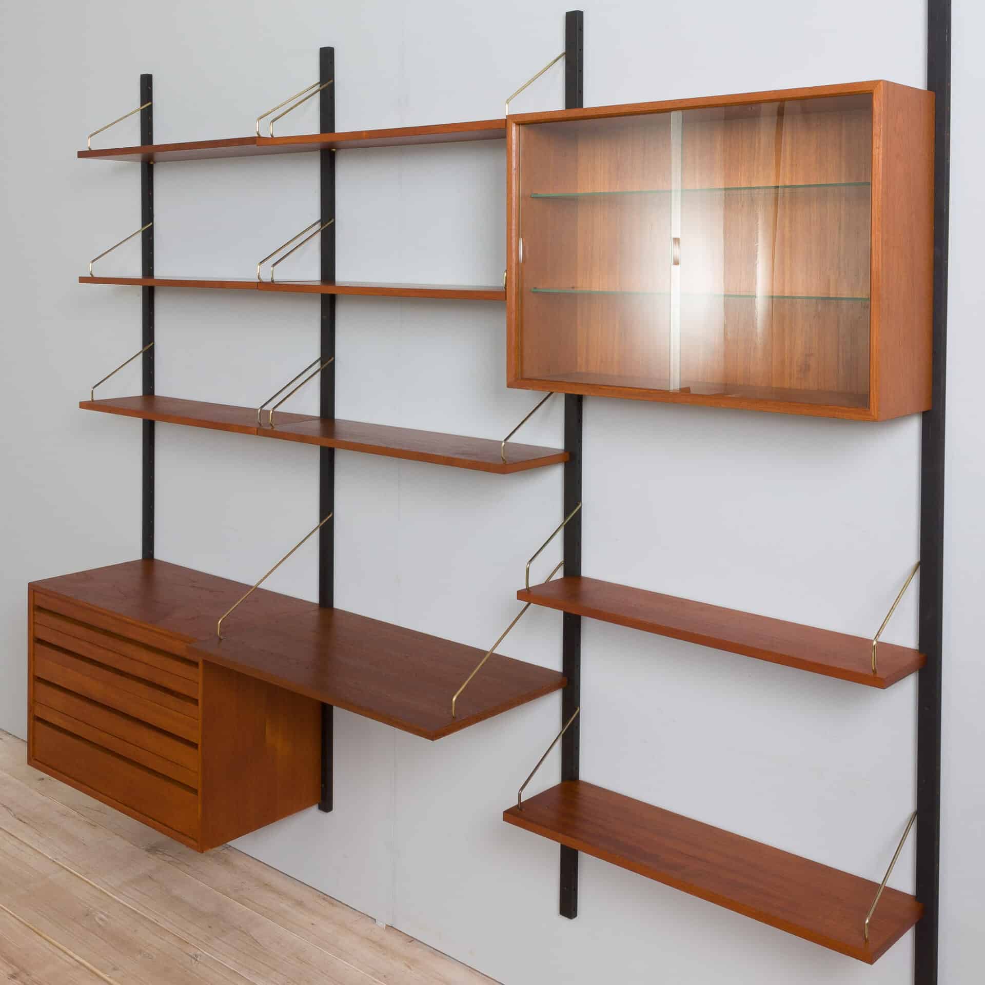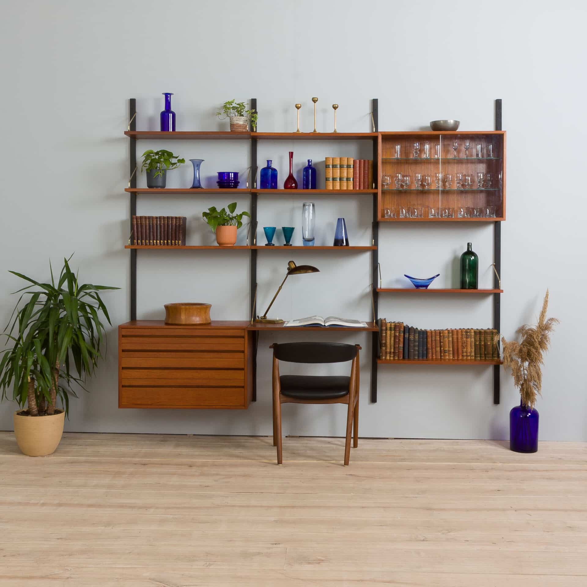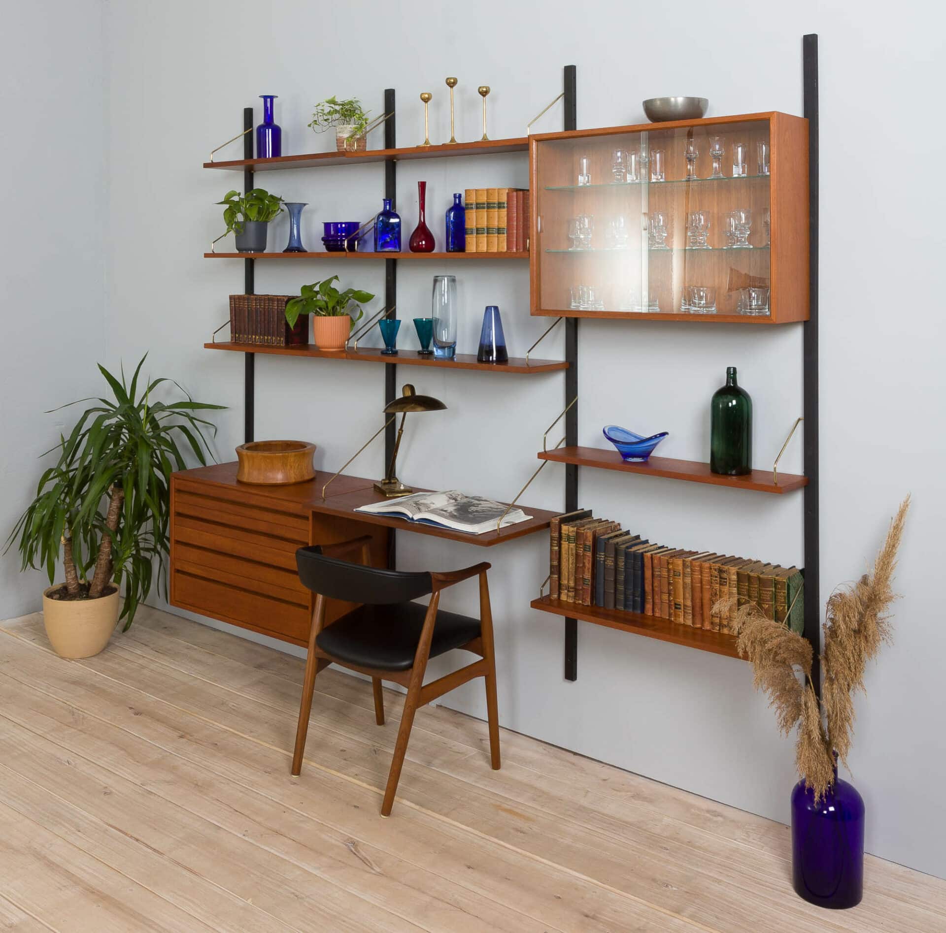 Danish modern teak 3-bay wall unit by Poul Cadovius made from the 1960s. It is fully modular shelving system with interchangeable parts that can be arranged as one needs. A comfortable desk, 8 shelves and two cabinets will create a perfect space for a home office and exposing a lot of books and decorations.