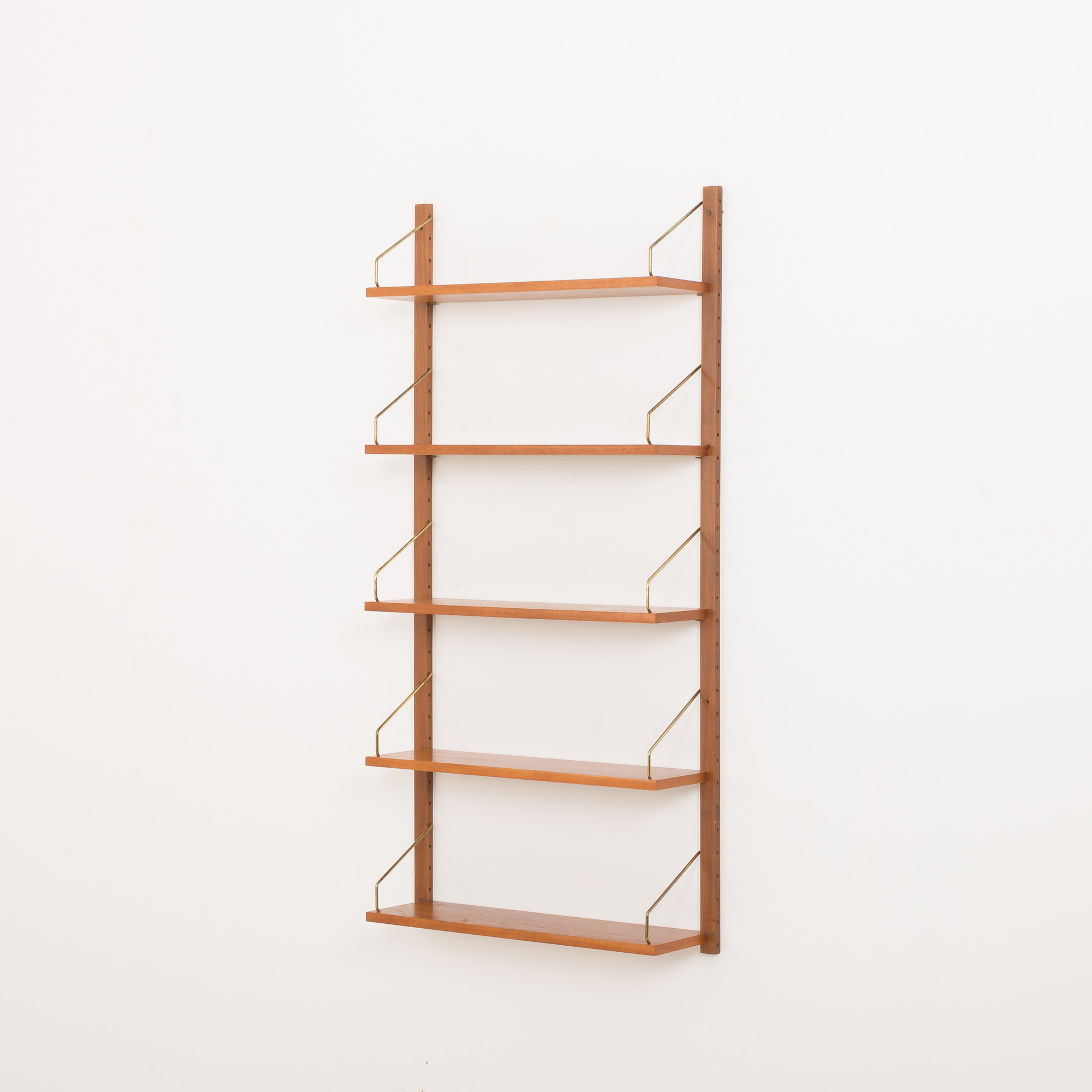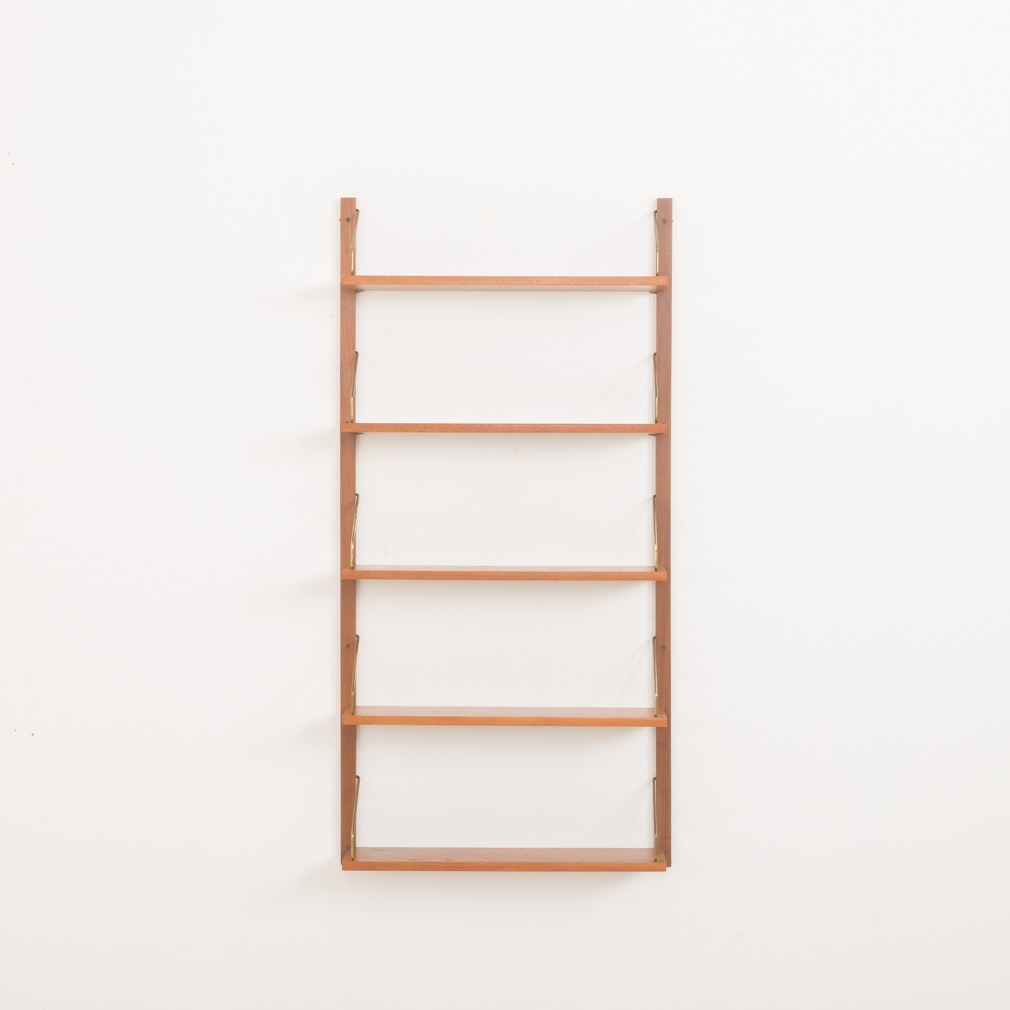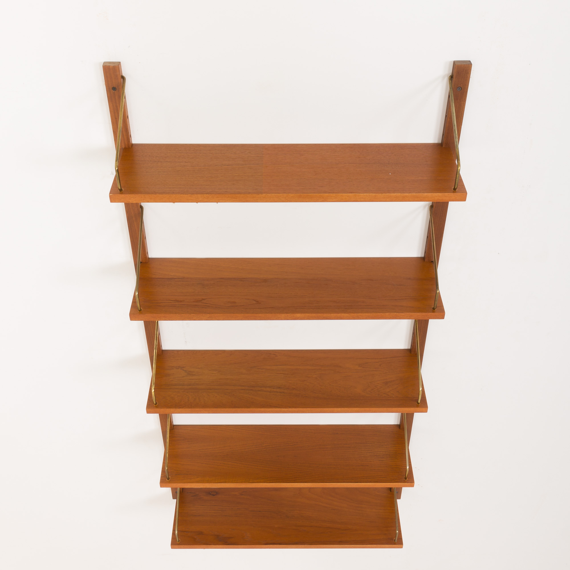 This Danish wall unit is an entirely modular with five shelves in teak veneer hanging on by brass hangers on solid wood rails. Since all shelves are 70 cm wide they can be moved lower, higher, and interchanged. It can be arranged upon one’s will. Moreover, there is an original manufacturer’s ingraving ” Made in Denmark ” on the back side of each shelf. This vintage wall unit will work well in the office as well as the living room or bedroom.