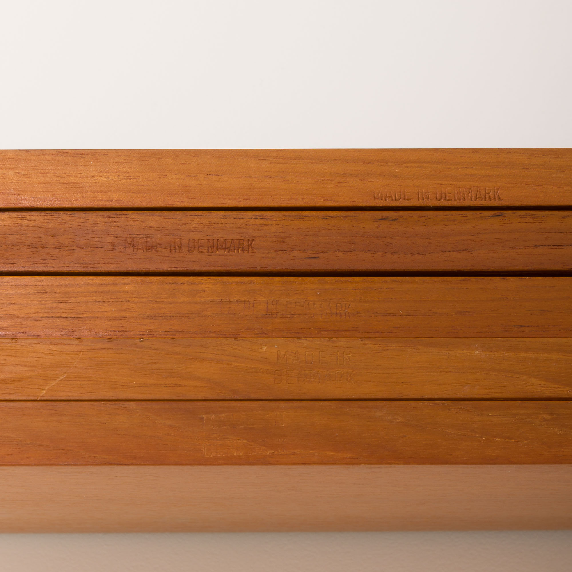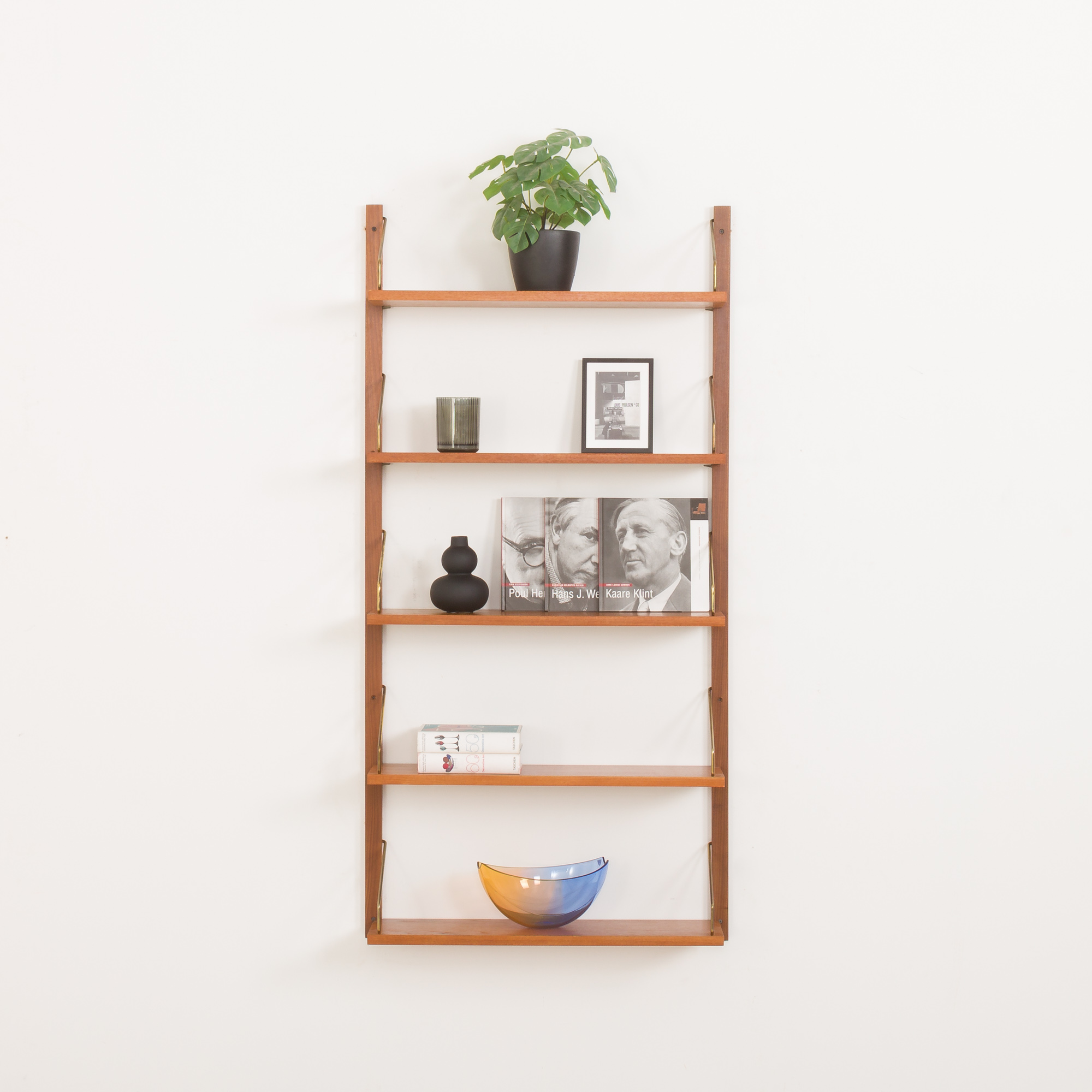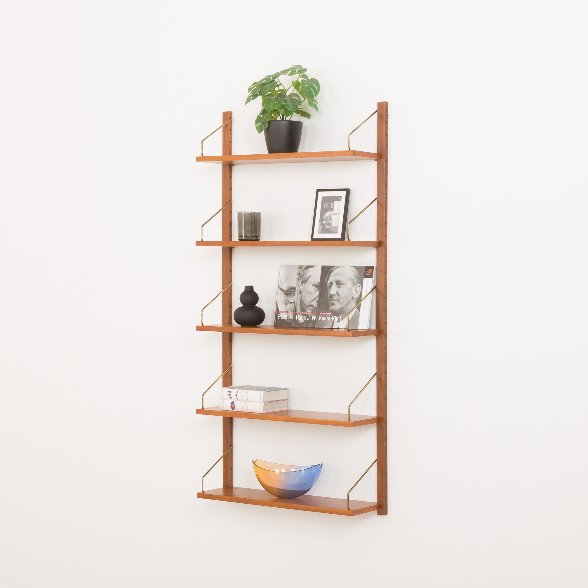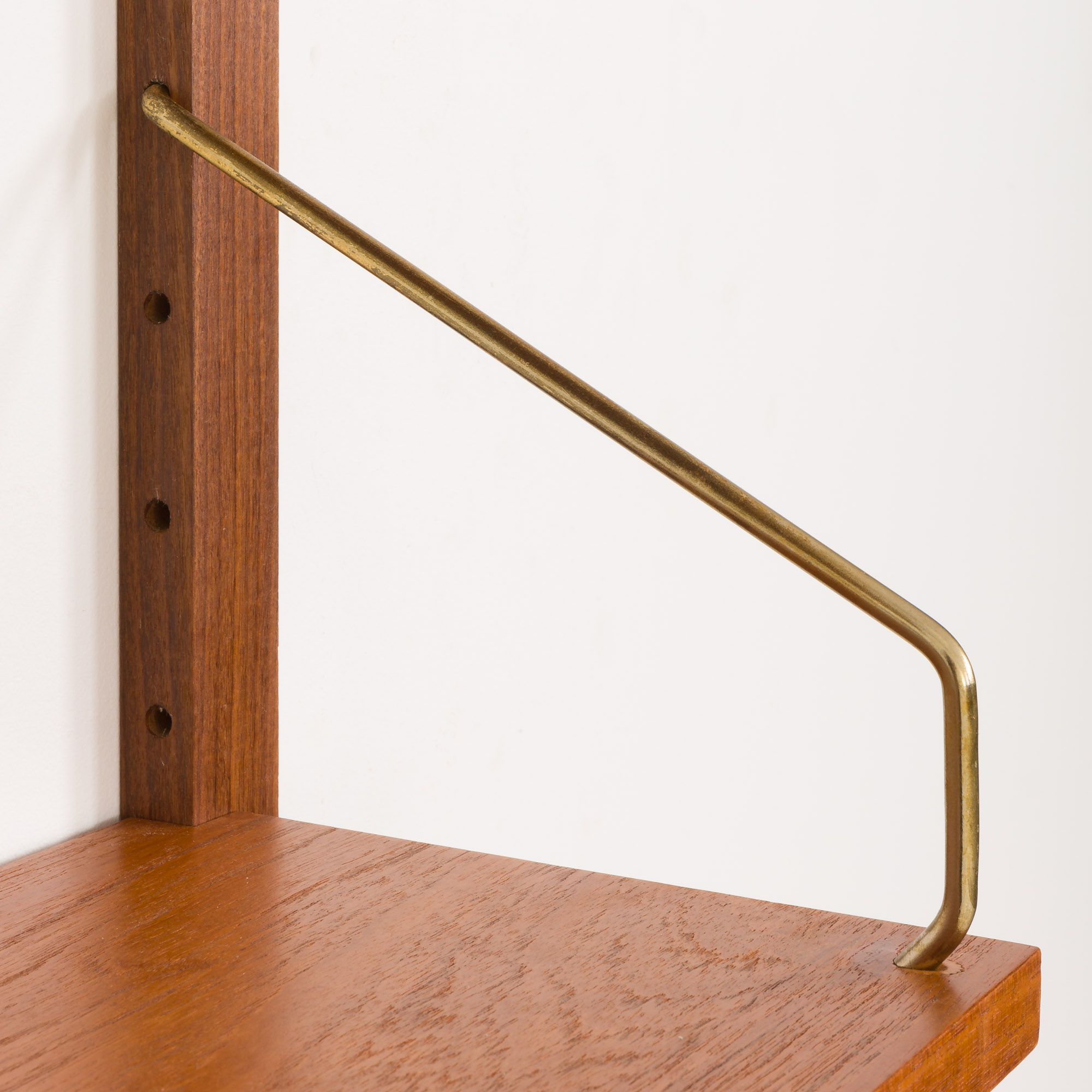 This Danish wall unit is an entirely modular with five shelves in teak veneer hanging on by brass hangers on solid wood rails. Since all shelves are 70 cm wide they can be moved lower, higher, and interchanged. It can be arranged upon one’s will. Moreover, there is an original manufacturer’s ingraving ” Made in Denmark ” on the back side of each shelf. This vintage wall unit will work well in the office as well as the living room or bedroom.