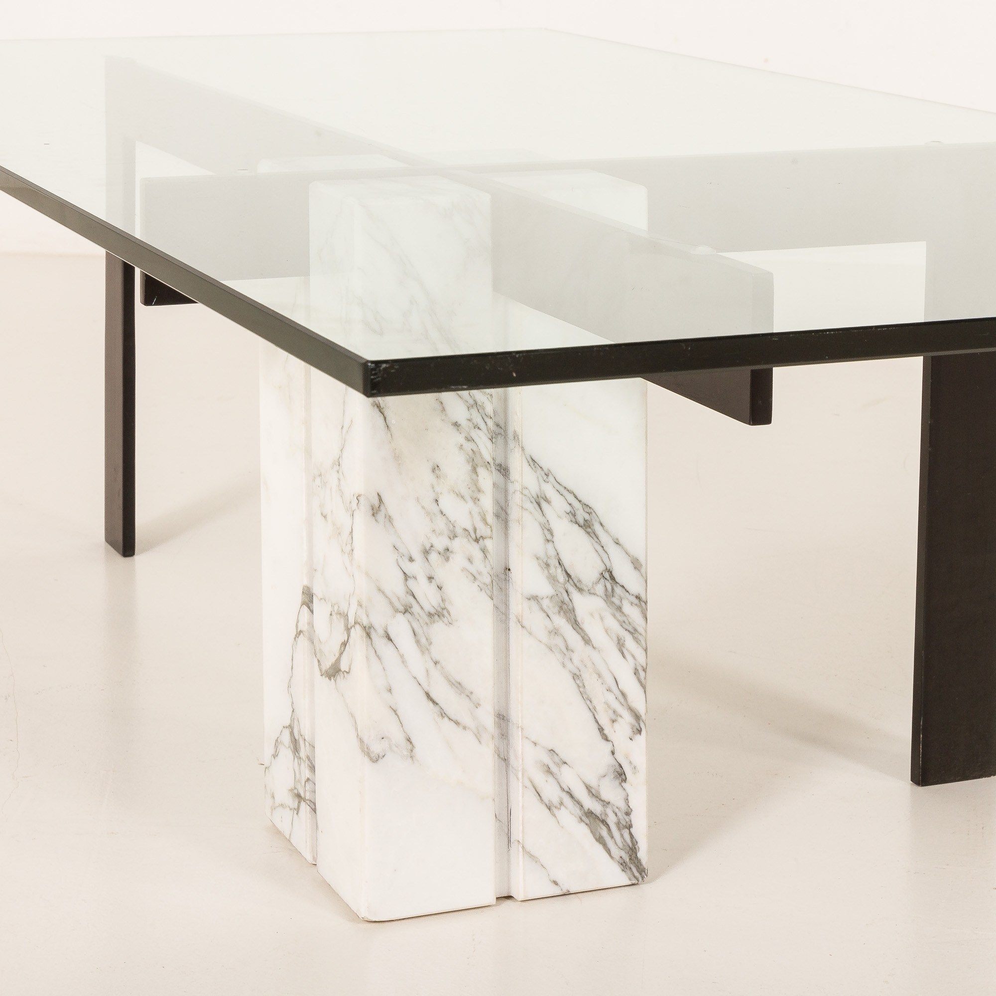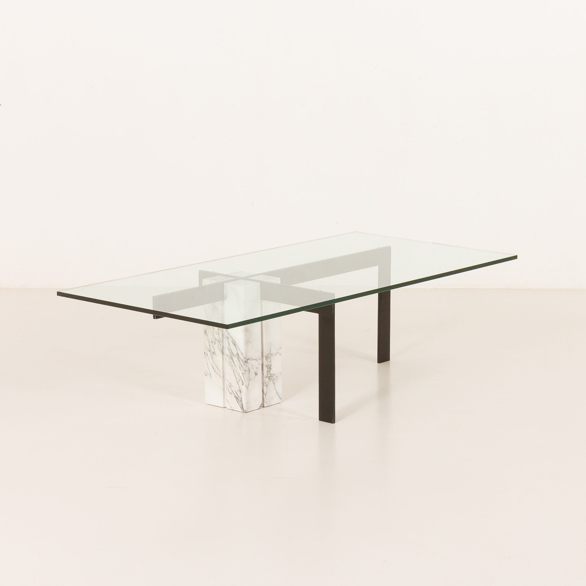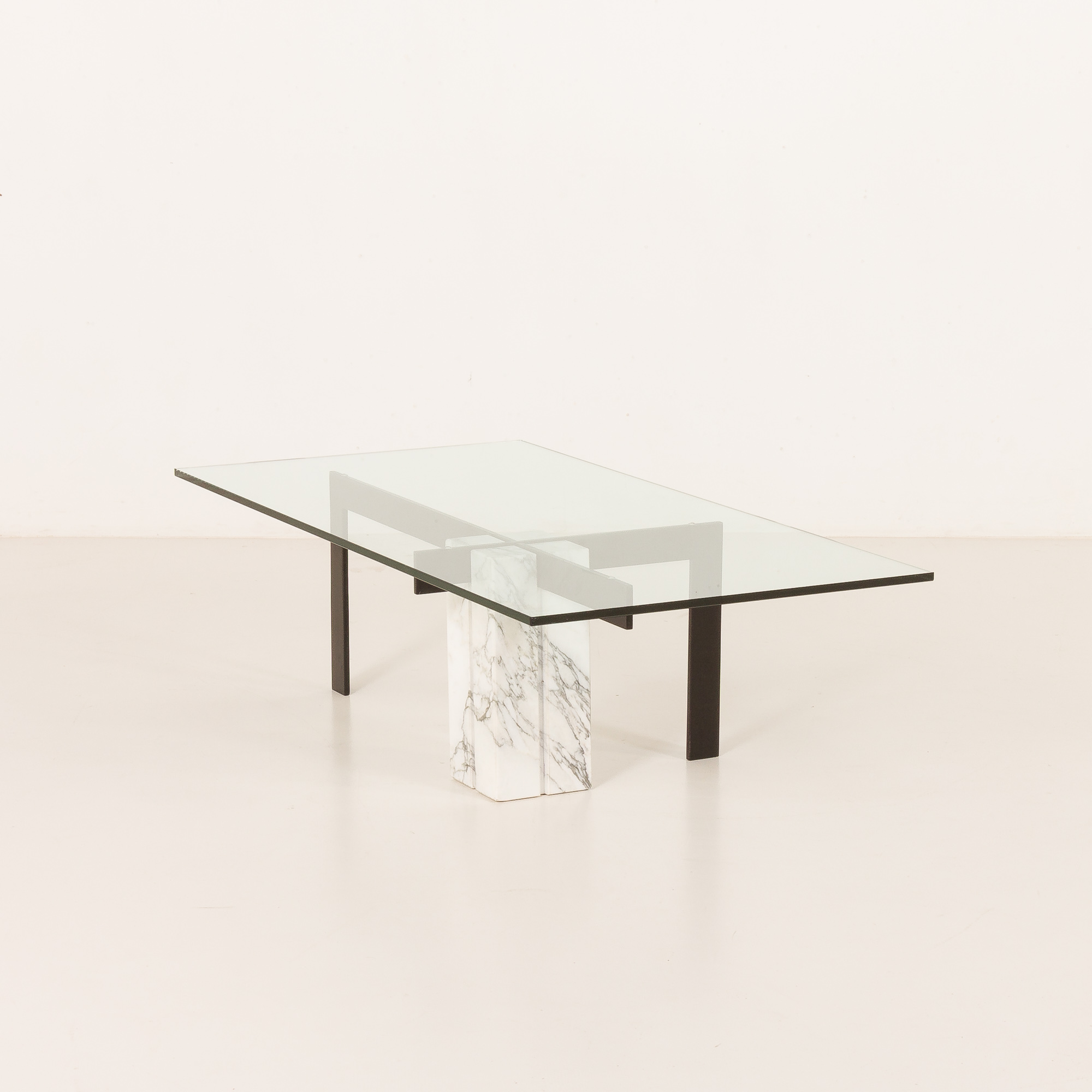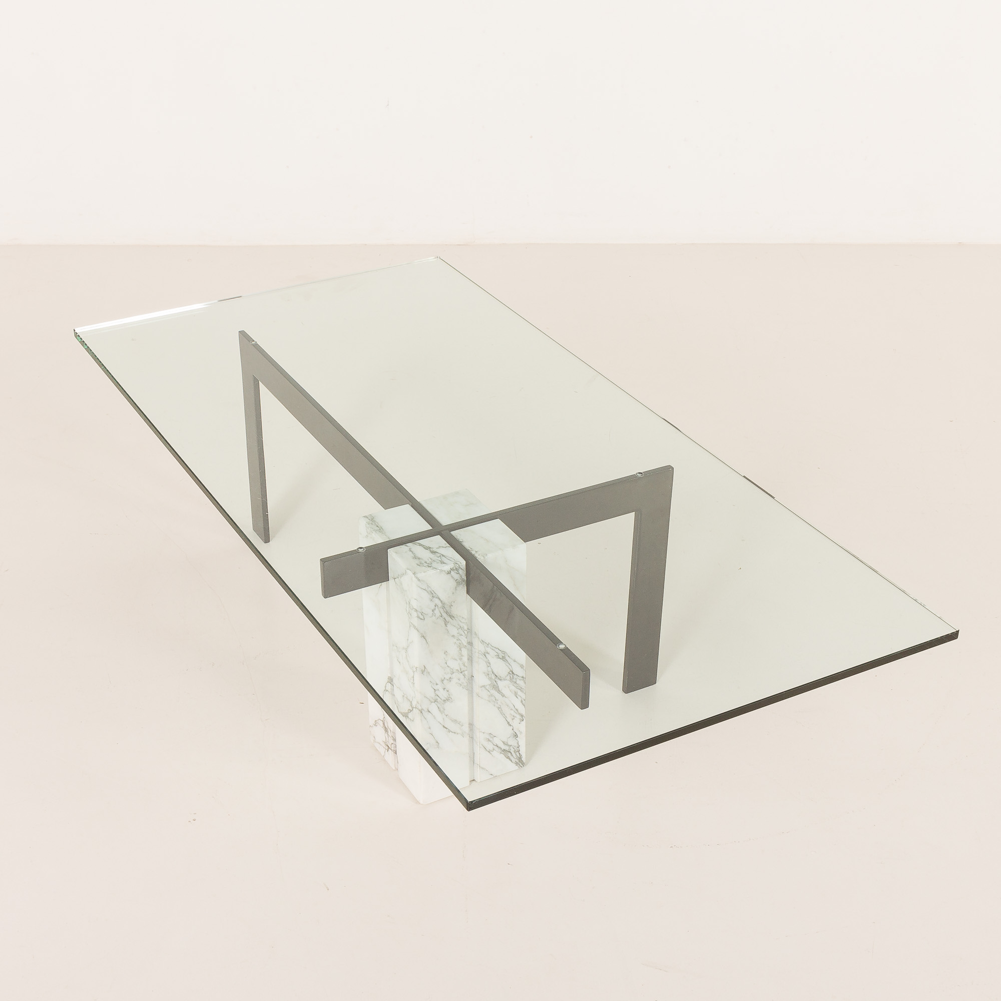The table features an unconventional central base crafted from Carrara marble, which is paired with a black metal supporting structure, creating a sophisticated interplay between natural stone and industrial material. The composition is completed by a thick, rectangular glass top that enhances the table’s lightness while allowing the sculptural base to remain fully visible. This table works beautifully as a statement centerpiece in both modern and vintage-inspired interiors.
