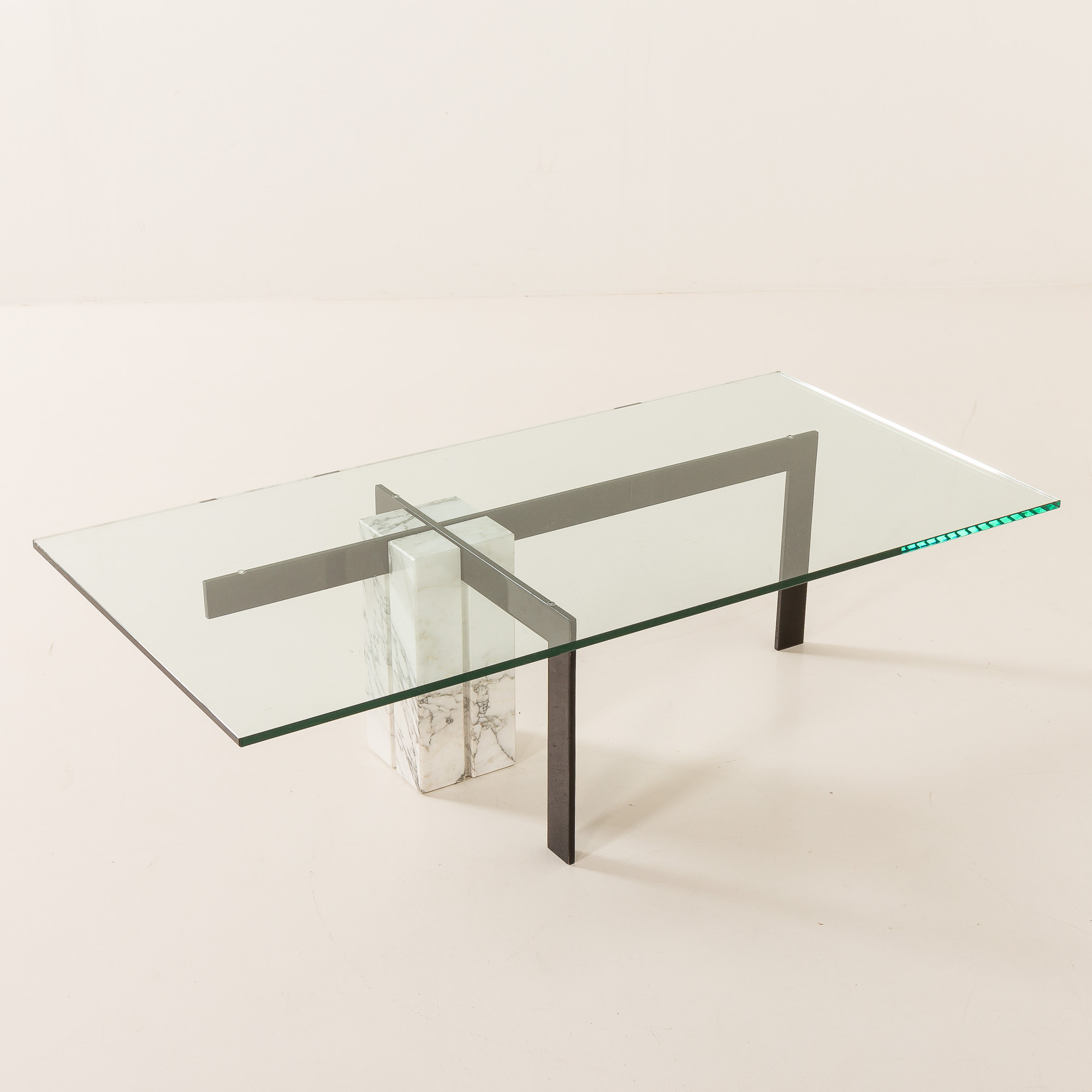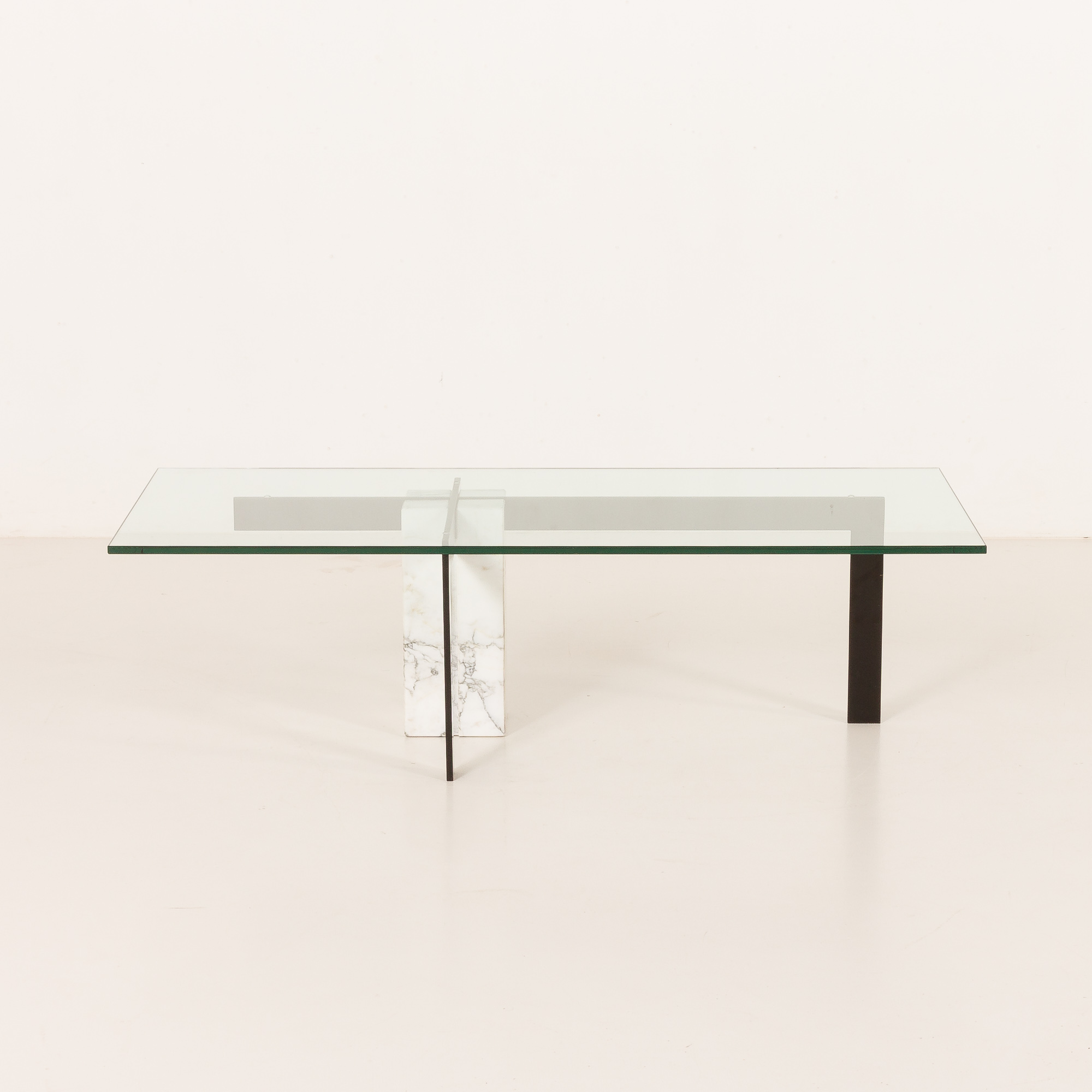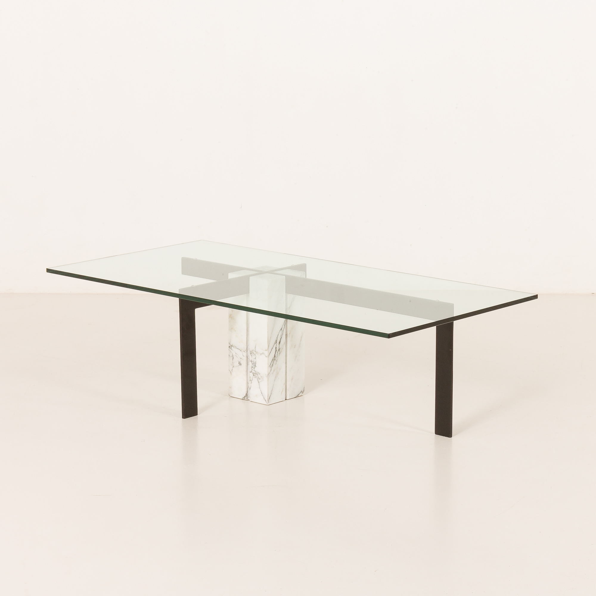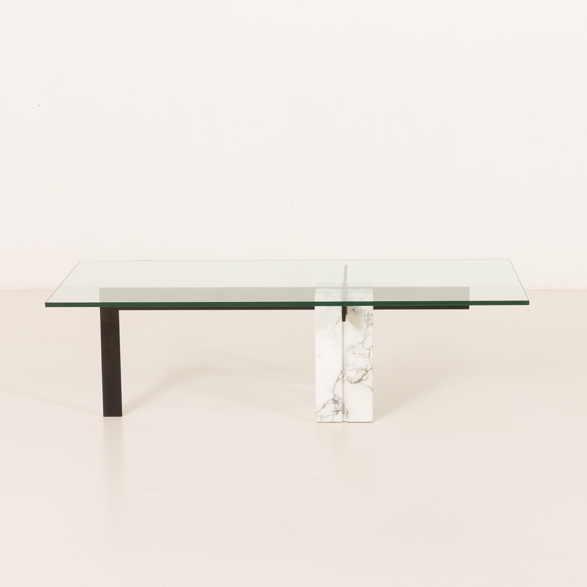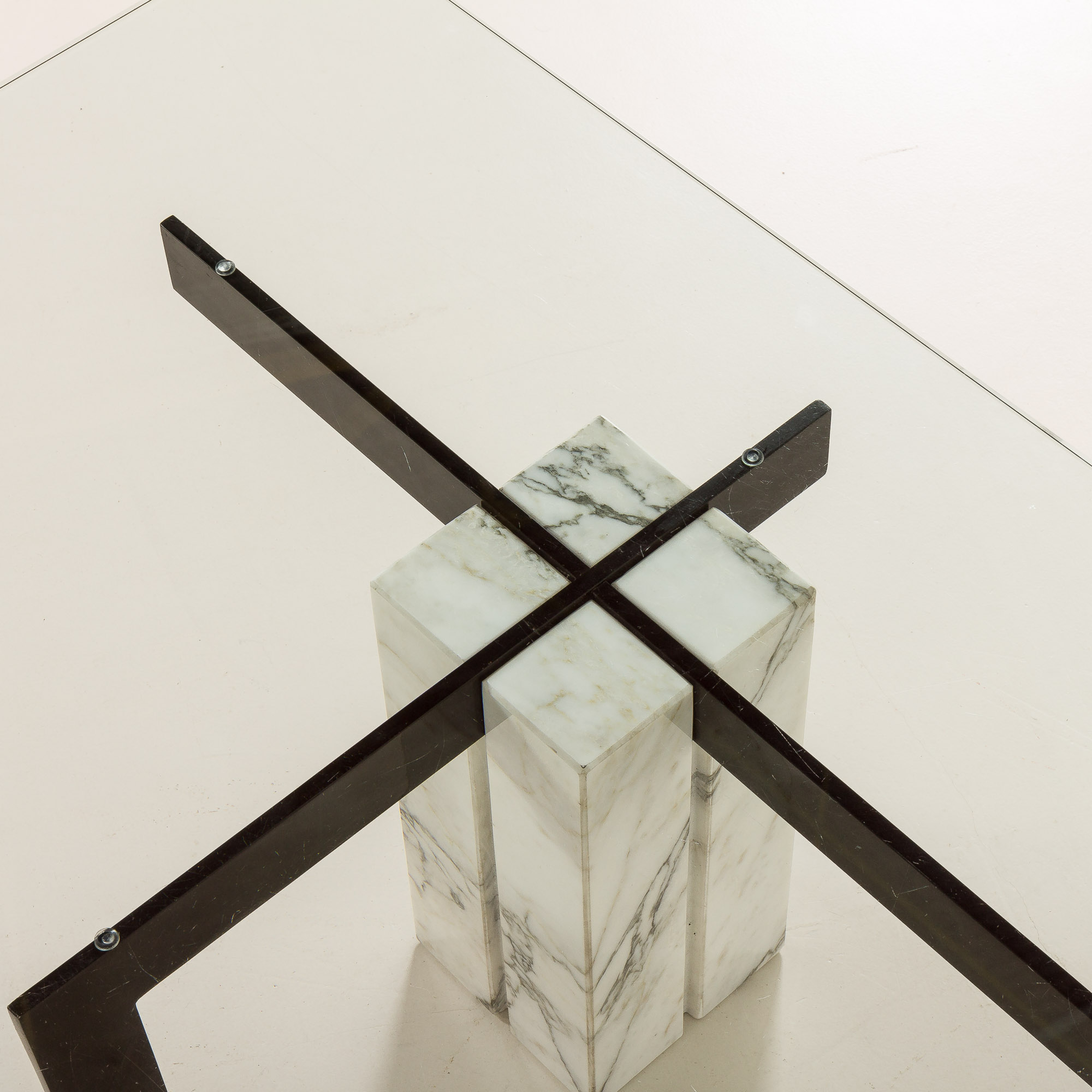 The table features an unconventional central base crafted from Carrara marble, which is paired with a black metal supporting structure, creating a sophisticated interplay between natural stone and industrial material. The composition is completed by a thick, rectangular glass top that enhances the table’s lightness while allowing the sculptural base to remain fully visible. This table works beautifully as a statement centerpiece in both modern and vintage-inspired interiors.