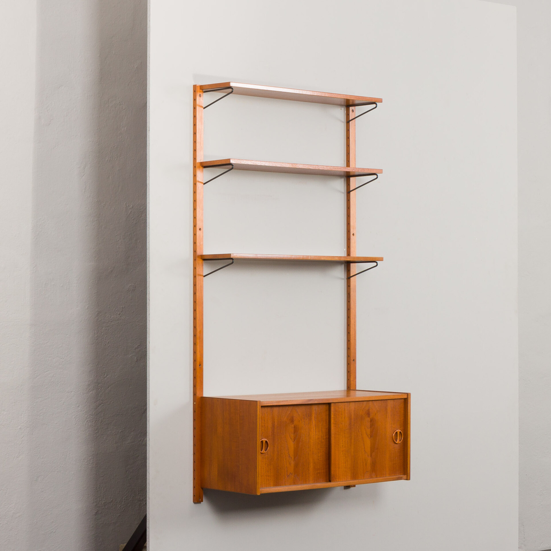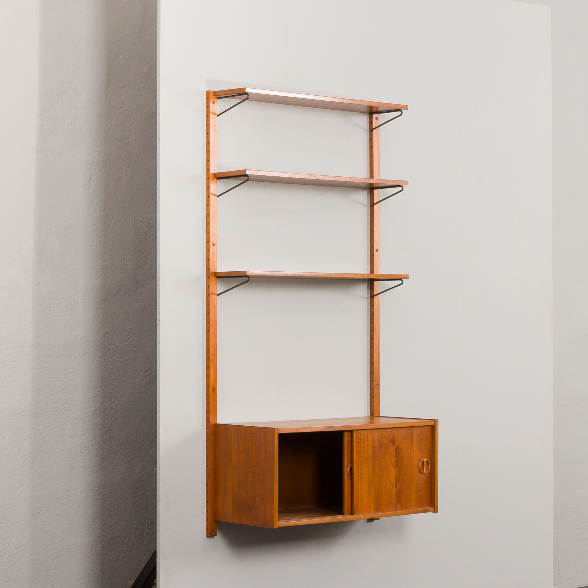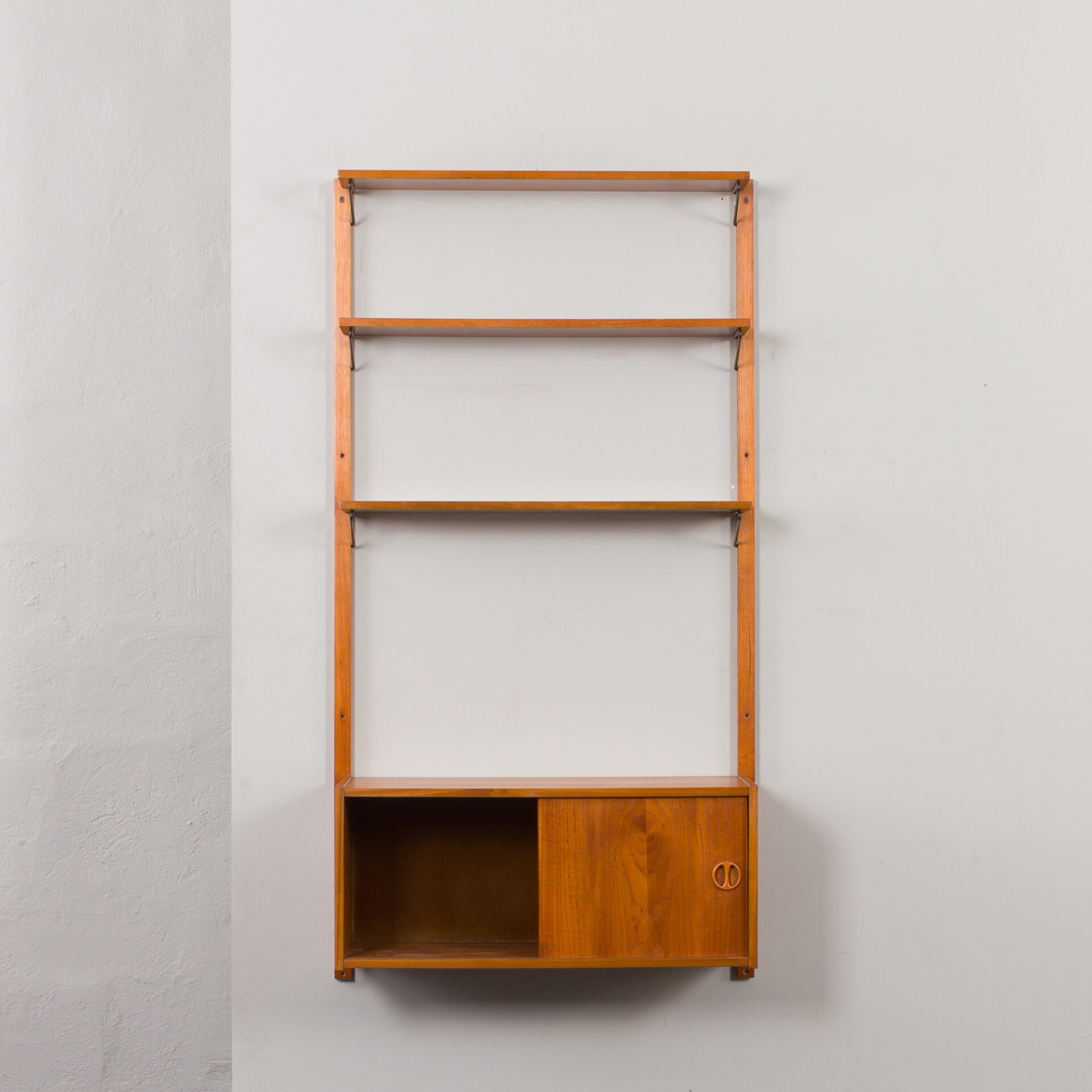Danish teak modular bookcase or and entry wall unit with sliding doors cabinet and three shelves design in the style of Poul Cadovius, or Preben Sorensen from the 60s. All elements are 80 cm wide and can be arranged upon ones will, using black metal hangers and slots in the wood rails. This vintage bookcase can be both a beautiful addition to the entrance hall and a small bedroom or living room.