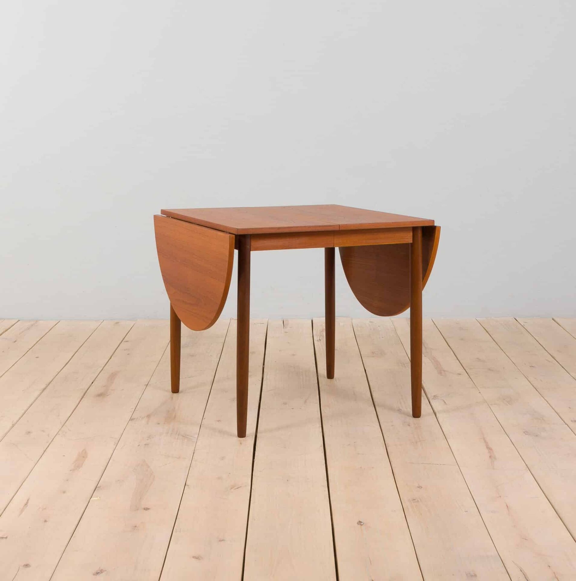 A classic Danish mid-century drop leaf dining table from the 1960s closely reminds Arne Vodder’s design from the same period. Seemingly small, but the full width extends from 77 cm to an impressive 247cm with two drop leaves 38.5cm wide each and two additional leaves 46.5 cm. The tabletop is covered in very consistent teak veneer on all the parts and stands on solid teak legs. This mid-century table features two side semi-circular drop leaves on brass hinges, that can fold down or fully detach and two separate additional leaves. It gives many possibilities to extend the table to the most required size. The table is in fantastic condition covered with several new oil layers.