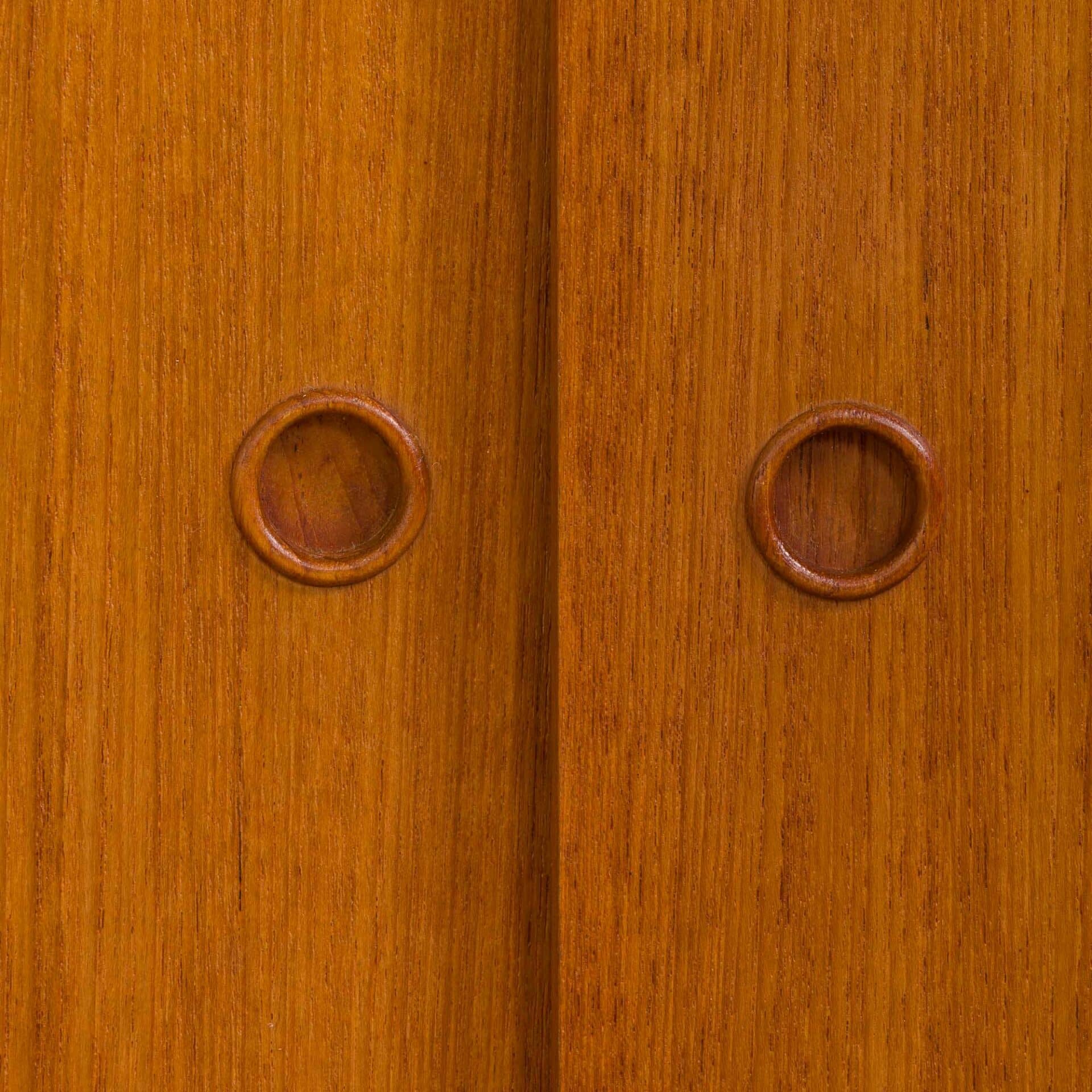 Three-bay teak wall unit by Preben Sorensen in Denmark in the 1960s made by PS System. Manufacture’s label preserved. This entirely modular shelving system is ideal for a home office, as the compact desk, made in the style of Cadovius projects, will allow you to work even in the living room. Each component is 80cm wide and can be arranged at ones will.