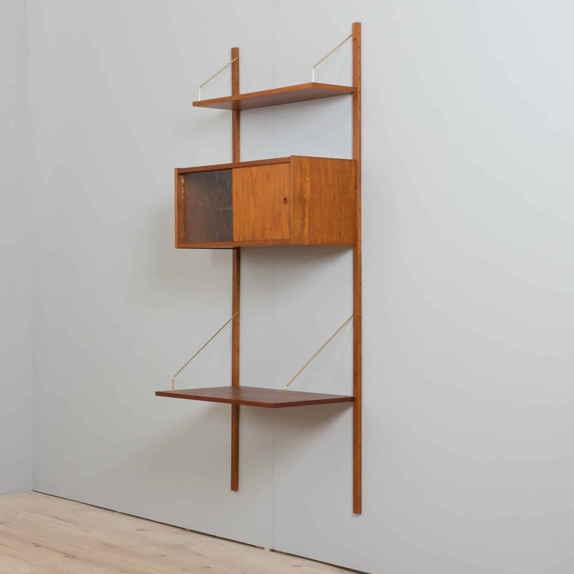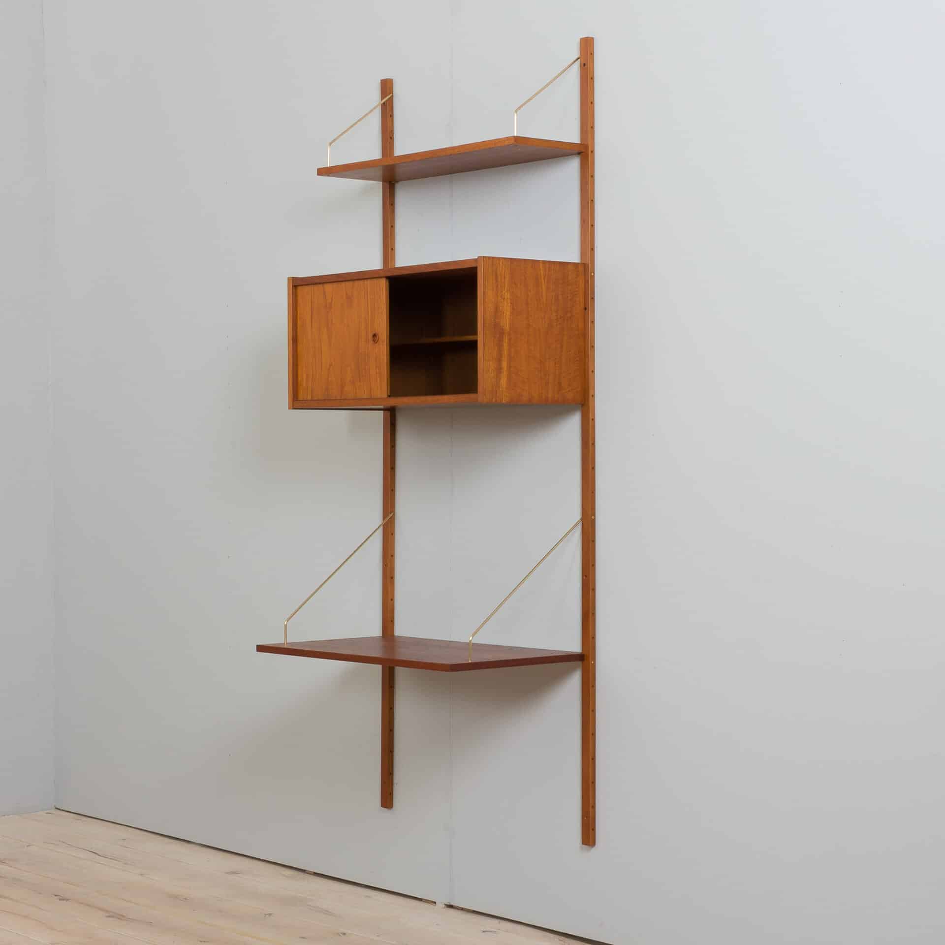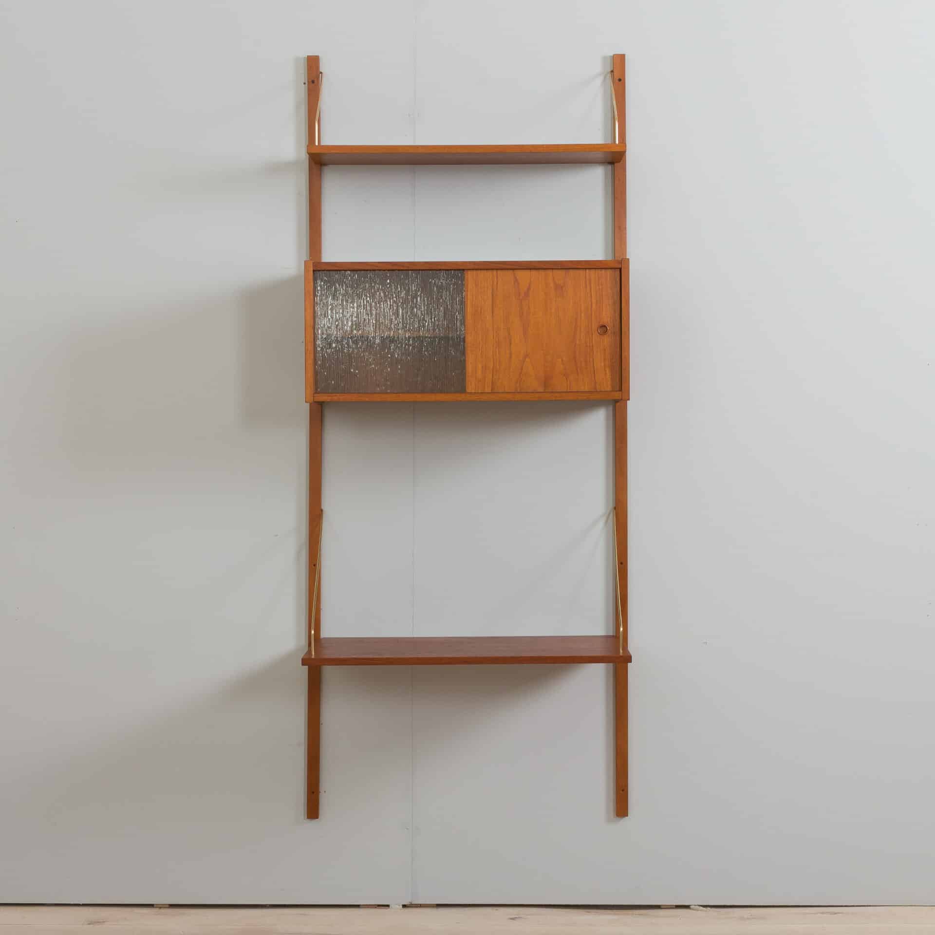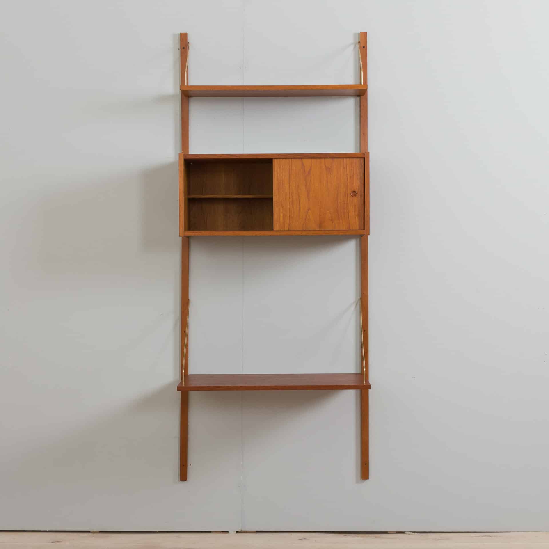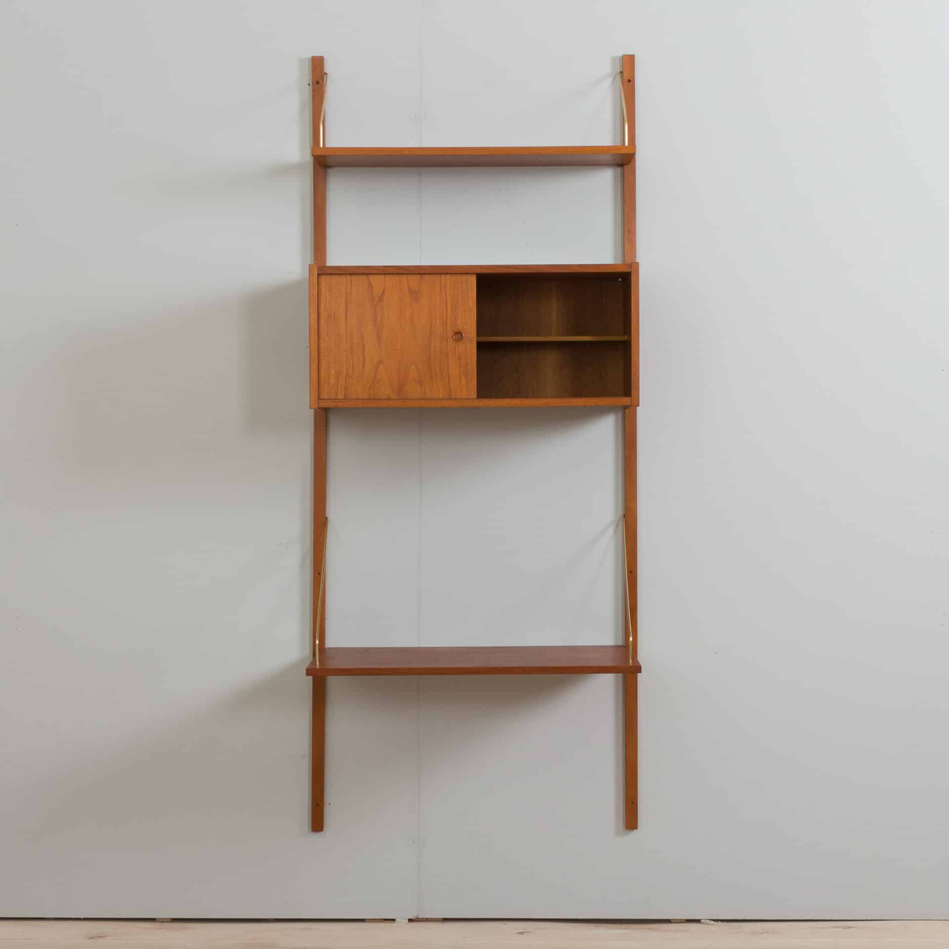 Danish teak wall unit made by Preben Sorensen in Denmark the 1960s. This entirely modular shelving system is ideal for a home office, as the compact desk will allow you to create a work space and a storage even in the small living room. The set consists of