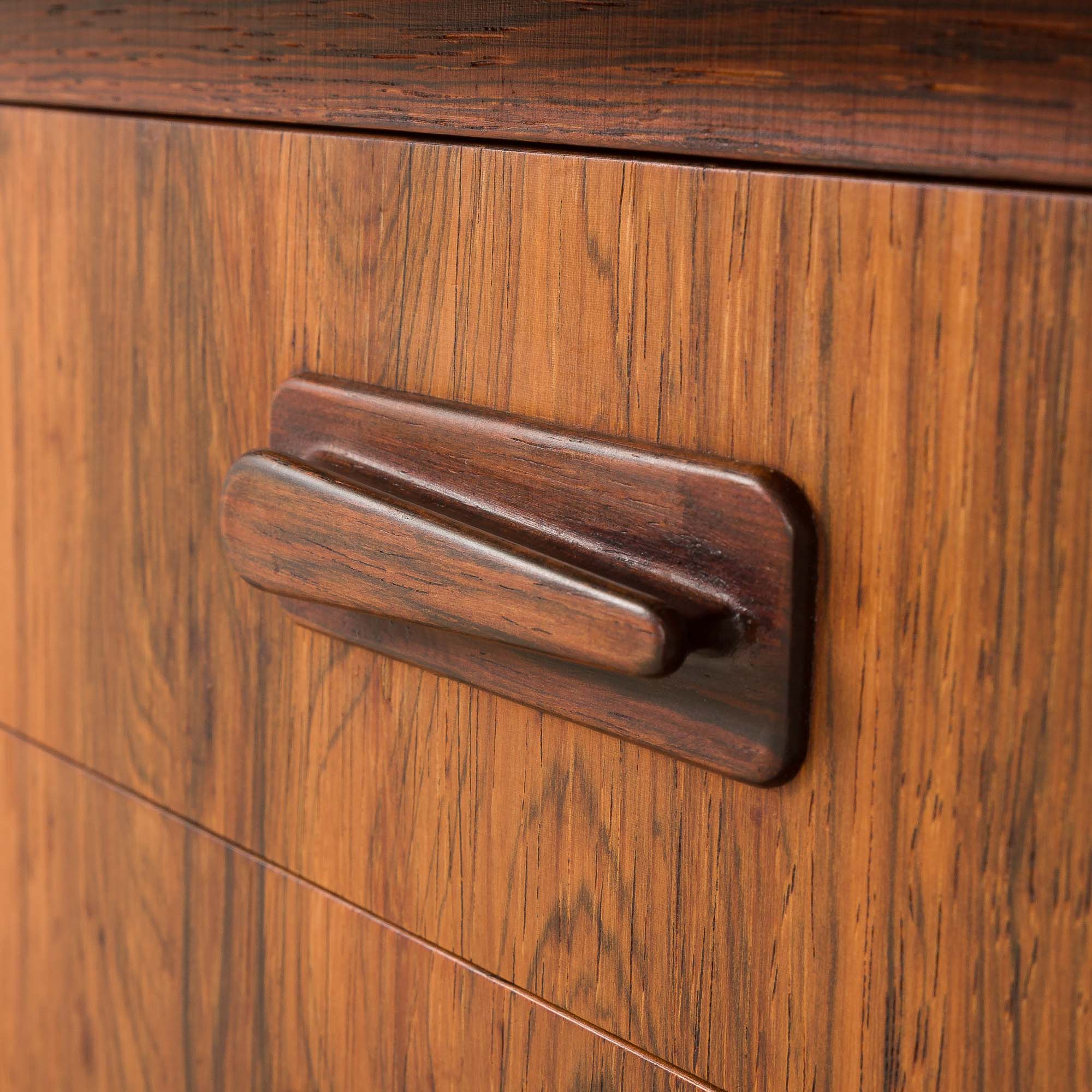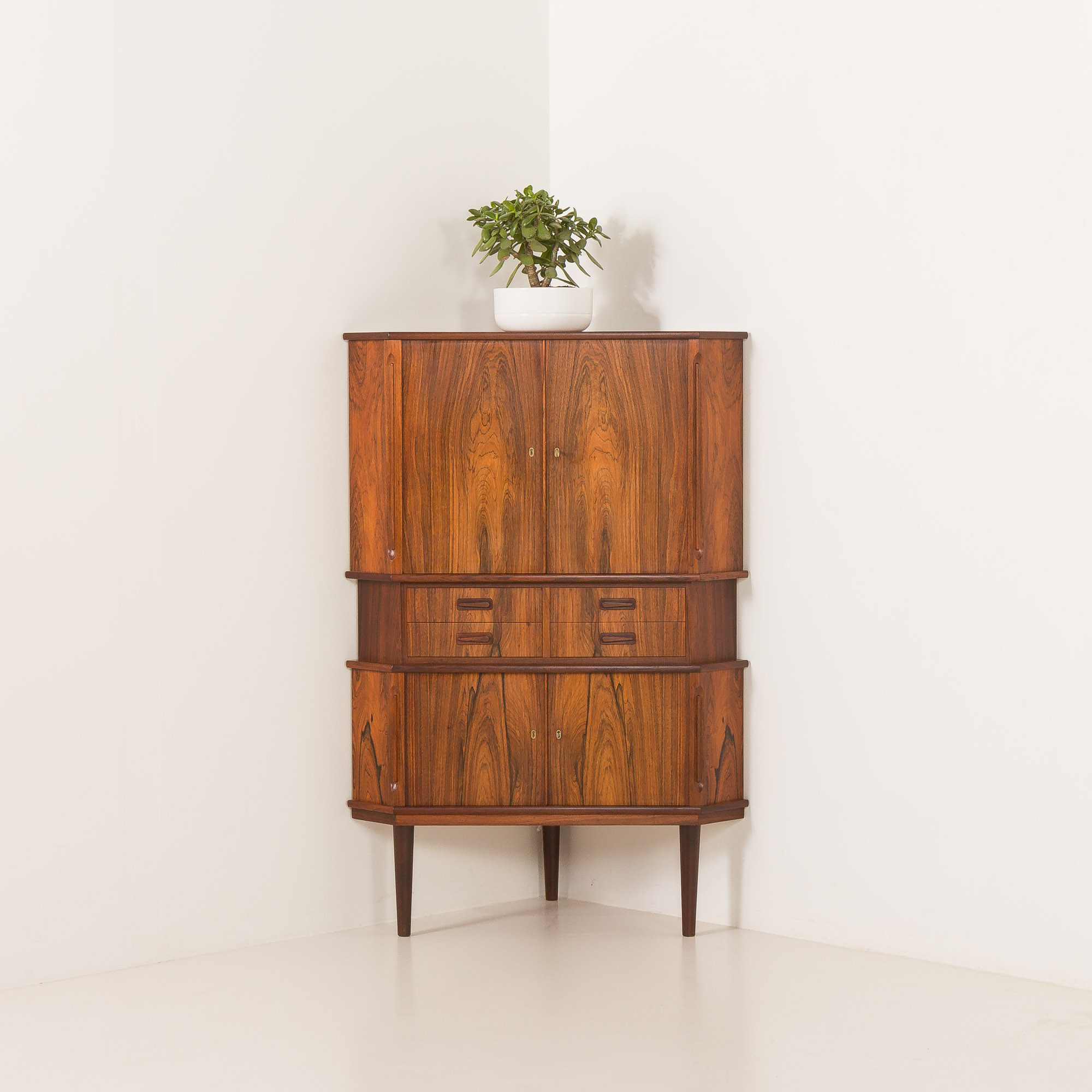This Danish mid-century rosewood corner cabinet with four drawers from the 1960s is a stunning example of Scandinavian design. Its compact form makes it perfect for maximizing storage in smaller spaces. With its rosewood-rich grain veneer and solid wood elements, this piece is built to last for decades while continuing to impress with its high-quality craftsmanship. It has a sculptural, slightly organic form with incredible details. It is an art of carpentry compacted in this rare corner piece.