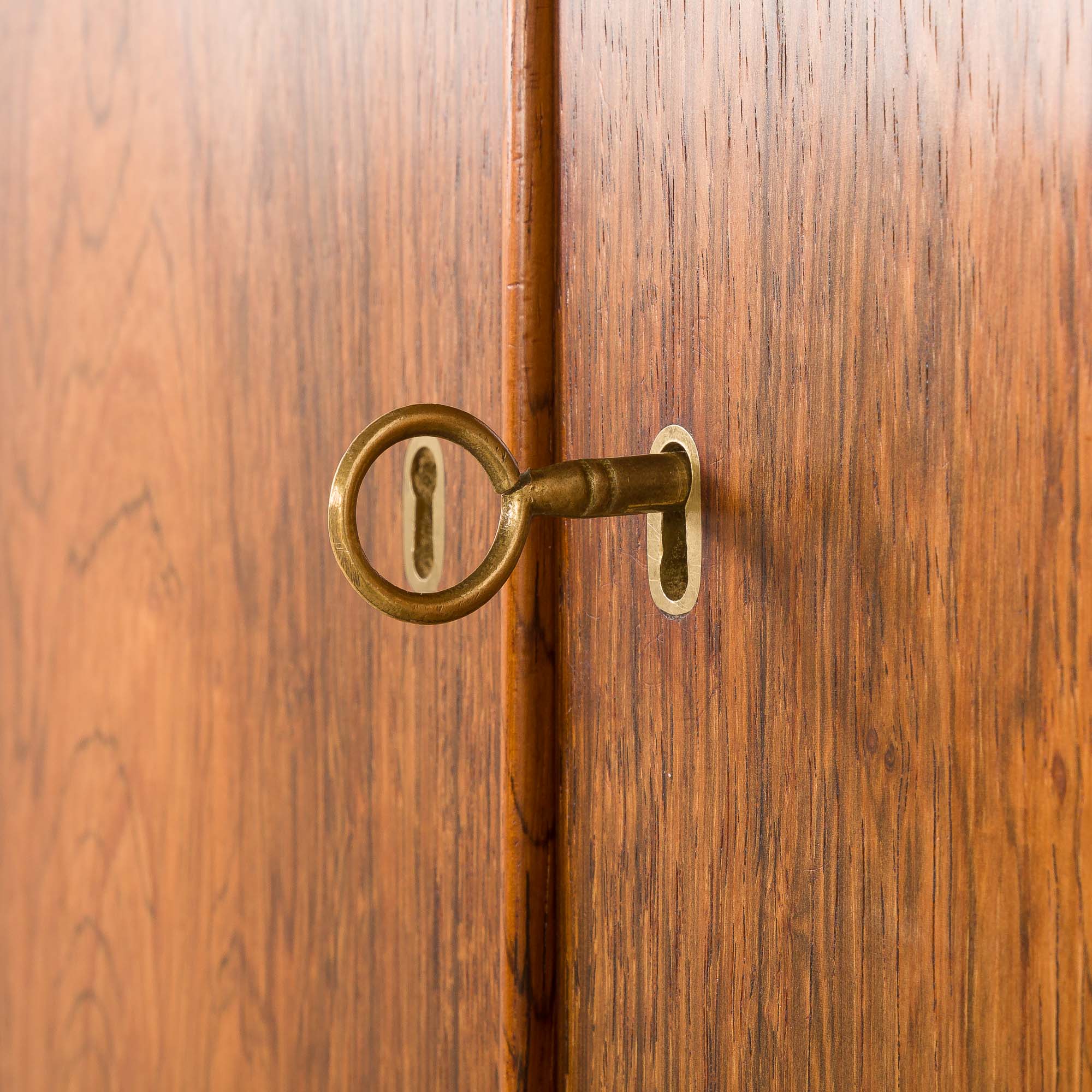 The interior features two spacious cabinets, bigger one with a shelf, and in combination with a set of four drawers with beautiful sculptured solid rosewood handles, providing flexible storage options for a variety of items, from books and tableware to decorative pieces, regardless of their size. A lockable door, complete with a key, ensures the secure storage of your belongings. Tapered solid legs—the hallmark of Scandinavian design—are detachable, providing more convenient transport.