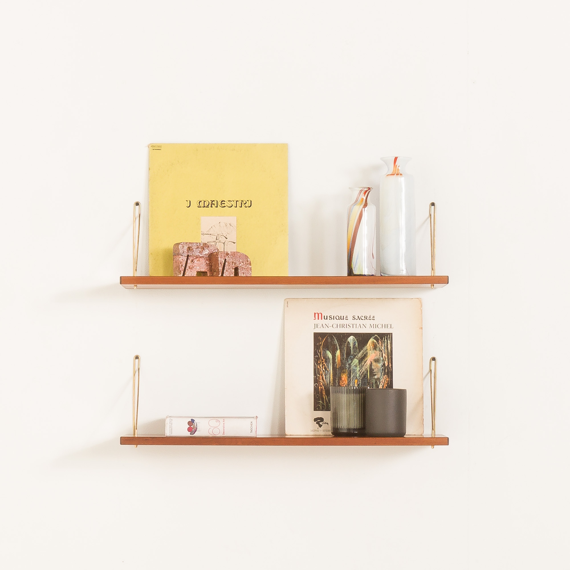 This set of two Danish mid-century teak floating shelves, designed in the late 1950s or 1960s, embodies timeless elegance. Crafted in teak and adorned with solid brass hangers, these shelves showcase the iconic mid-century aesthetic – a combination of carefully selected materials, great craftsmanship, and beautiful minimalist design. The warm brown hue of the teak wood enhances the visual appeal of the set, while the 72 cm width creates a convenient space for storage.