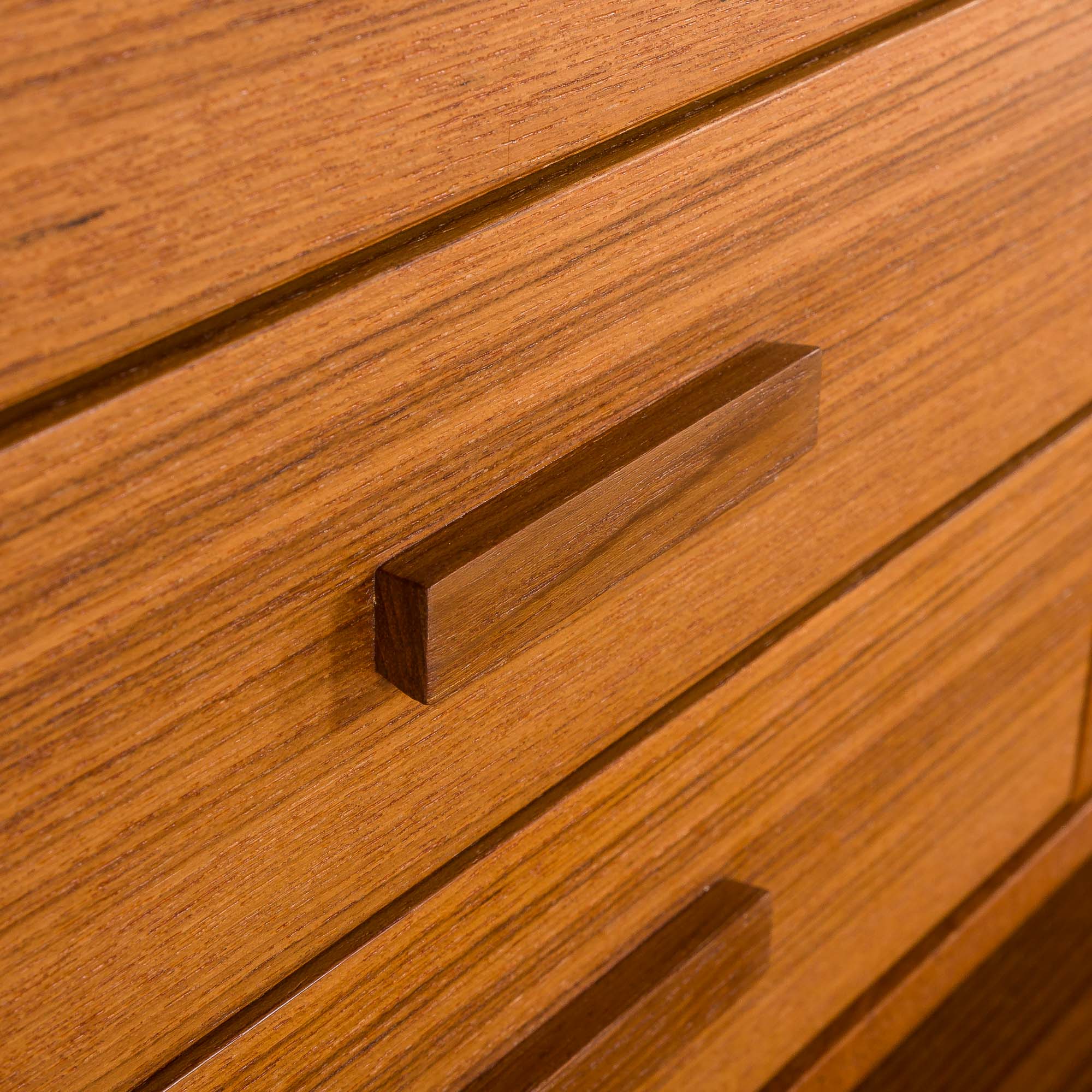 This vintage Danish mid-century teak secretaire cabinet with a desk was designed in the 1960s. It is a fantastic example of high-quality Danish mid-century carpentry that combines elegance and functionalism. The stunning feature of it are the brass inlays on the handles. It adds some charm and twist to the minimalist wooden structure. The cabinet consists of three big and five small drawers and a functional drop-down desk that can create a space for a home office while ensuring just enough place for storage, documents, and decorations. Each drawer front is joined by sturdy dovetailed joints, ensuring durability and a seamless appearance. This piece, because of its size, will perfectly match smaller apartments or bedrooms. Minimalist lines, but still very decorative with many brass inlays and solid teak sculptural details.