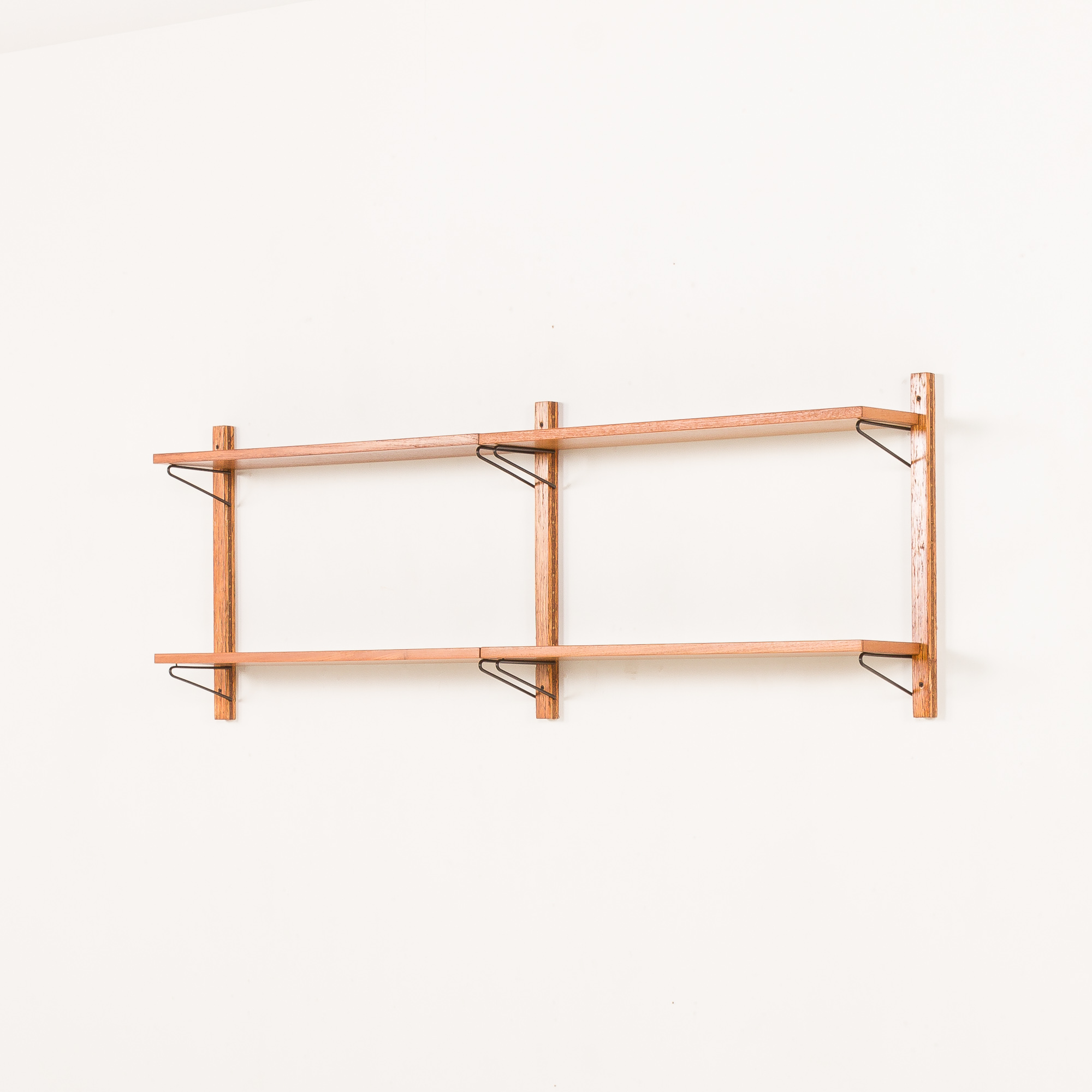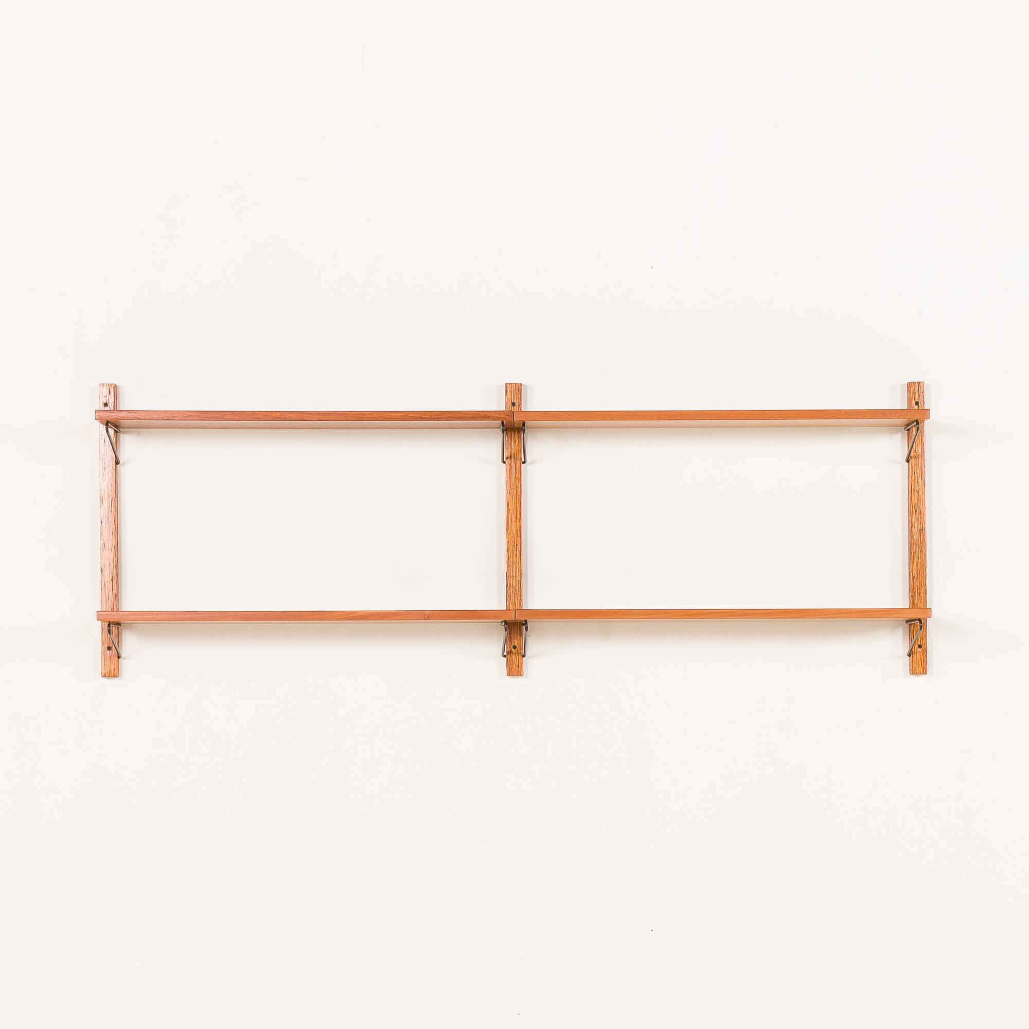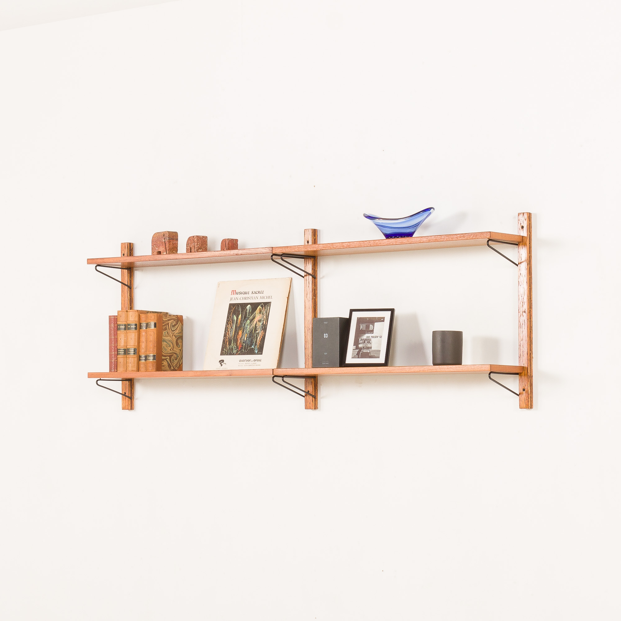 The minimalist Danish mid century upcycled teak shelving unit is a modular system with shelves arranged in two rows, creating an attractive composition for books and decorations.