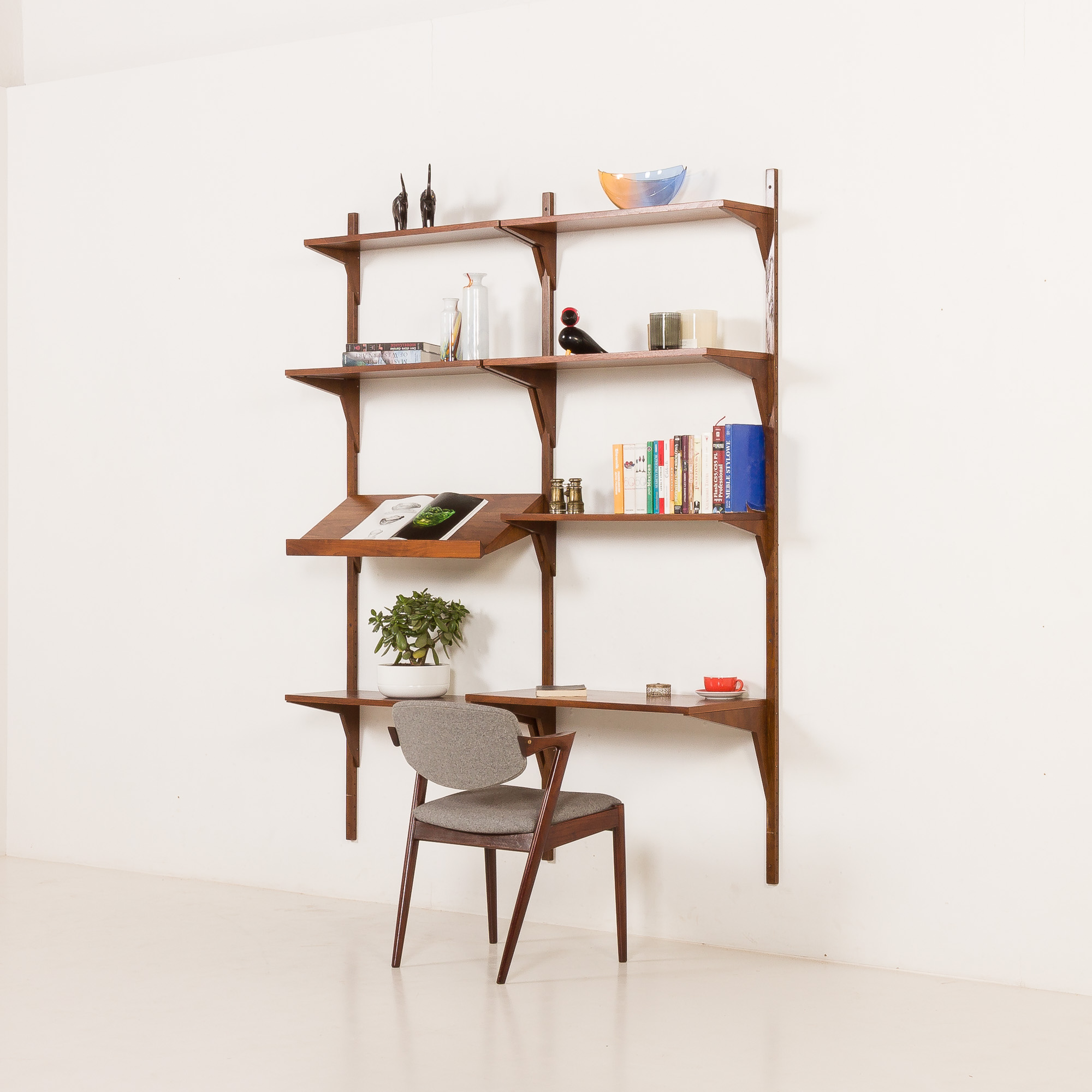 This piece features a walnut finish rarely found in mid-century Danish design. The set includes multiple shelves, a display shelf, and a desk shelf, allowing it to function both as a storage solution and as a compact home workspace. Functional wall arrangement in vintage-inspired or contemporary interiors.