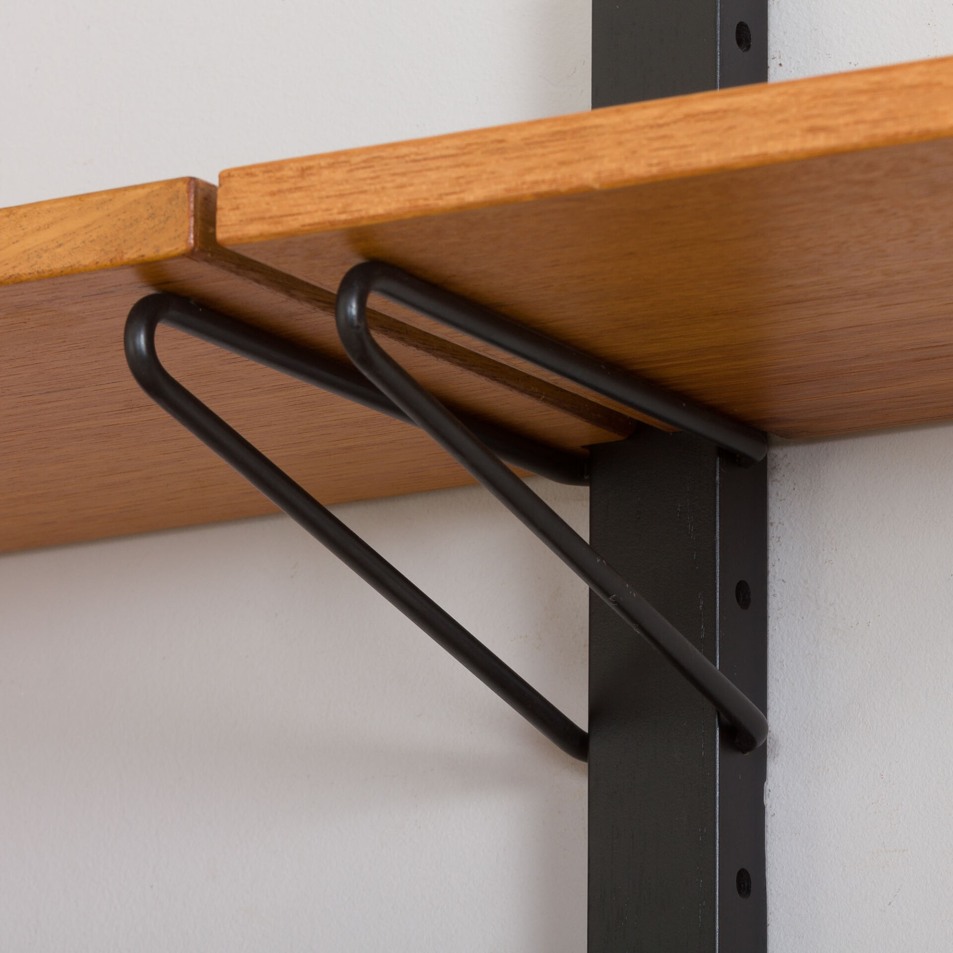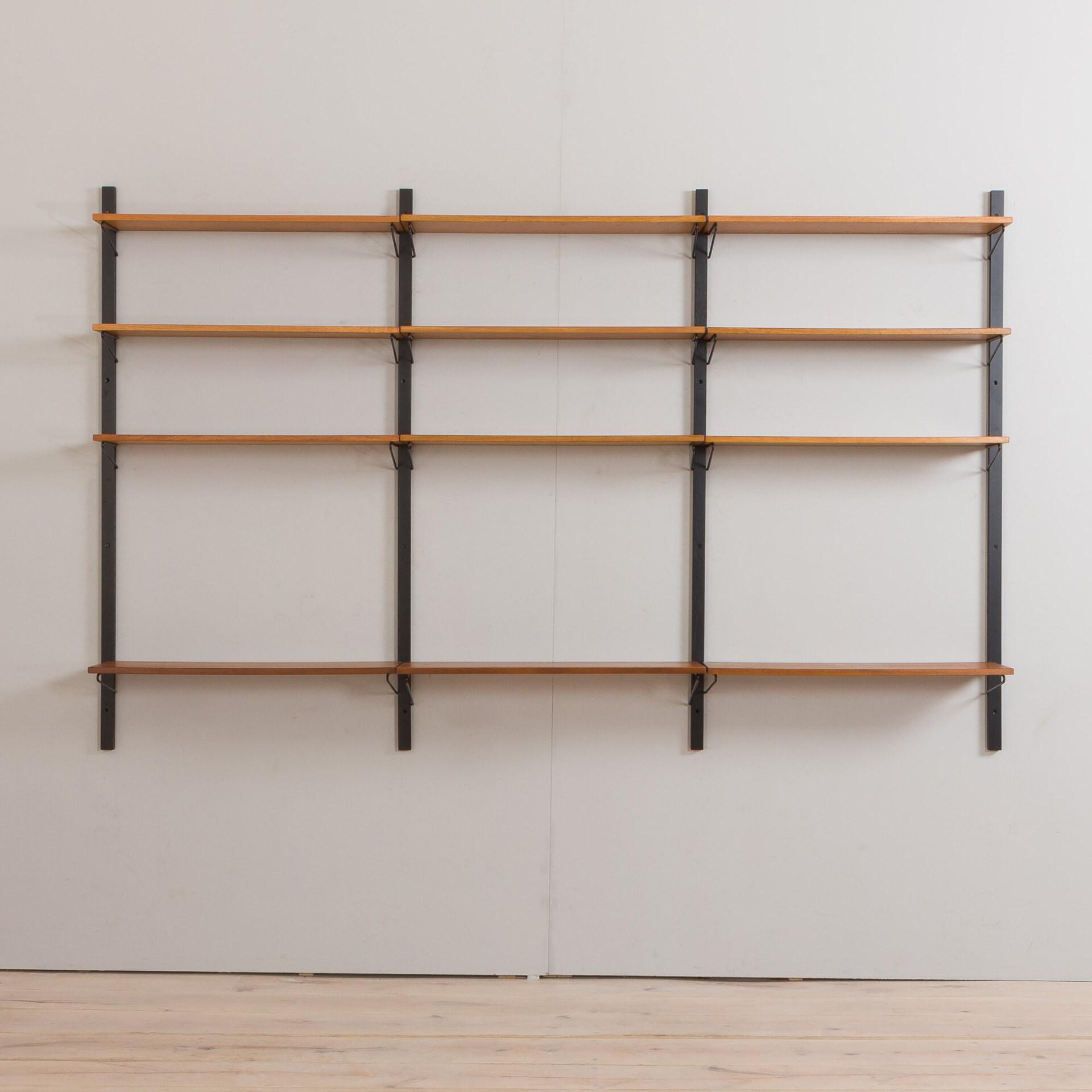 Danish shelving system in the style of Sorensen and Cadovius comes from the 1960s. This fully modular wall unit is ideal for a living room or any place where exposed storage is needed. The shelves are made in light teak and the rails are in solid ebonized wood.The hangers are made of black painted steel.