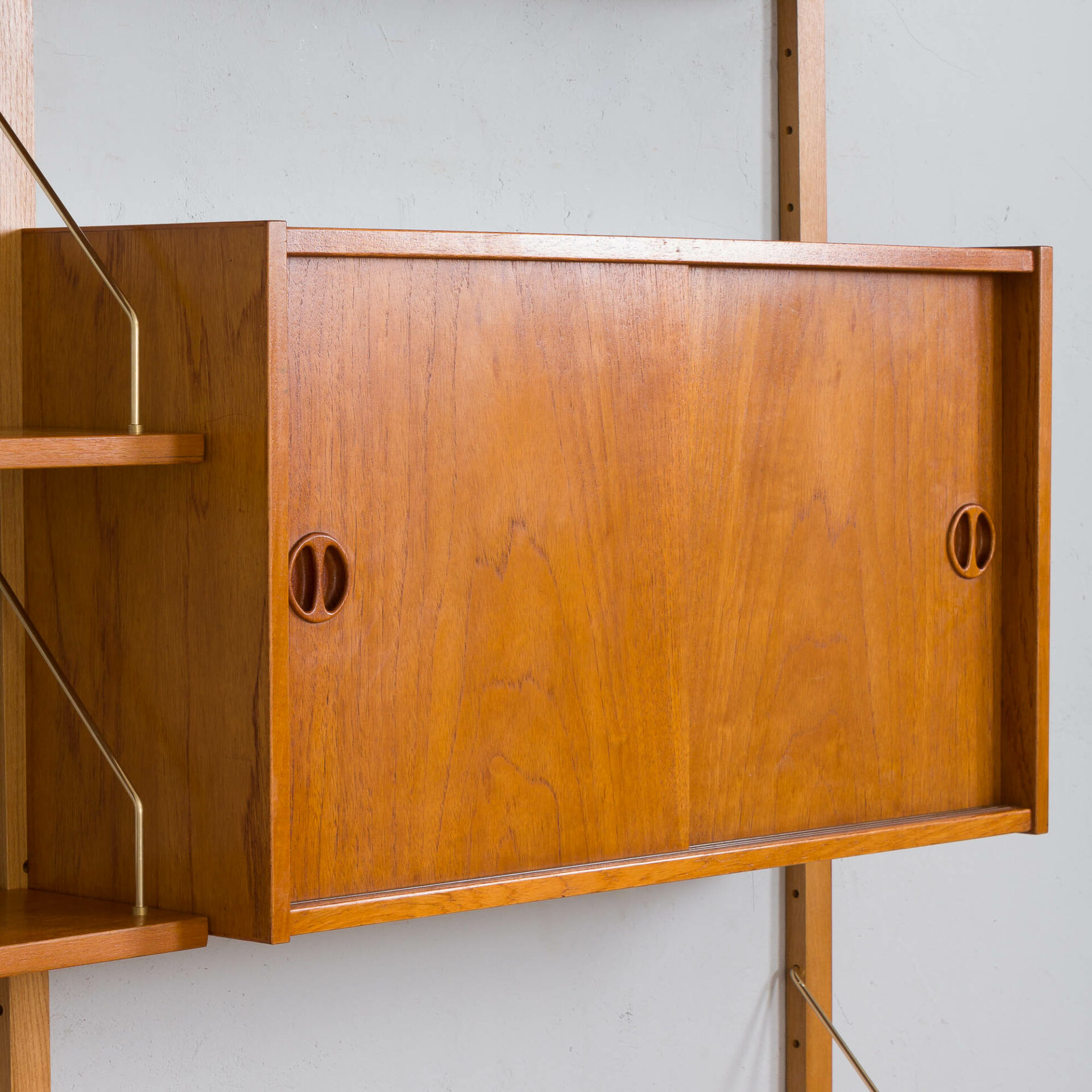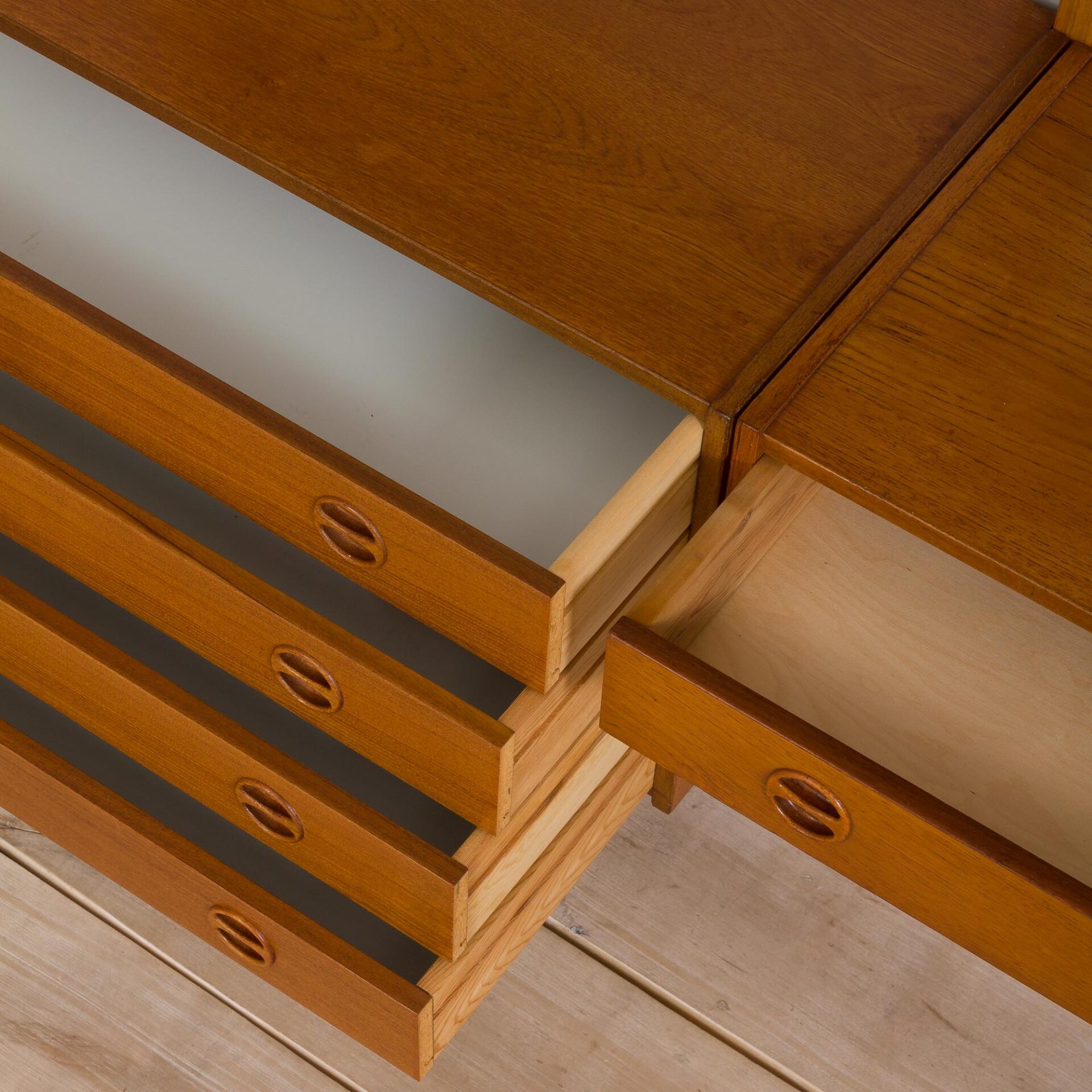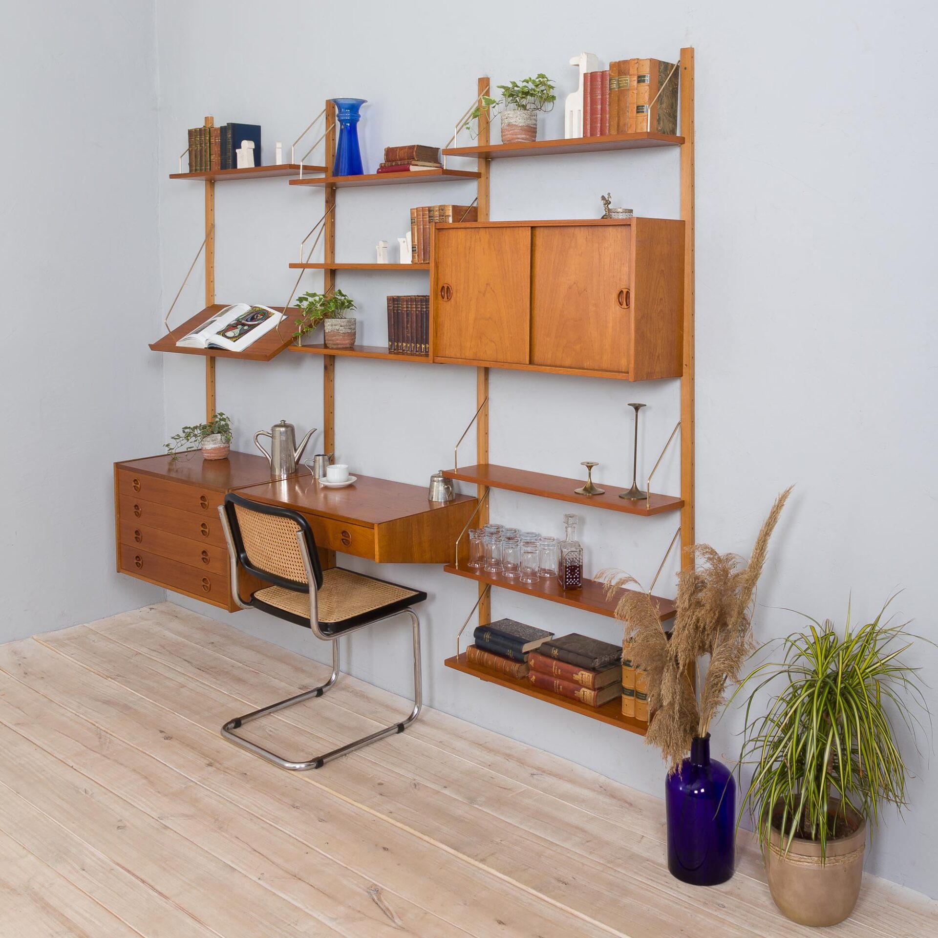 Three-bay teak wall unit designed in the style of Poul Cadovius or Kai Kristiansen made in Denmark in the 1960 s. This entirely modular shelving system is ideal for a home office, as the compact desk will allow you to work even in the living room. Each component is 80cm wide and can be arranged at ones will. The set consists of