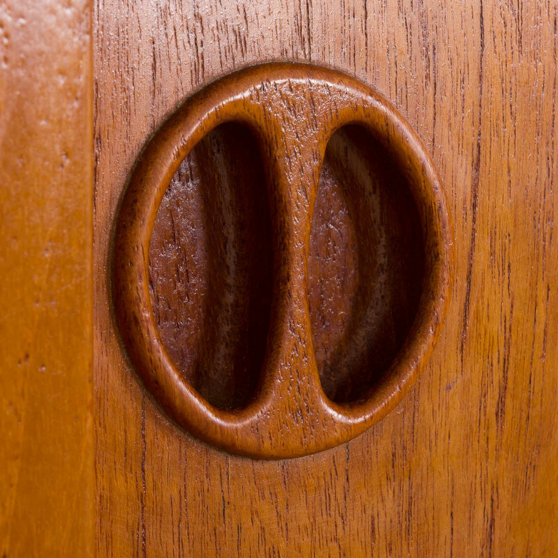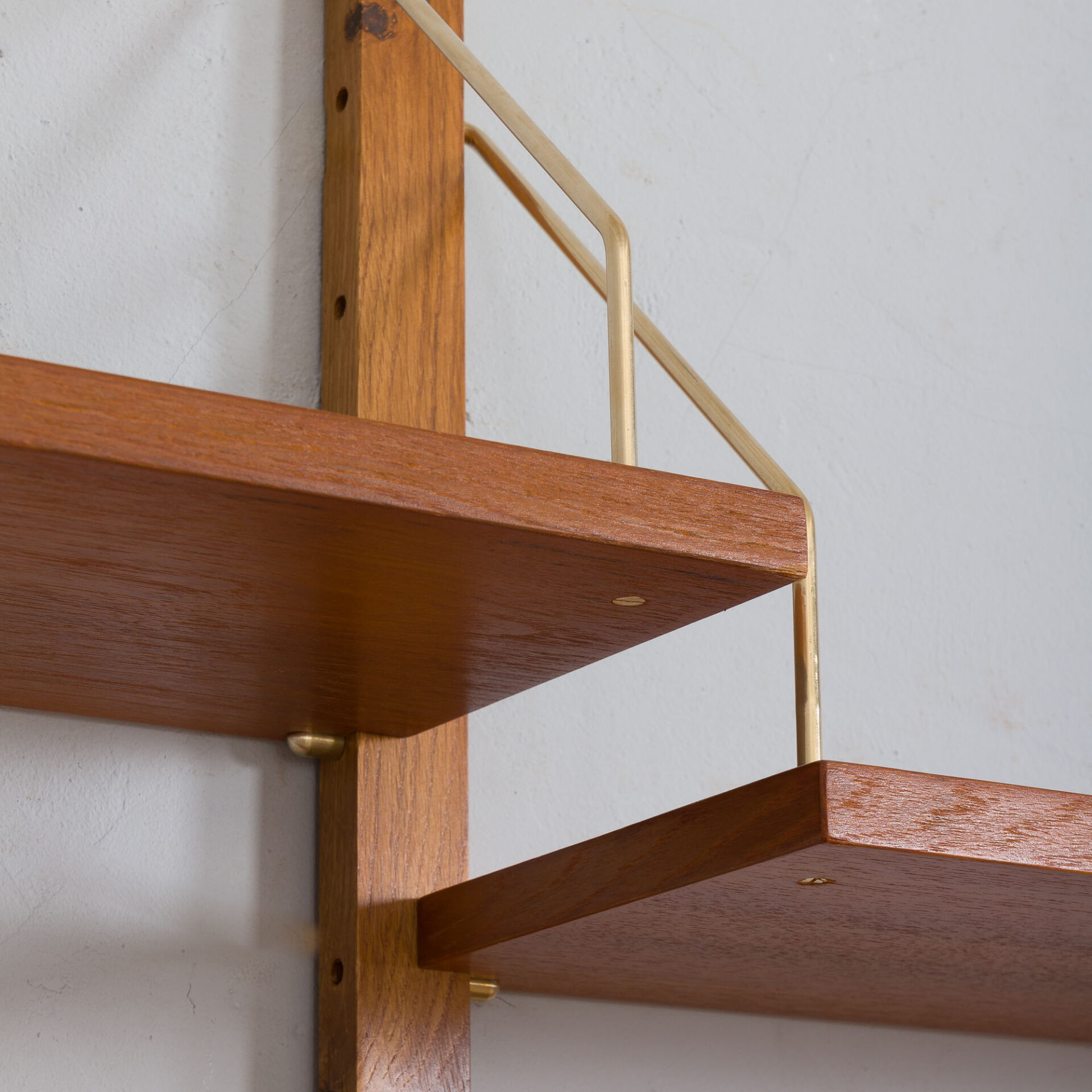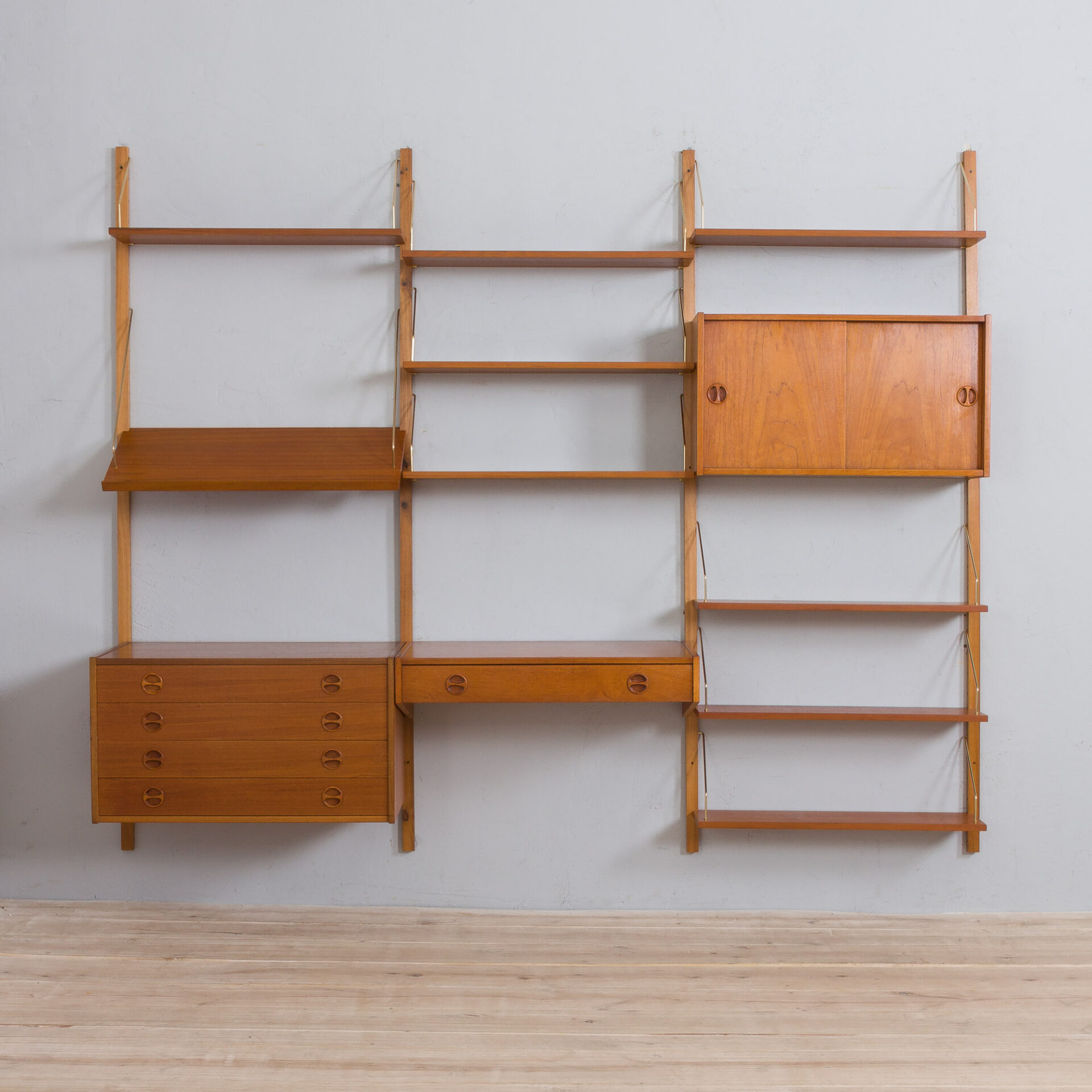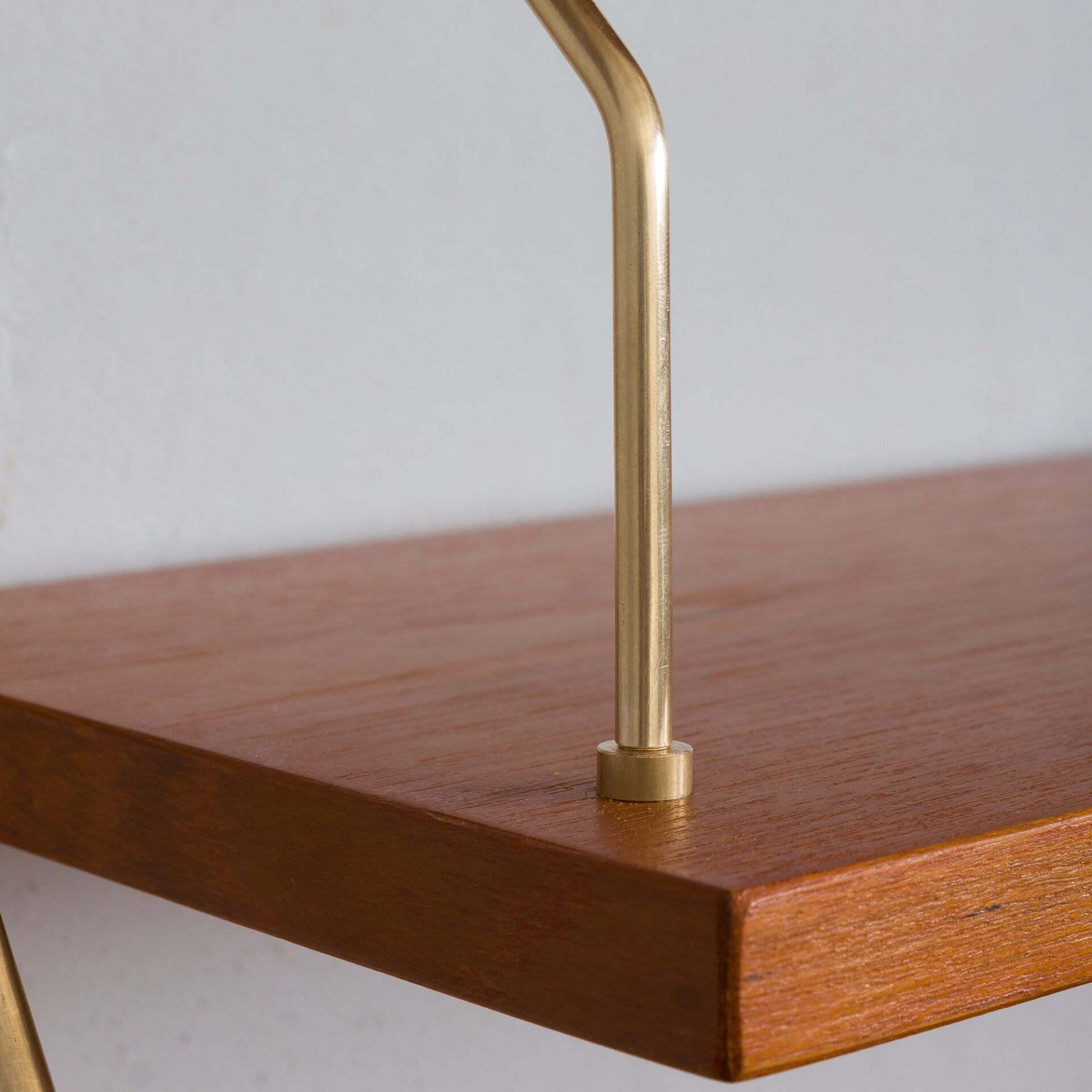 Three-bay teak wall unit designed in the style of Poul Cadovius or Kai Kristiansen made in Denmark in the 1960 s. This entirely modular shelving system is ideal for a home office, as the compact desk will allow you to work even in the living room. Each component is 80cm wide and can be arranged at ones will. The set consists of