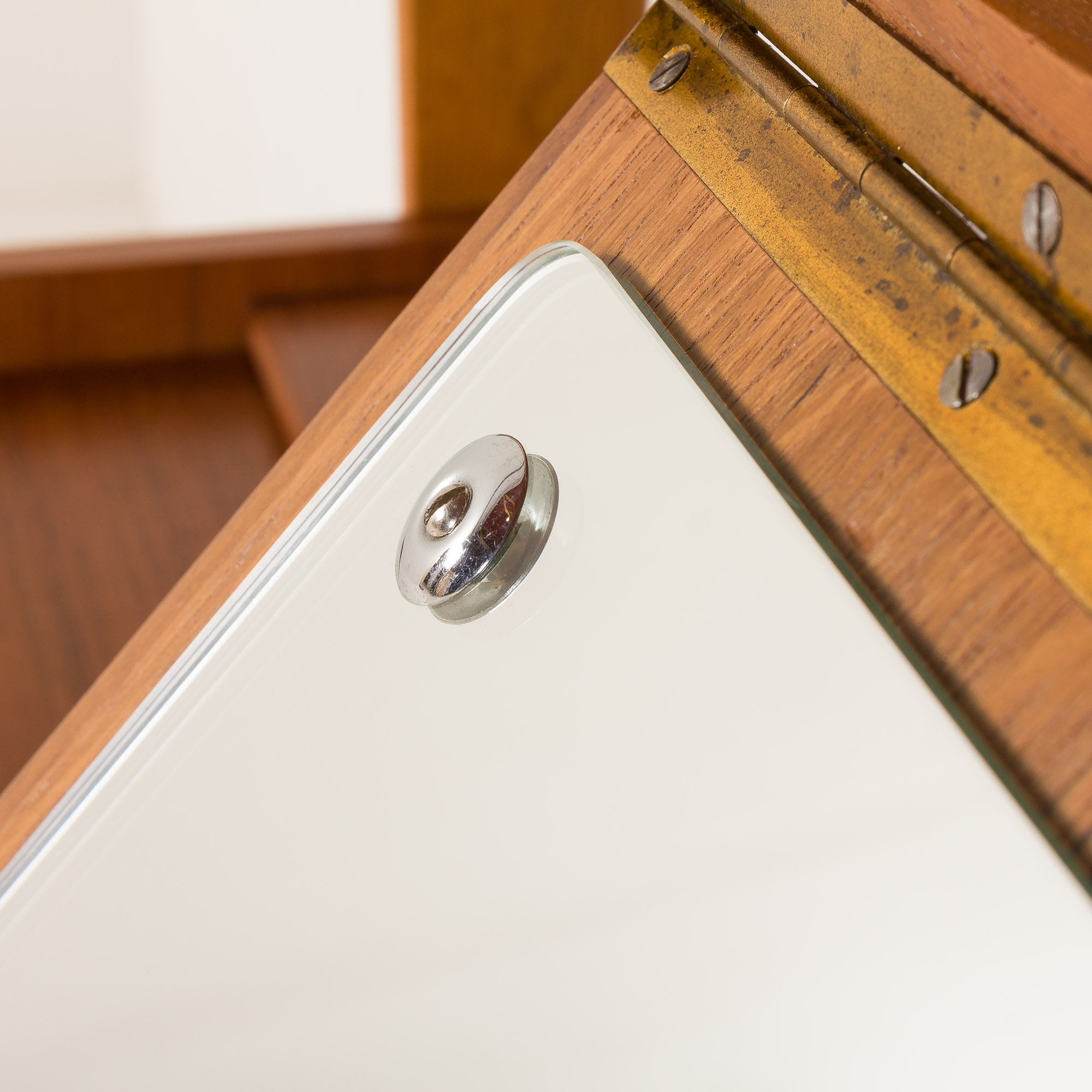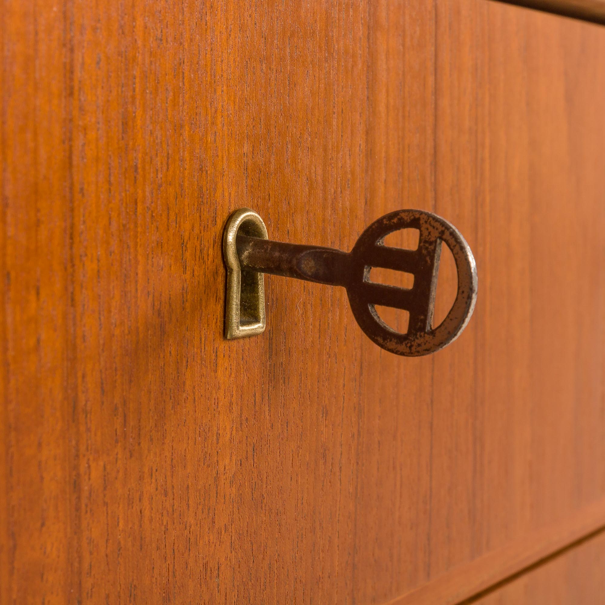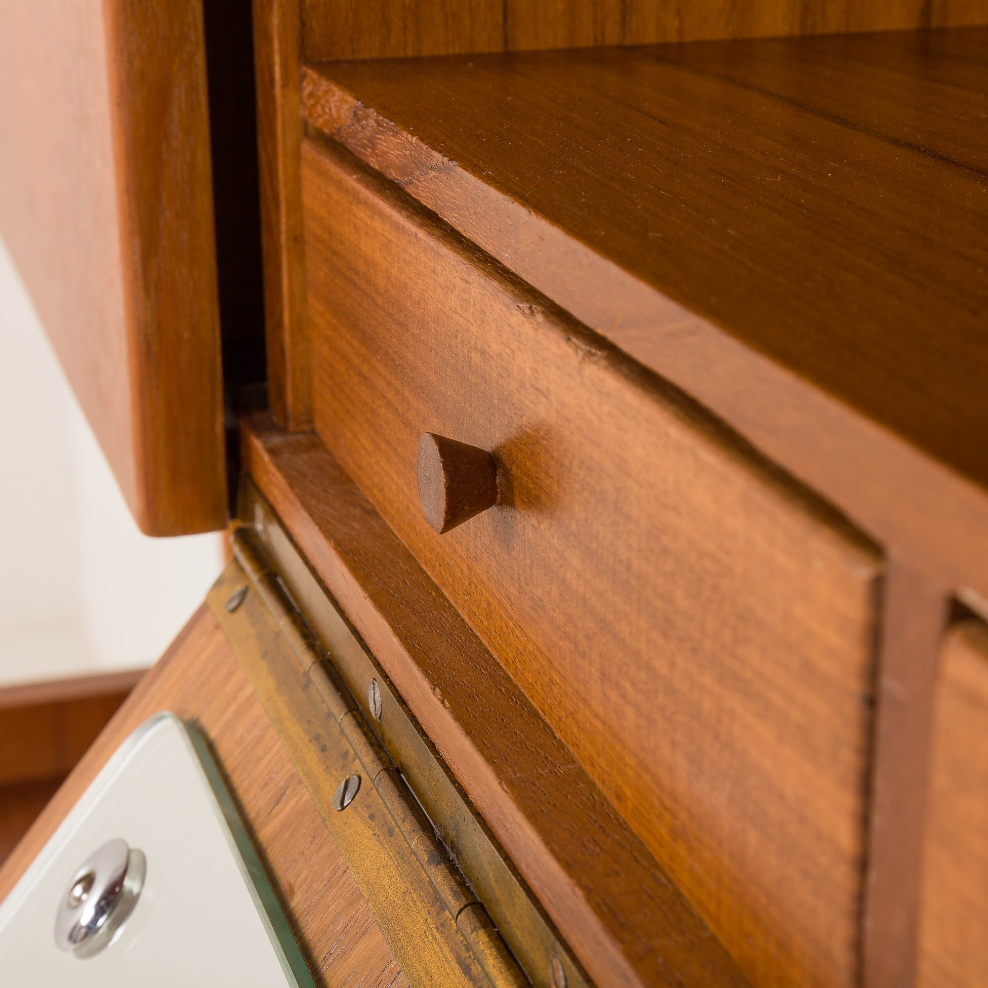 The cabinet has been renovated thoroughly. It was taken apart and refinished. We have made sure that drawers and pull out mechanisms work smoothly. The wood has been cleaned and finished with layers of satin lacquer for extra protection and low luster mid century look. We leave minor signs of use that do not spoil the aesthetic and only confirm its originality. We try to bring it back to its best look, still considering it is 60 years old. The legs are detachable for shipping. Overall, secretaire is in perfect original condition.