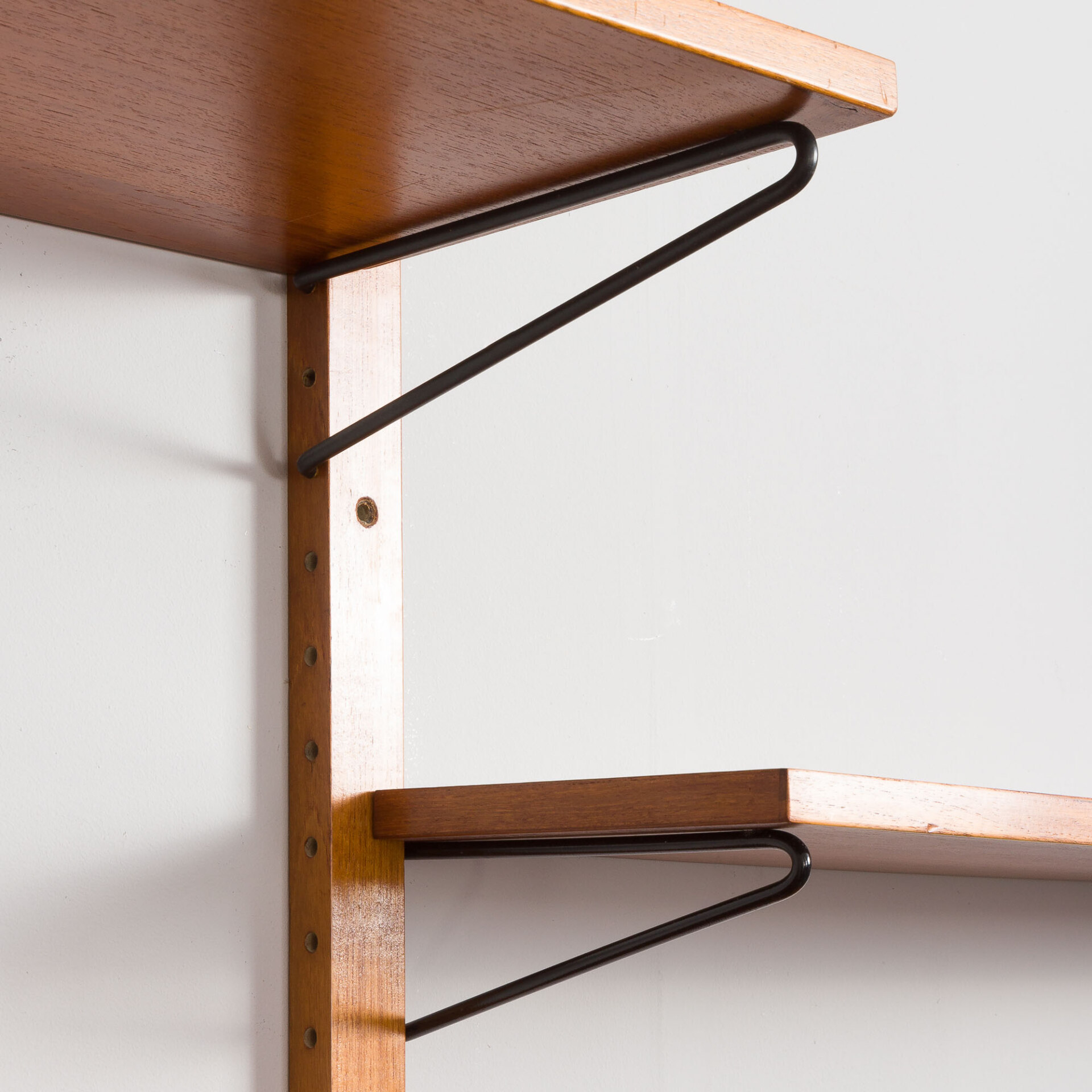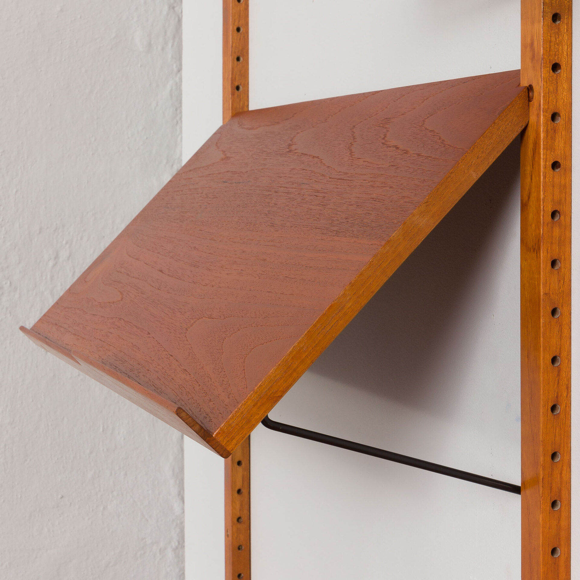 This mid-century shelving system is an excellent solution for storing and exposing books and decorations. It is entirely modular and can be arranged upon one’s will. Beautiful teak grain and warm color will enhance any living area, bedroom or an office.
