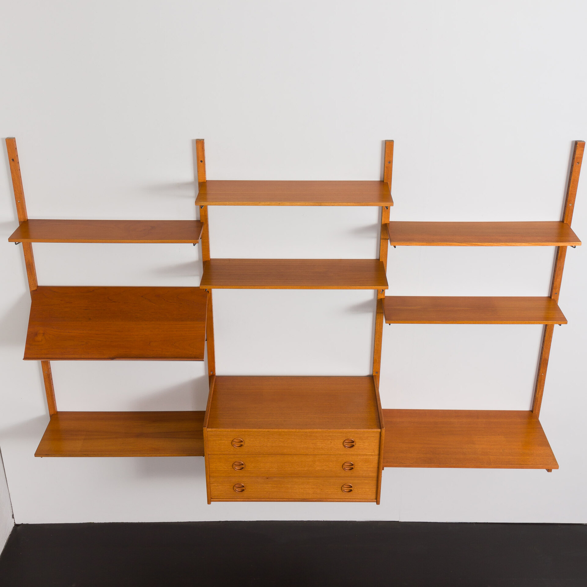 This modular wall unit has a stylish cabinet that features three drawers. It comprises seven shelves and one shelf for magazines or albums. Te unit is attcahed to the wall with four wooden rails, each 168 cm long, and black varnished hardware.