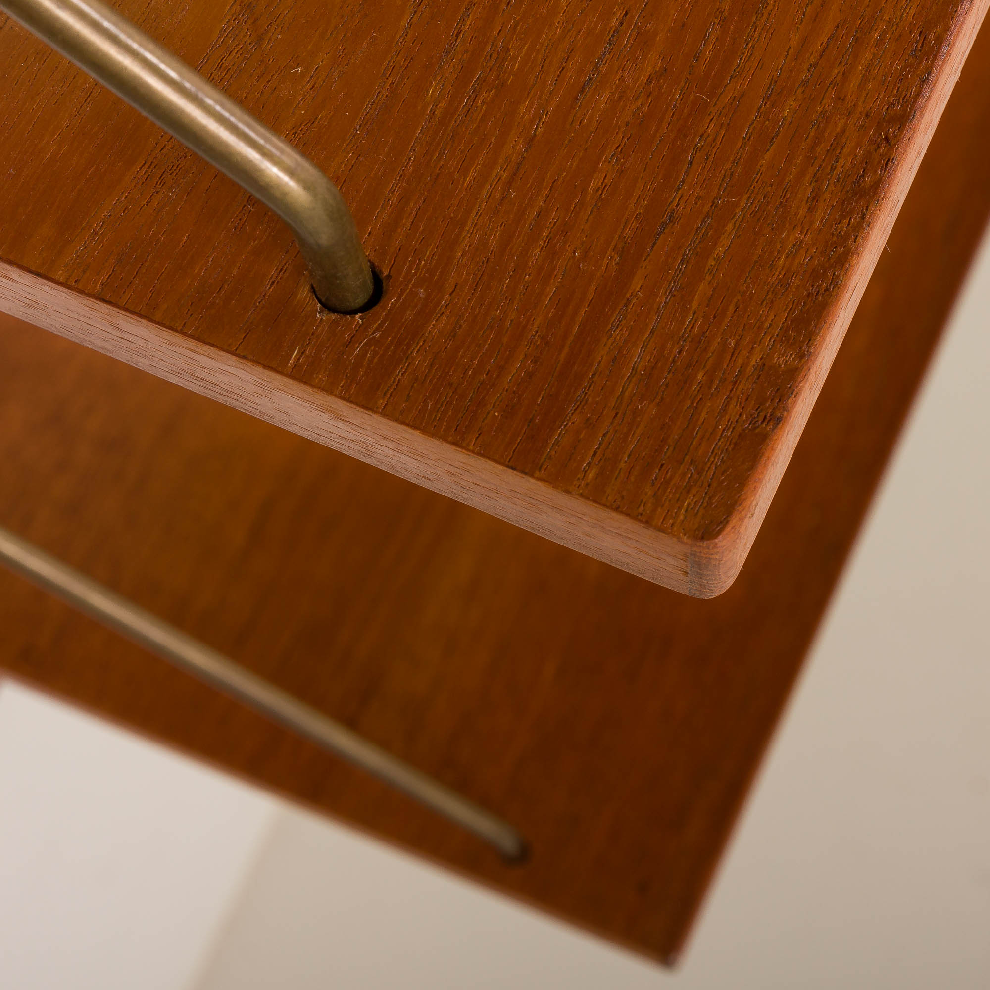 The shelving system is very easy to assemble, and the shelves can be placed higher or lower according to one’s needs. It has been renovated. The brass has been polished, and the wood has been cleaned and treated with protective layers of oil to enhance the beautiful teak wood grain. The unit is in great original condition from the 1960s, and the final effect is incredible.