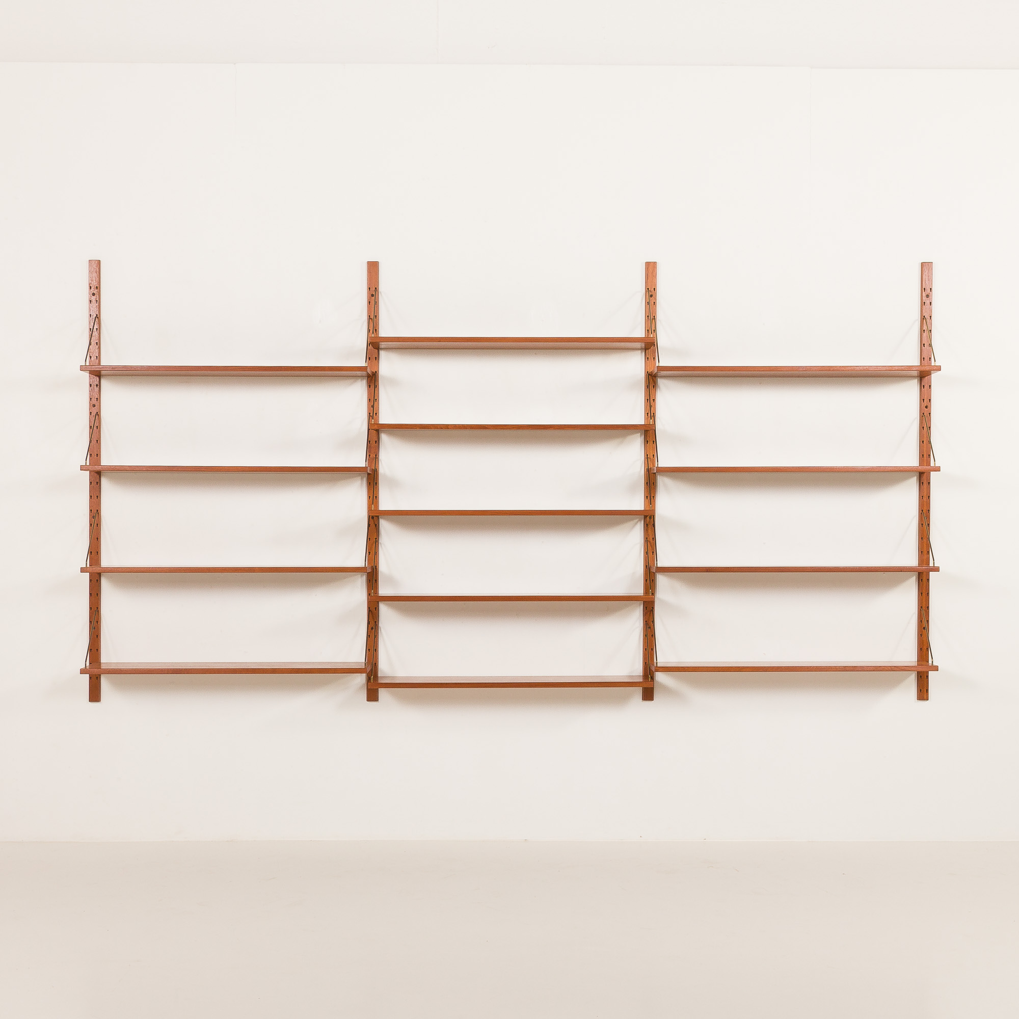 A remarkable composition of Scandinavian teak extra wide (100cm each section ) shelves, hanging on solid wood rails and brass hangers, in the style of Poul Cadovius. They were made in Denmark, some time in the early 1960s. The set features an entirely modular shelving system, perfect for displaying books and decorations as needed.