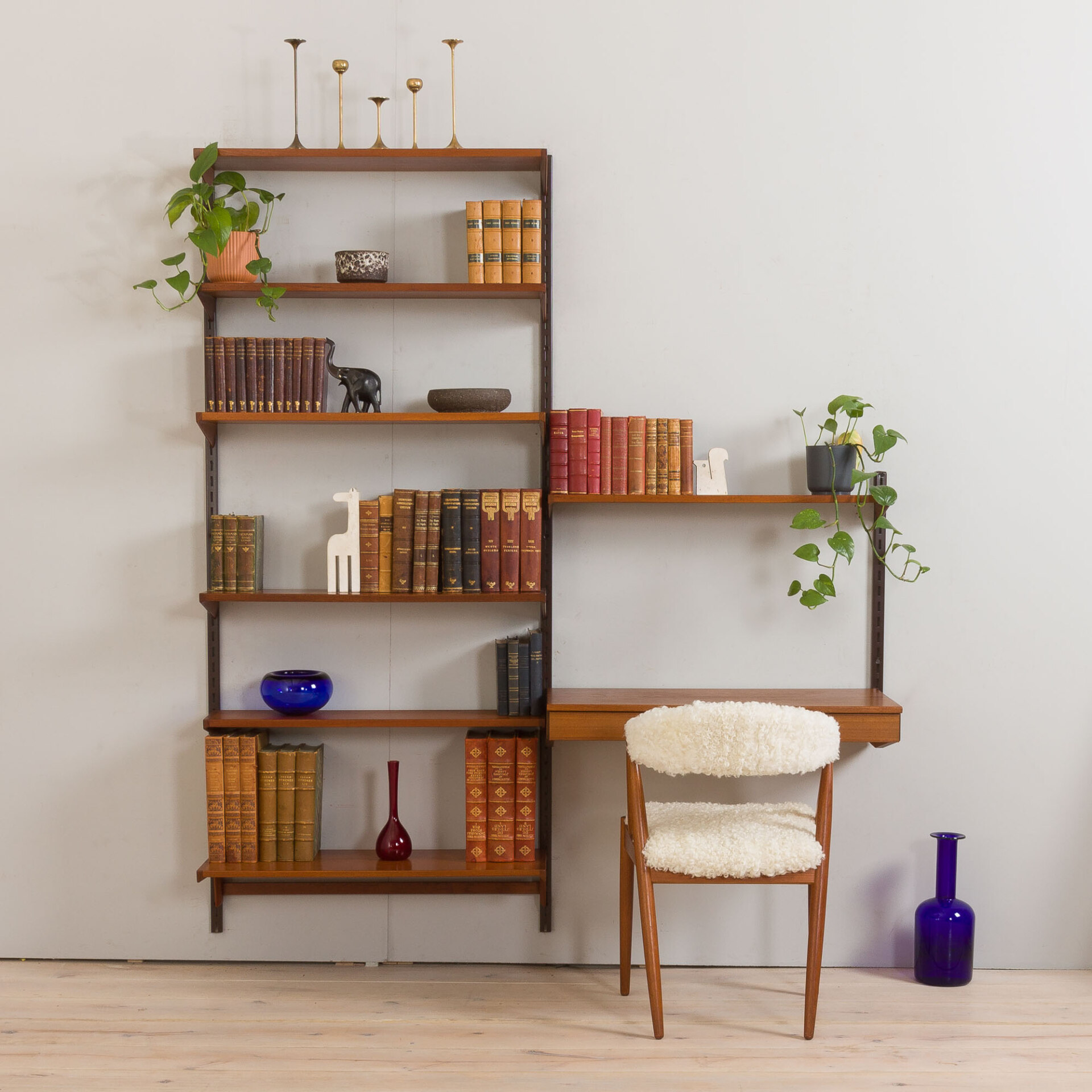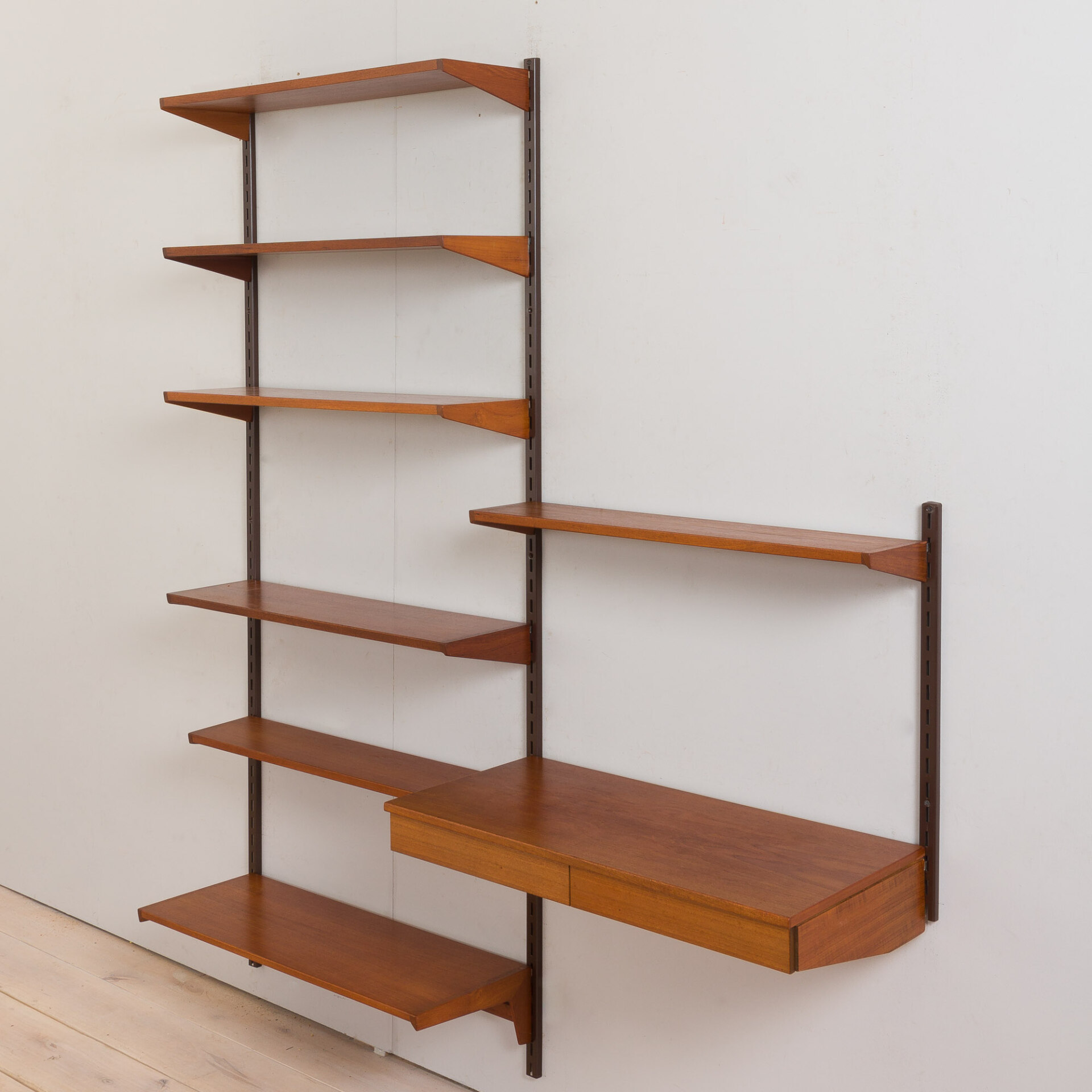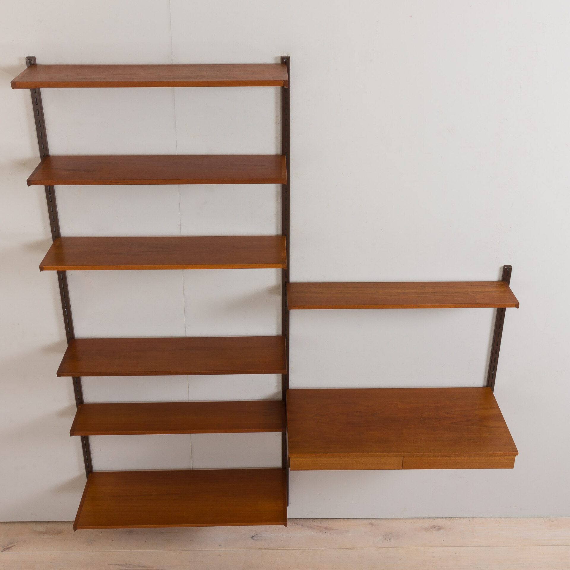 Elegant Danish vintage bookcase with floating desk in teak, designed by Kai Kristiansen in the 60s, manufactured by FM Mobler, validated by Manufacturer’s label. Seven various-depth shelves combined with a comfortable desk will create a functional home office space with storage for books and decorations. Ideal for a living room or a bedroom. The wall unit features brilliant carpentry and rich teak grain. A great example of Danish carpentry skills from mid 20th century.