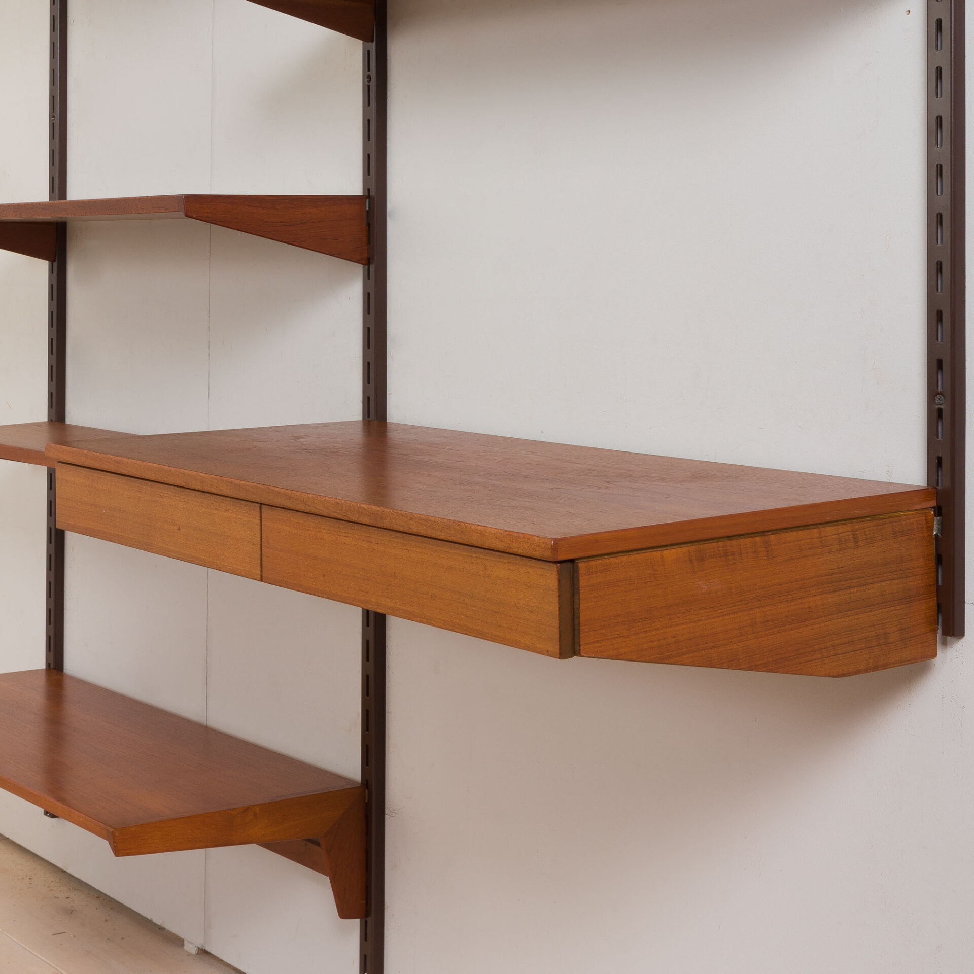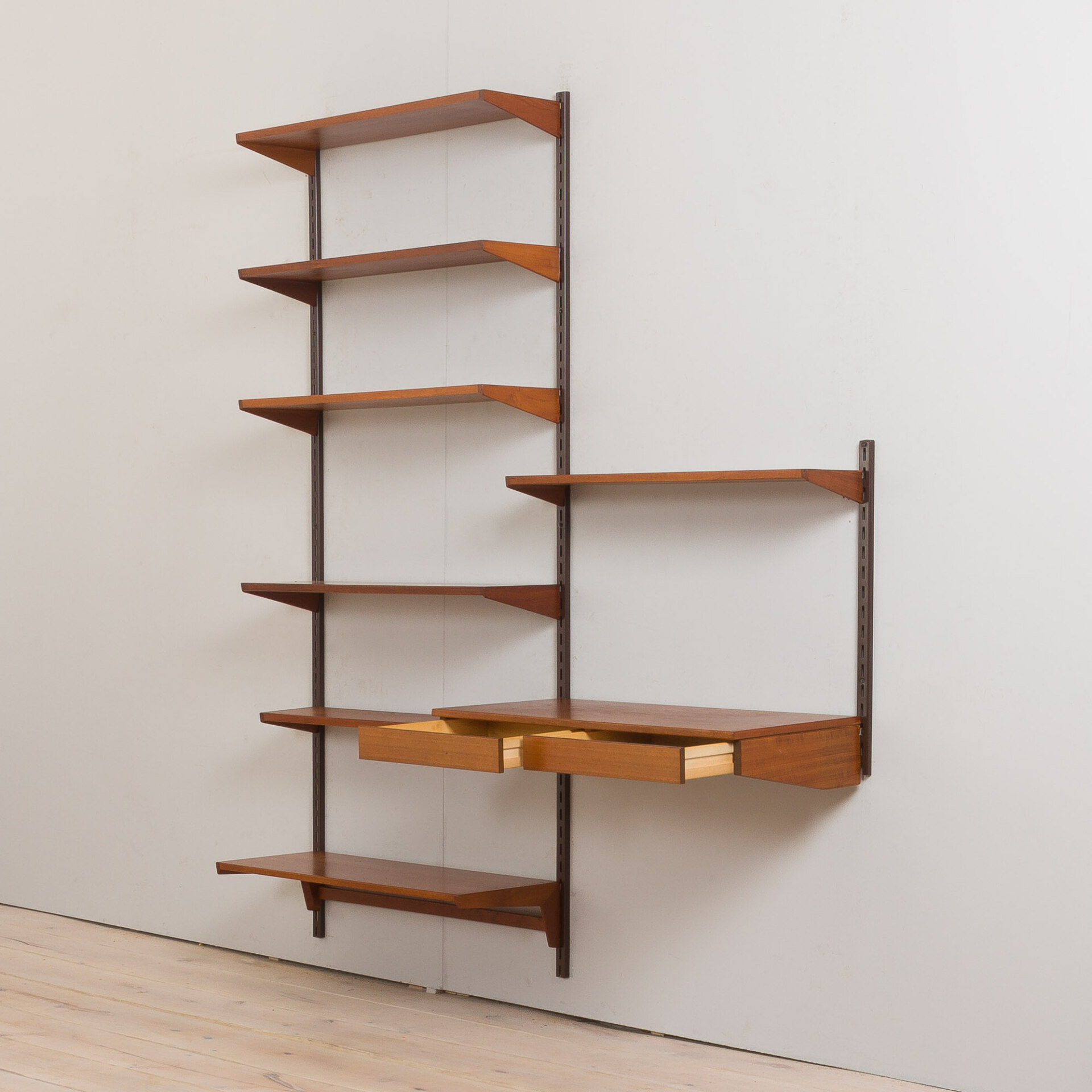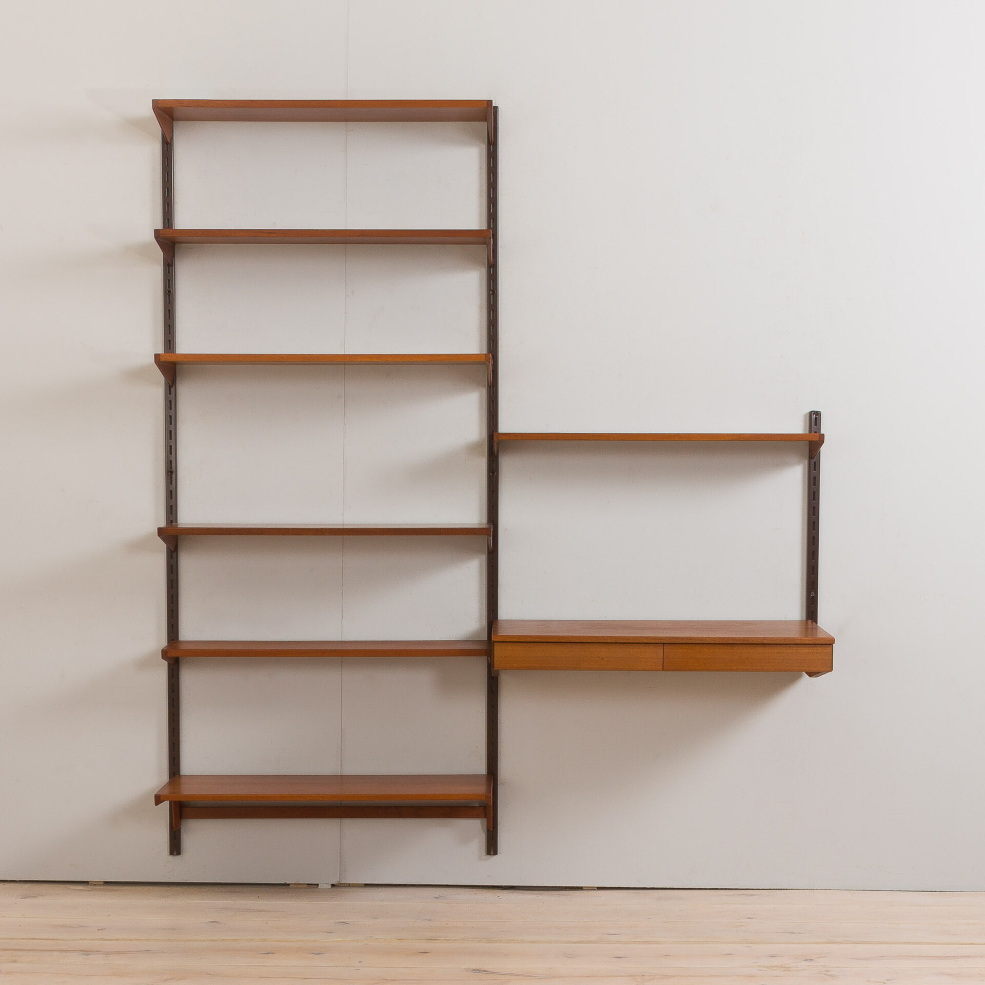Every component is 86 cm wide and can be easily arranged upon one’s will, using a system of metal brackets fitting into the rails. The set is in a very good vintage condition with minimal signs of wear, additionally preserved with Danish Oil.