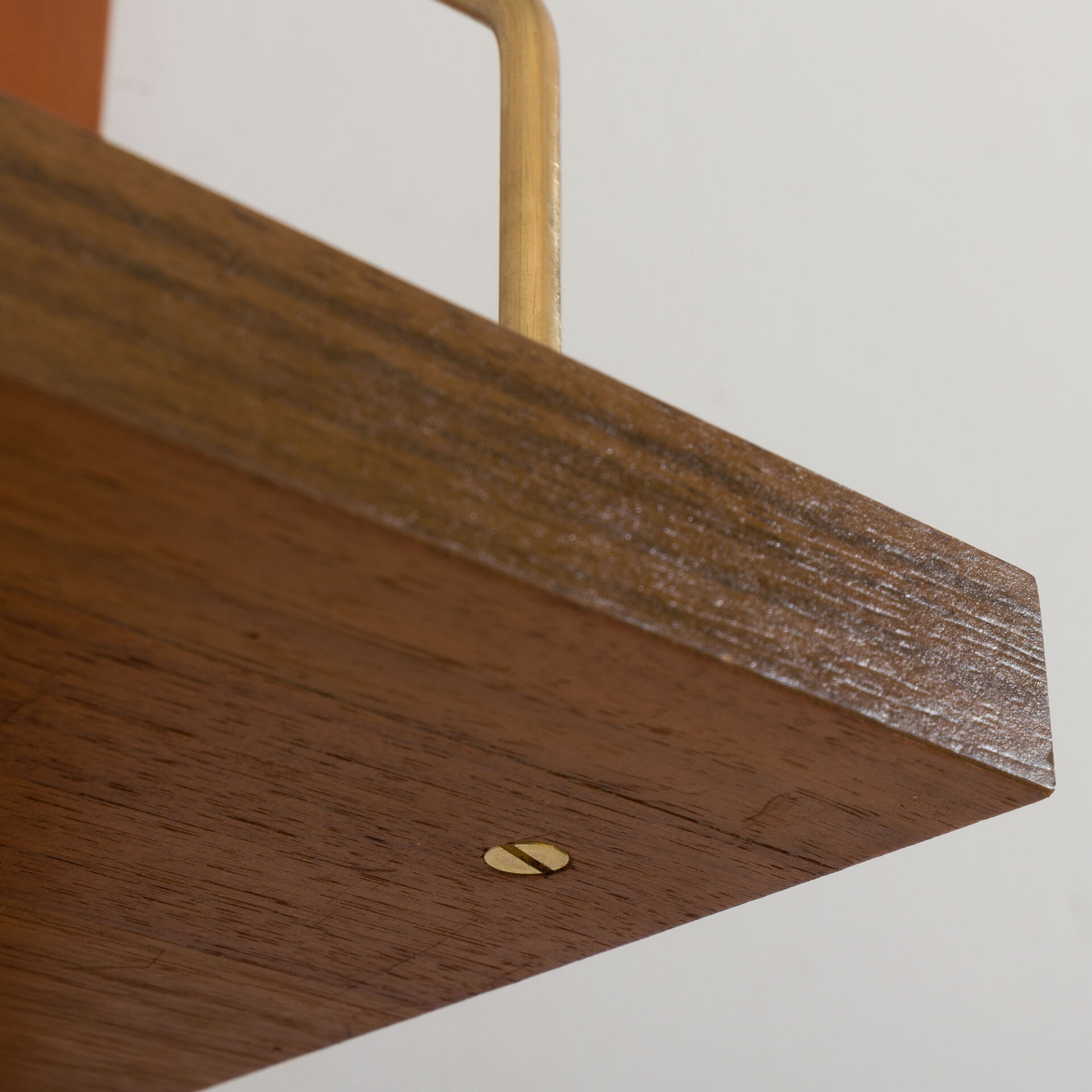 Mid century vintage bookshelves designed in the style of Cadovius/ Sorensen comes from Denmark from the 1960s. It is an entirely modular wall unit with four shelves in teak veneer hanging on by brass hangers on solid wood rails. It can be arranged upon one’s will. This set consists of: