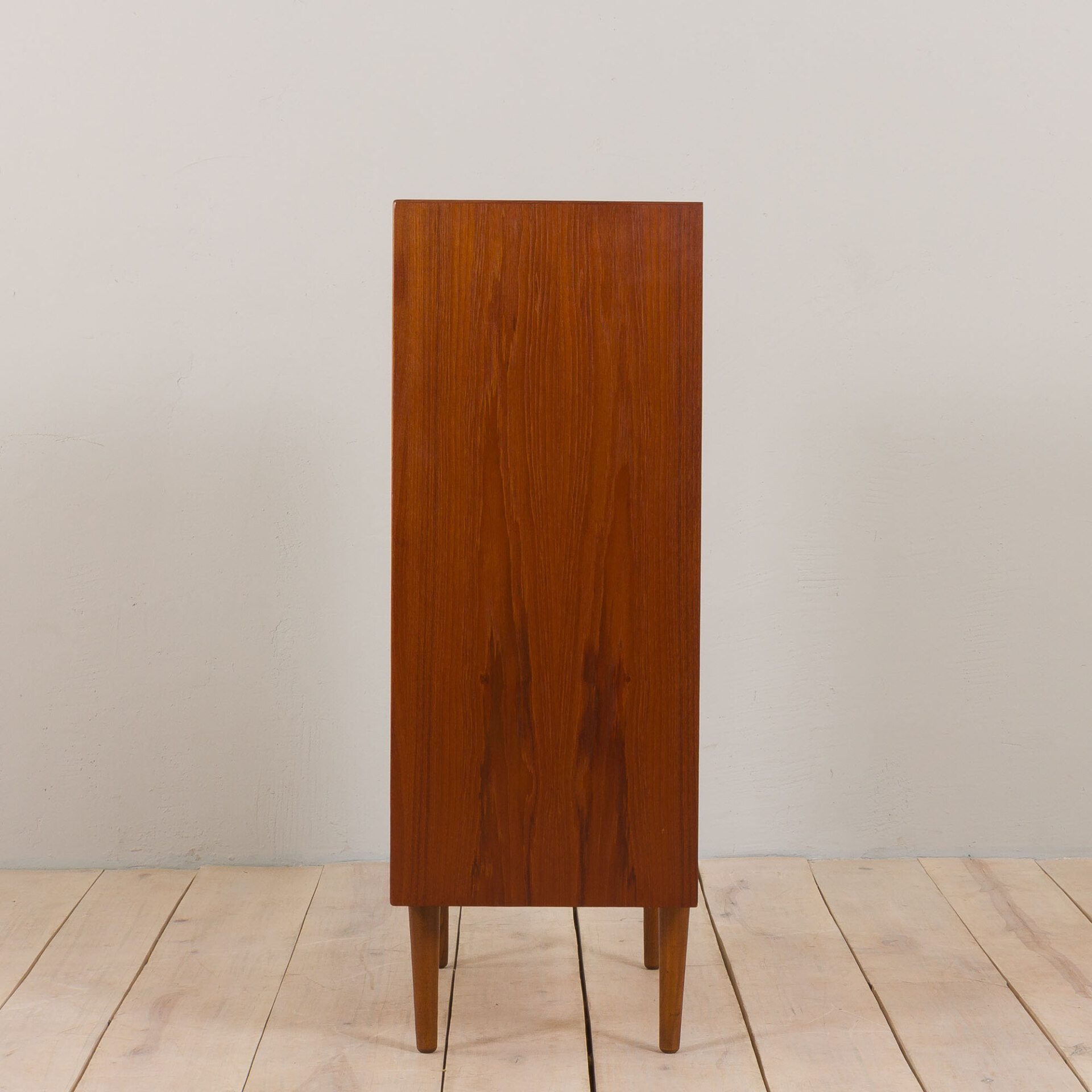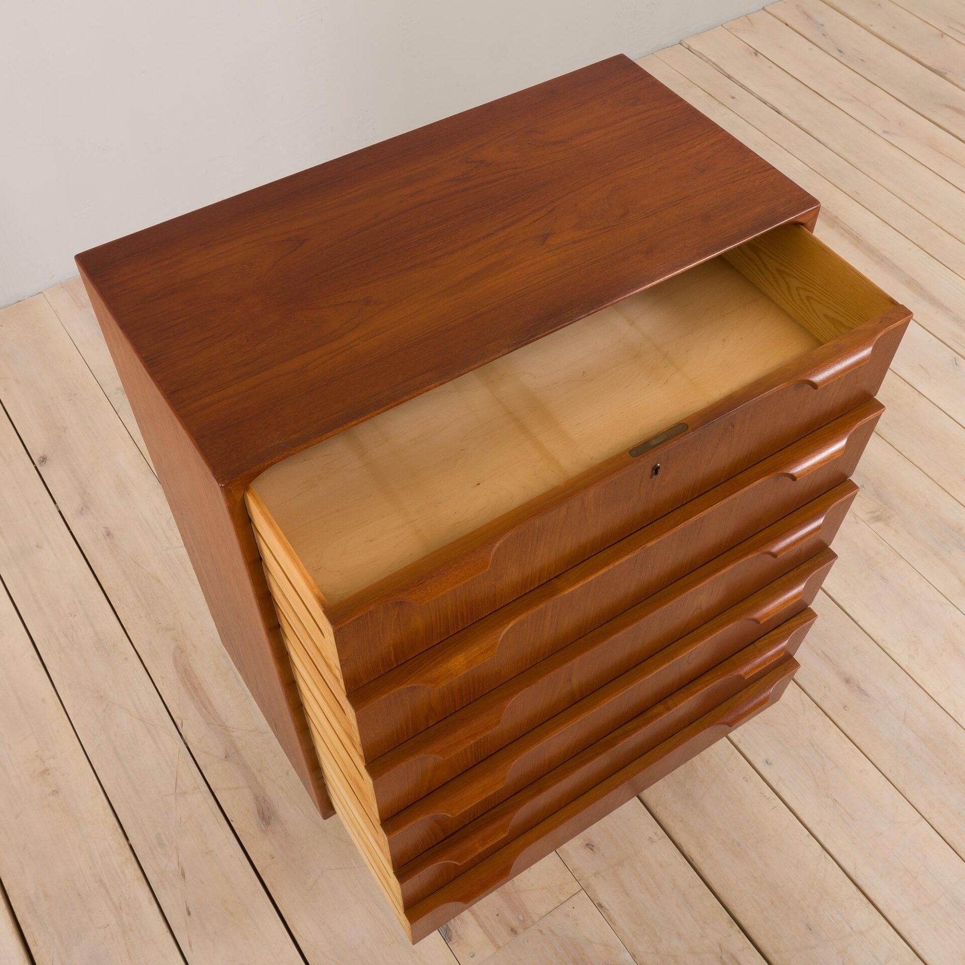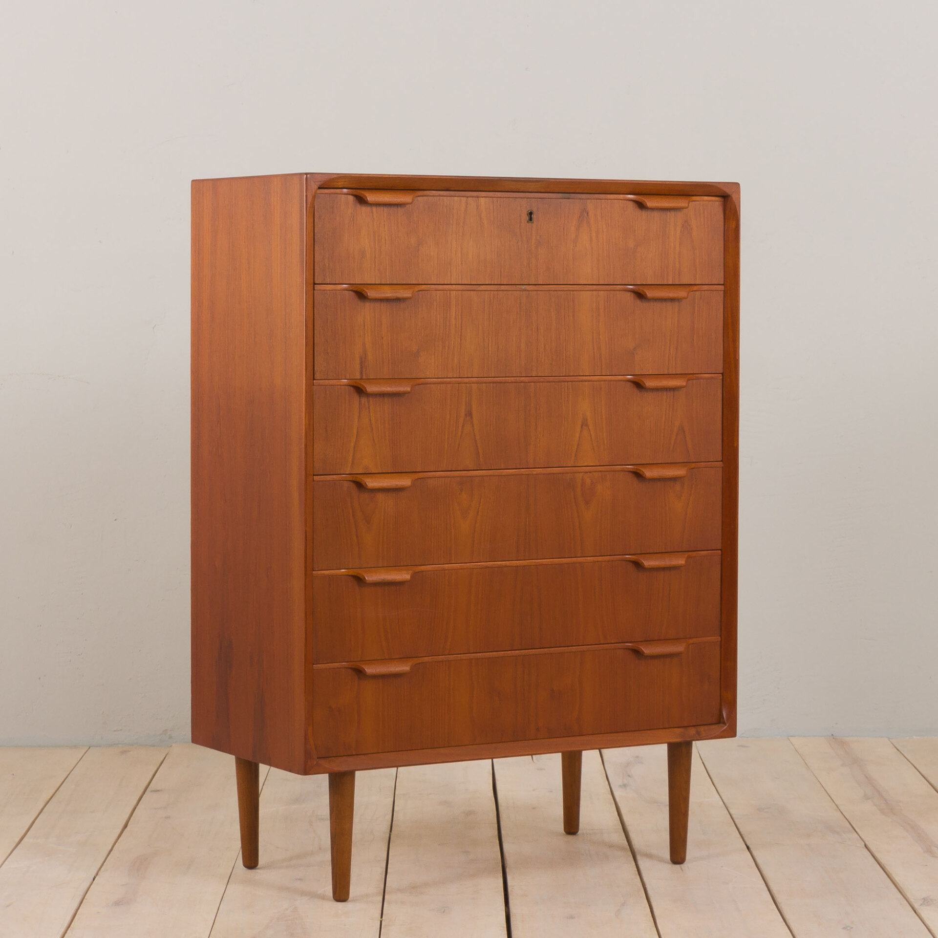 This piece of furniture is a classic Danish vintage dresser designed and manufactured in the 1960s. It features six drawers with solid teak handles that are nicely curved. Some of the carpentry details remind of Johannes Andersen designs from the same period. The top drawer has a lock, but the key is not included. This delightful piece represents perfect carpentry and attention to detail, including beautifully finished edges at the front, continuity of wood grain, and rich colors. The slim, tapered legs made of solid teak emphasize the elegance of the Scandinavian mid-century modern style. It is in great condition with only minor signs of use and a small stain on the top front. The drawers slide smoothly. The wood has been preserved with an additional layer of Danish Oil.