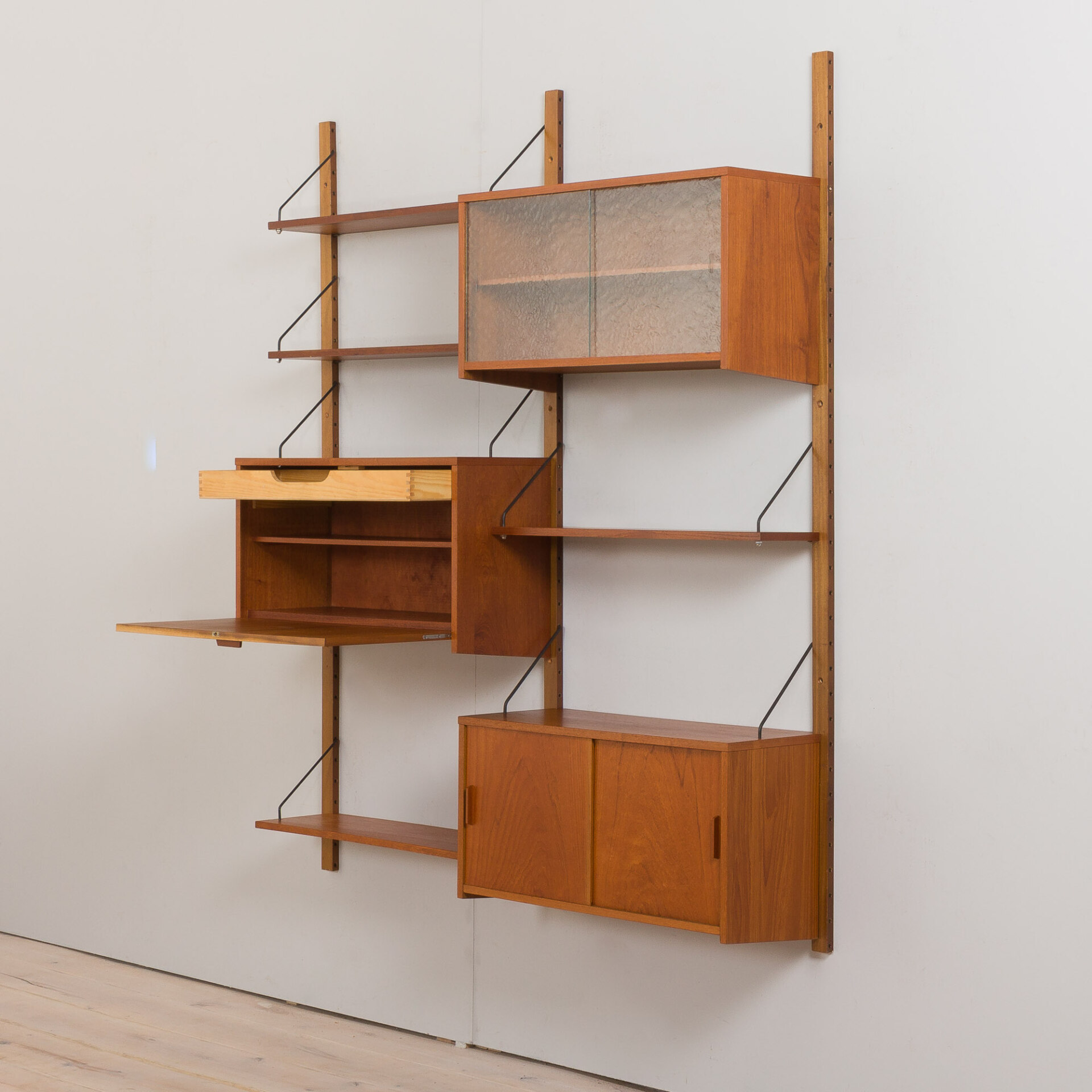 This modular teak bookcase with secretaire can perfectly create an unobtrusive home office space in the living room. The vintage wall unit was designed and manufactured in Denmark in the 50s/60s and closely remains the Cadovius design from the same period. Three cabinets and four shelves will provide enough space for storage, books, and decorations. A cabinet with bark glasses adds additionally elegance to the set.