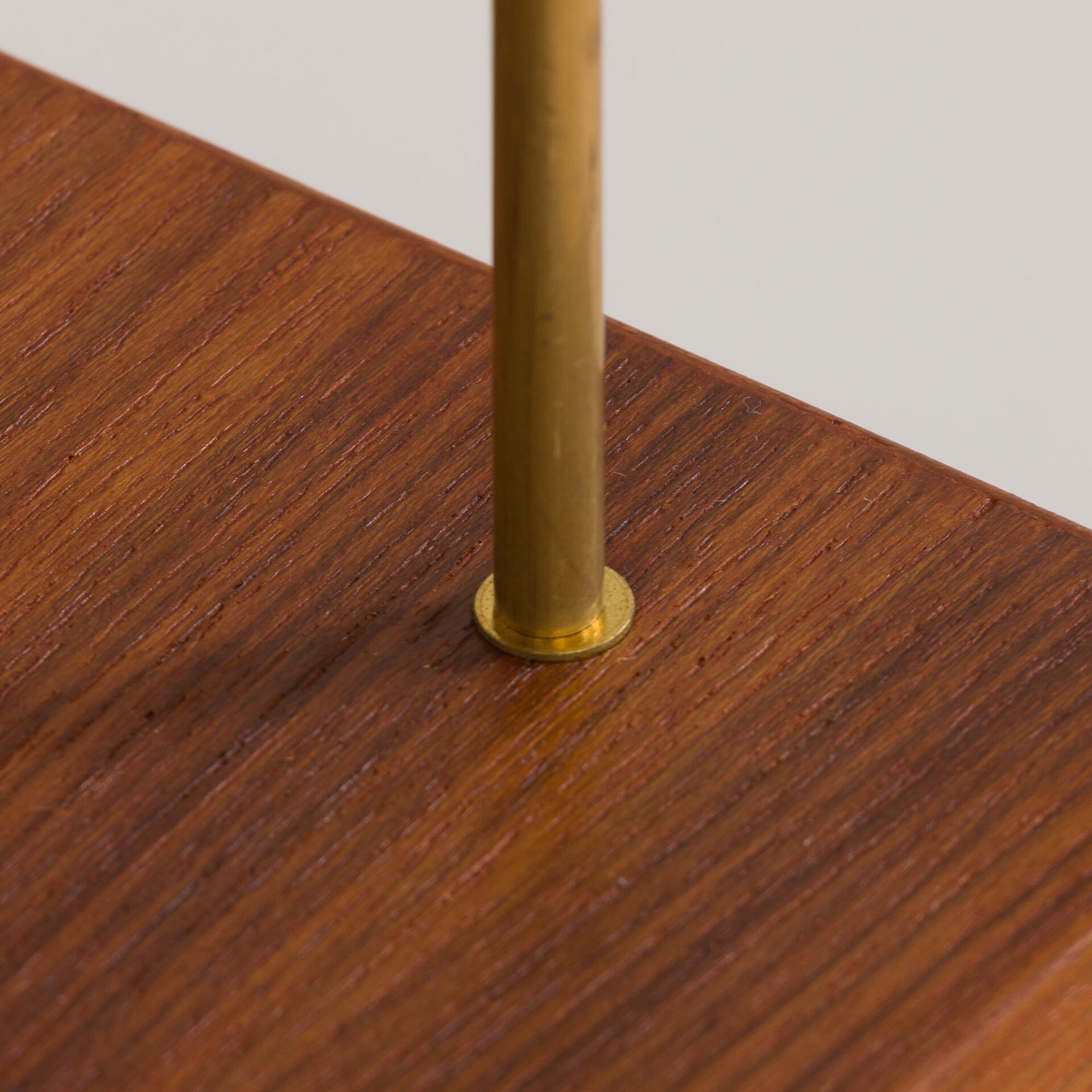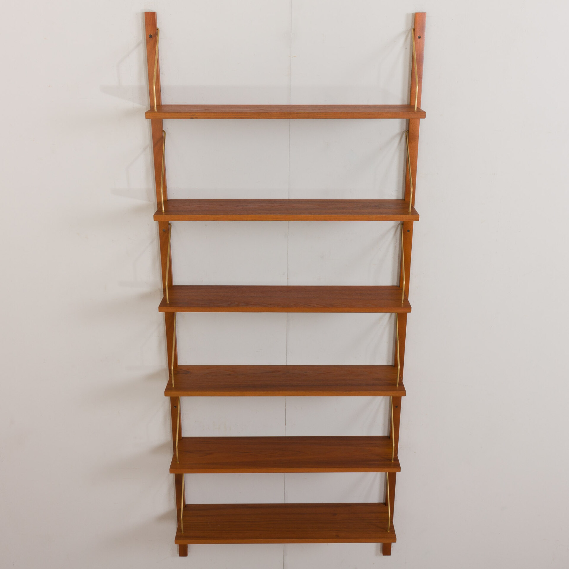 Simple yet elegant, Danish vintage teak wall unit designed in the style of Cadovius or Sorensen. This wall unit is an entirely modular shelving system with six shelves in teak veneer hanging on brass hangers and solid wood rails. It can be arranged upon one’s will. This set consists of: