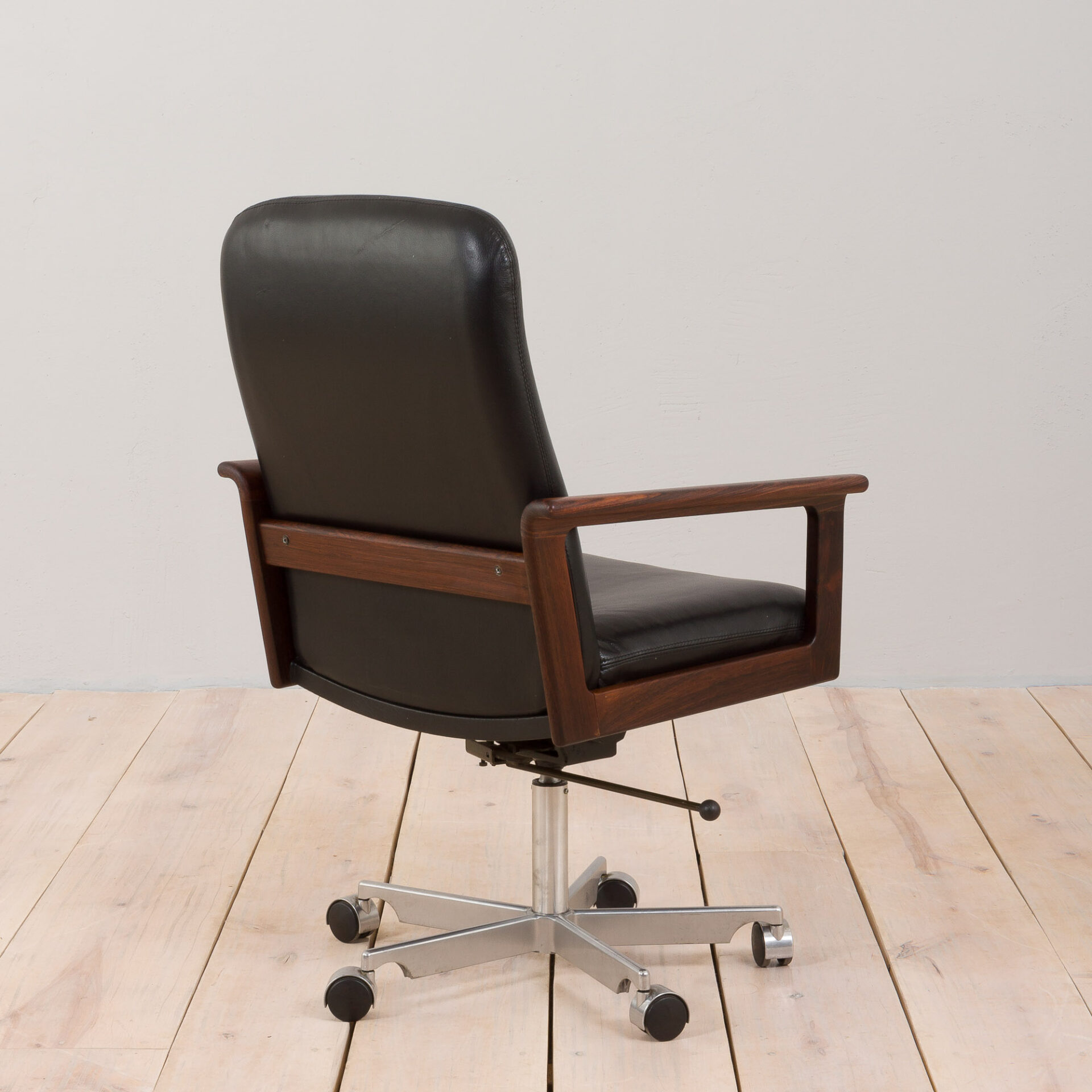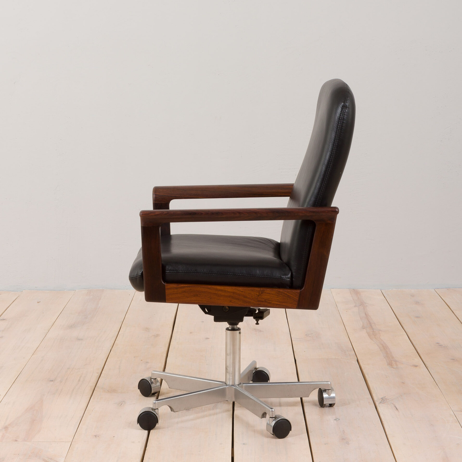 This stunning mid-century modern executive armchair was designed by Erik Kirkegaard for Høng Stolefabrik in Denmark in the 1960s and is a rare piece of Danish Design. The chair has solid rosewood arms and frame and new black leather upholstery. It is based on a chrome base on casters and reclines back and forward plus up and down. Excellent condition with minor traces of use related to its age and new upholstery and foams.