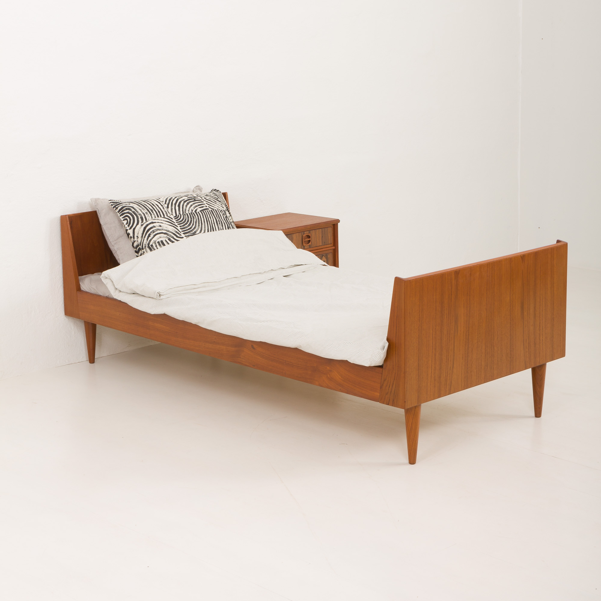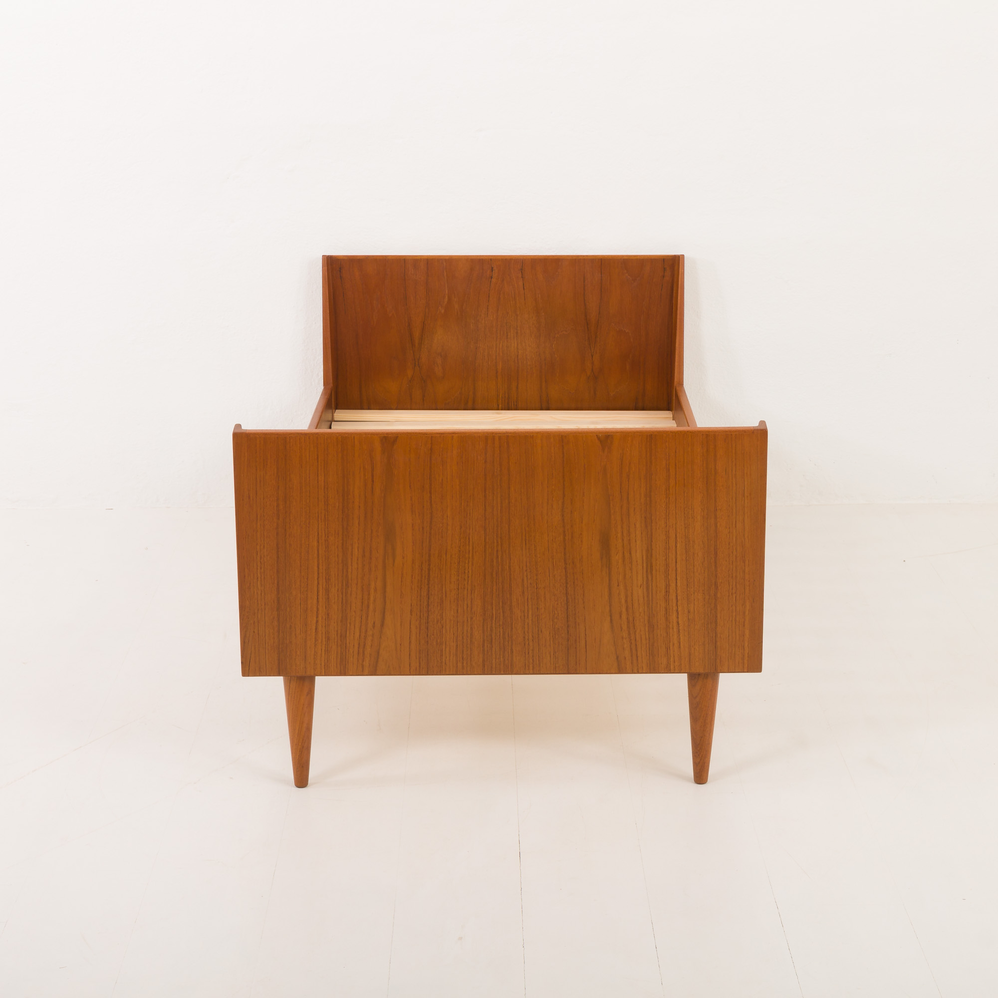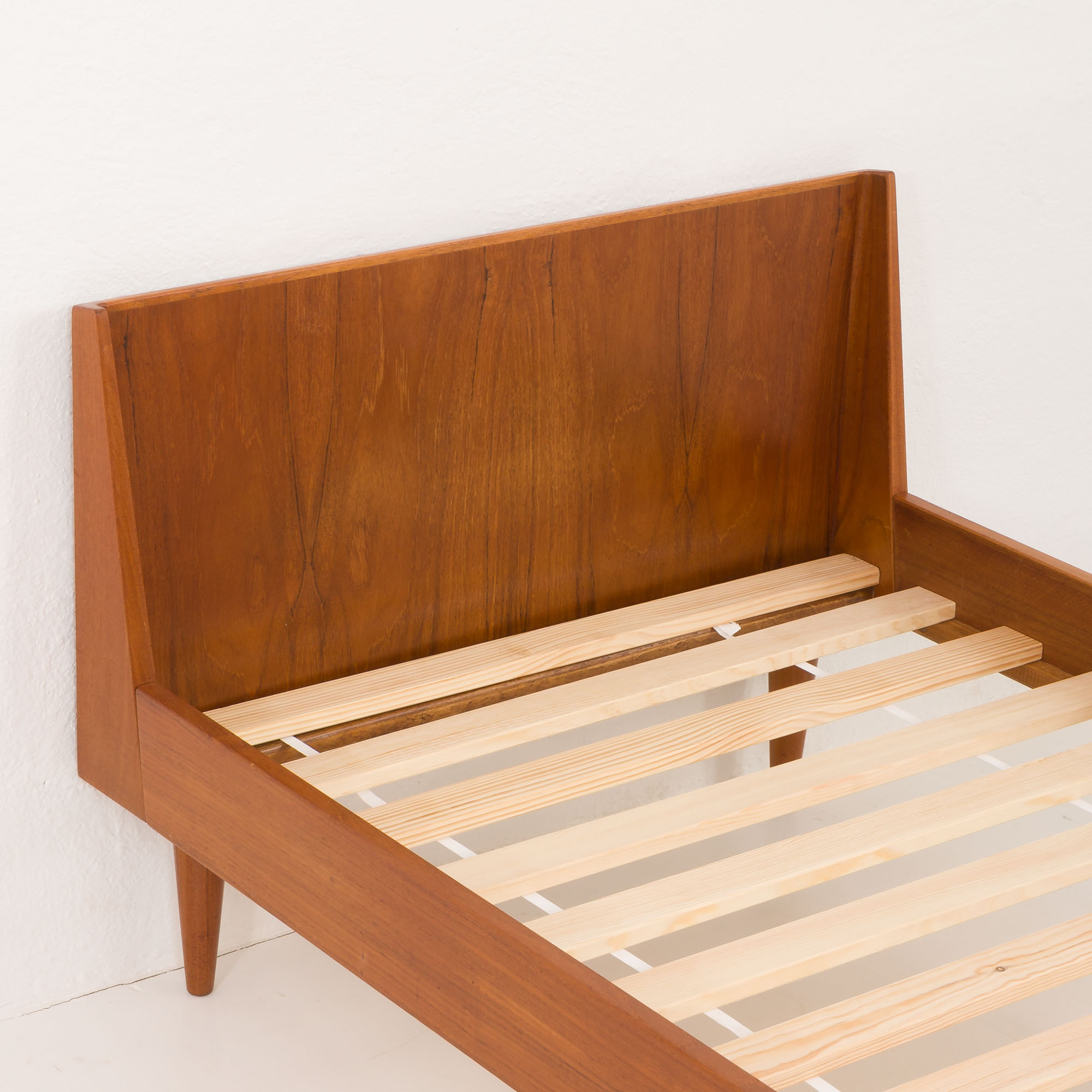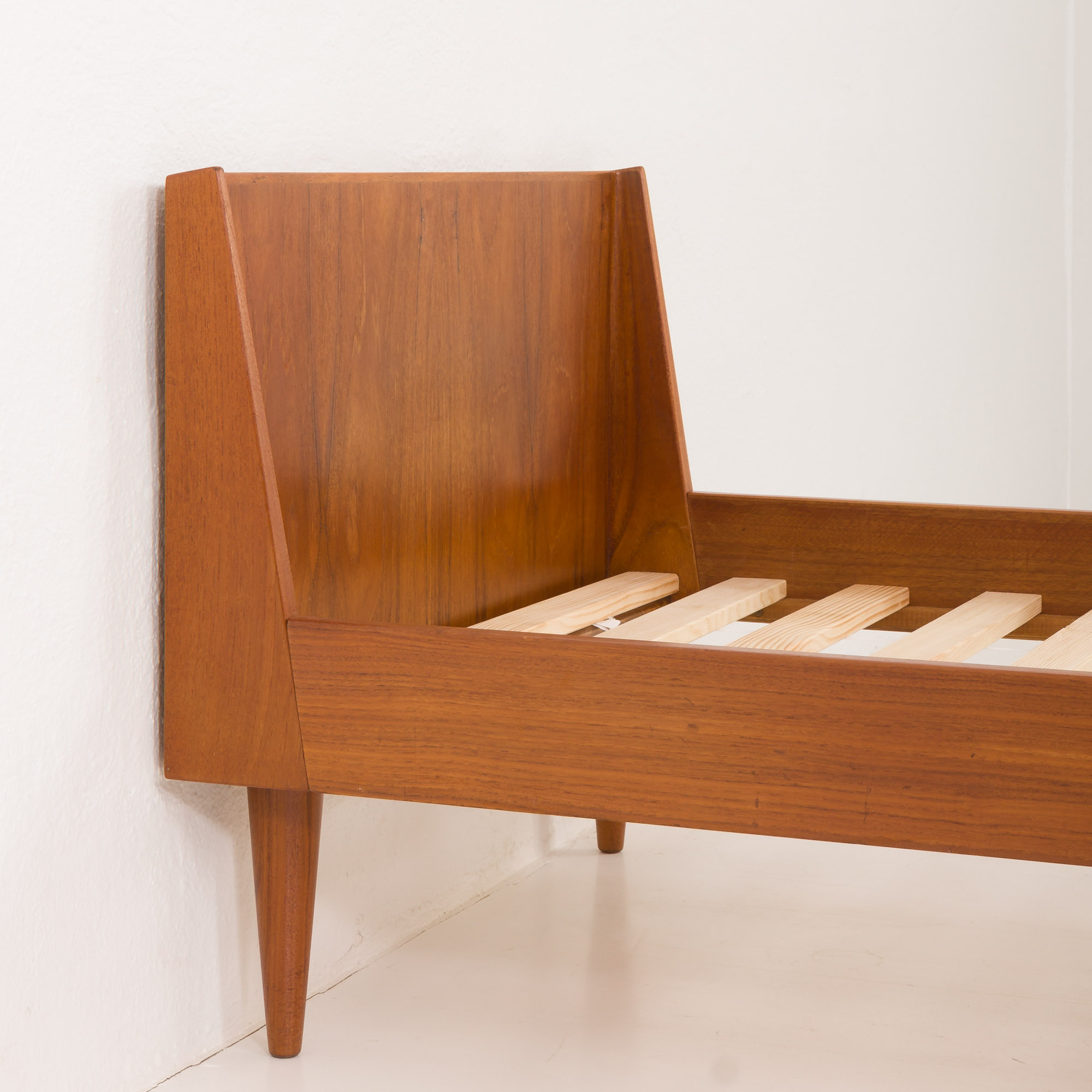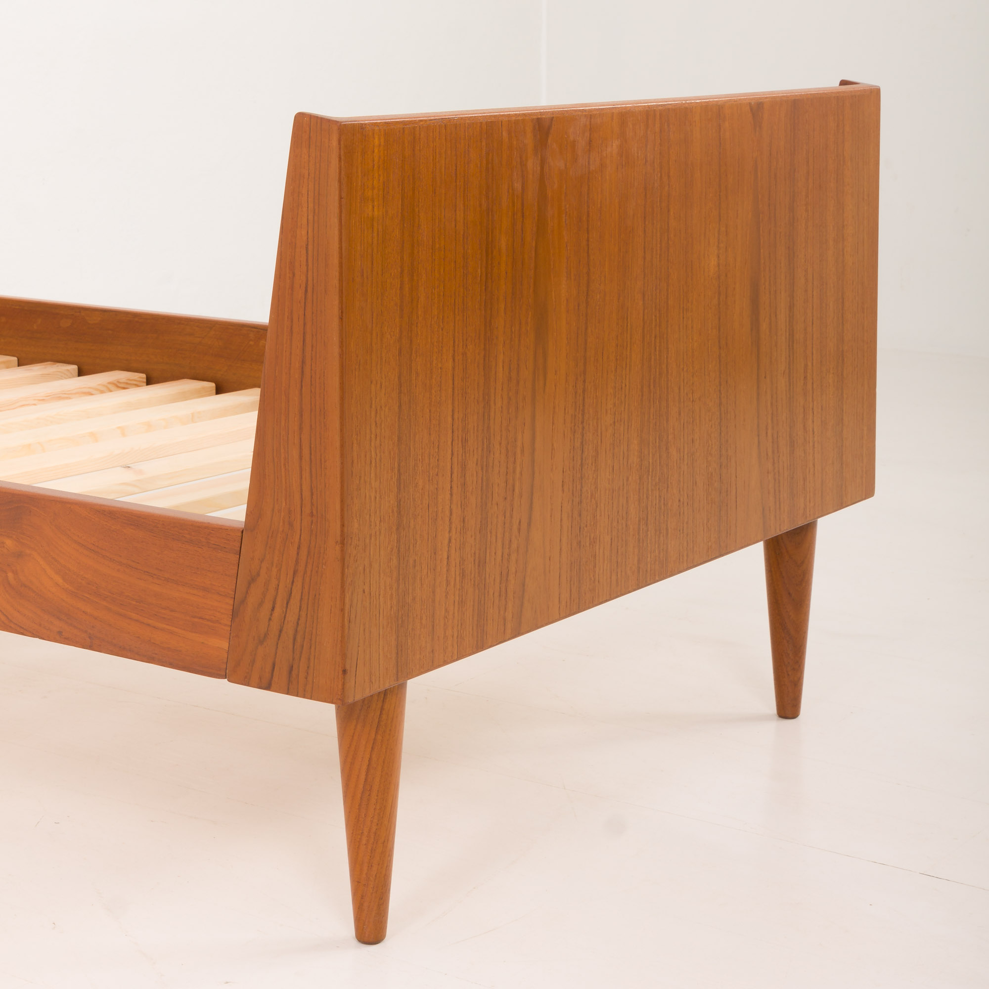 Crafted with precision, the bed highlights the quality of the teak wood, known for its durability and rich, warm tones. This piece represents high-quality construction and timeless design, making it a solid choice for anyone who values mid-century Danish furniture.