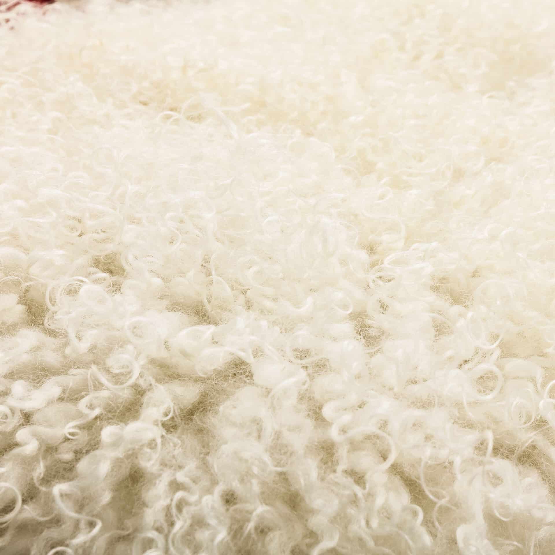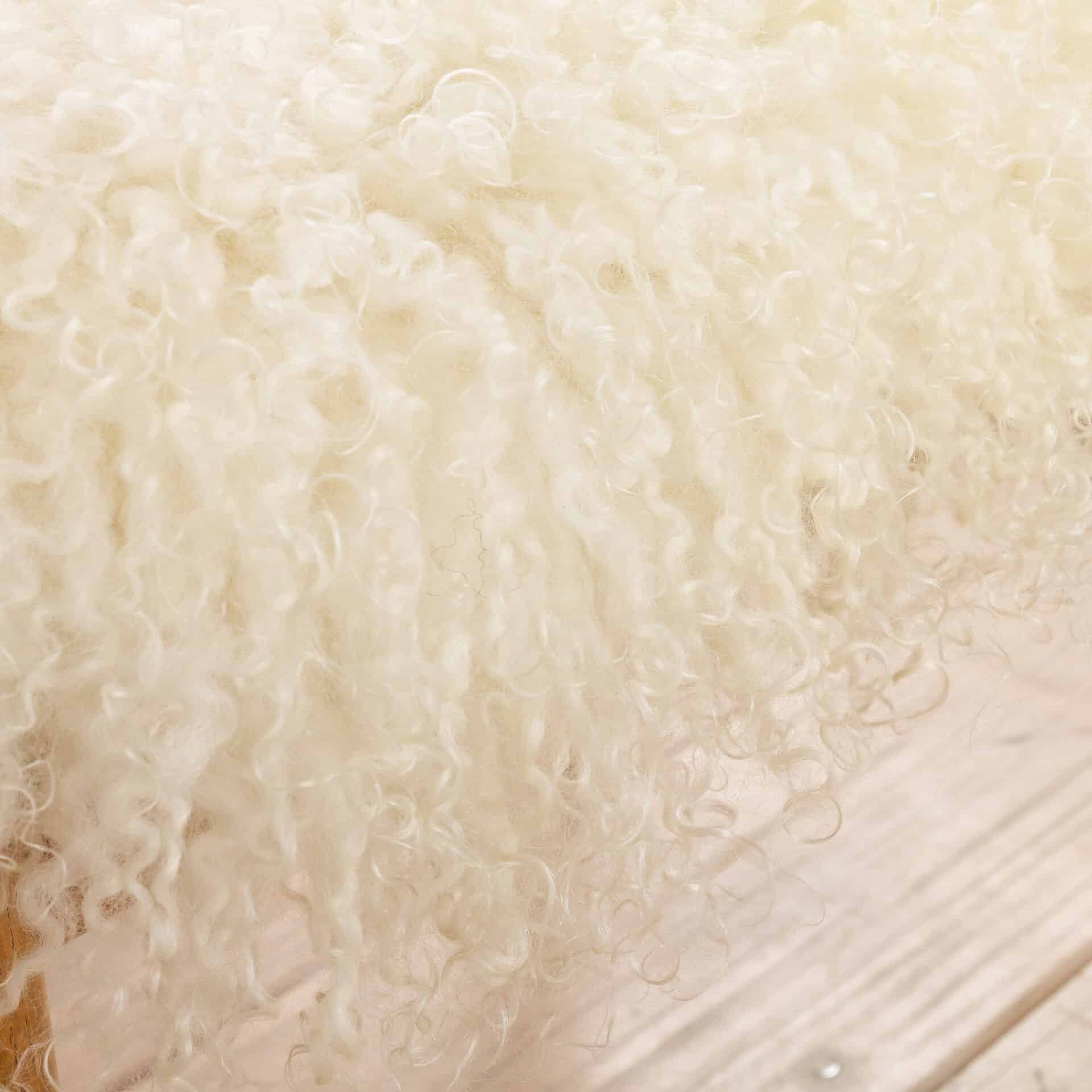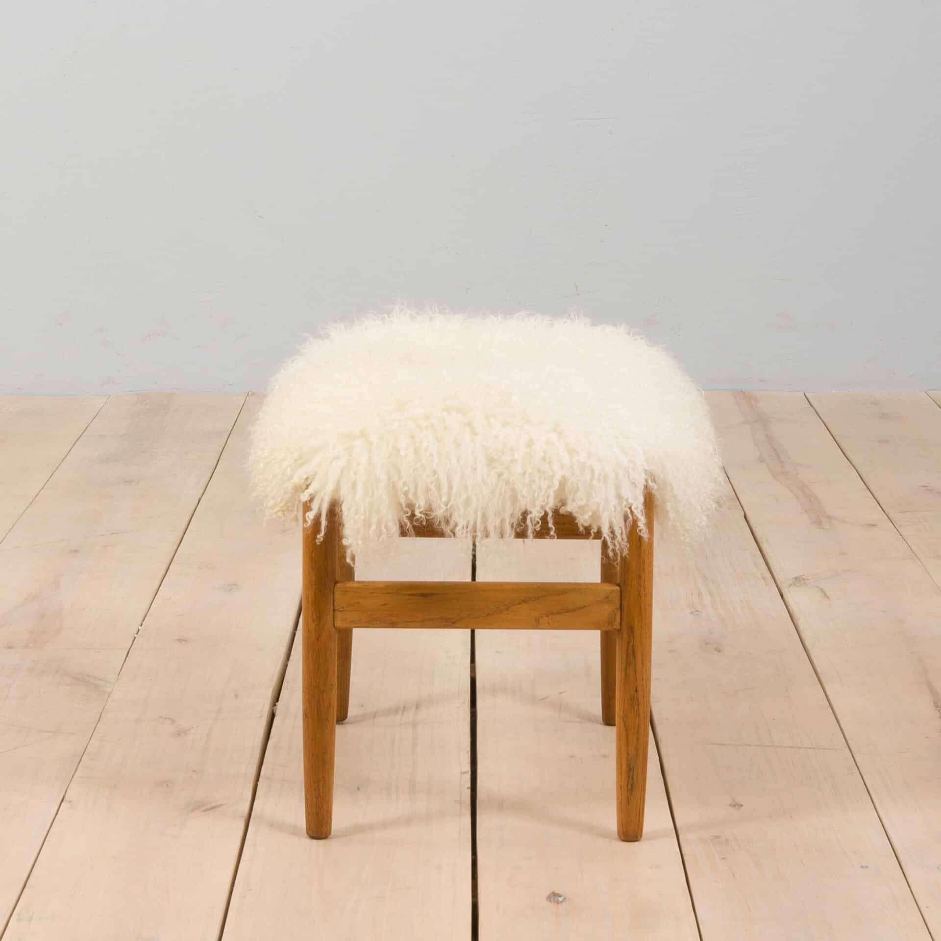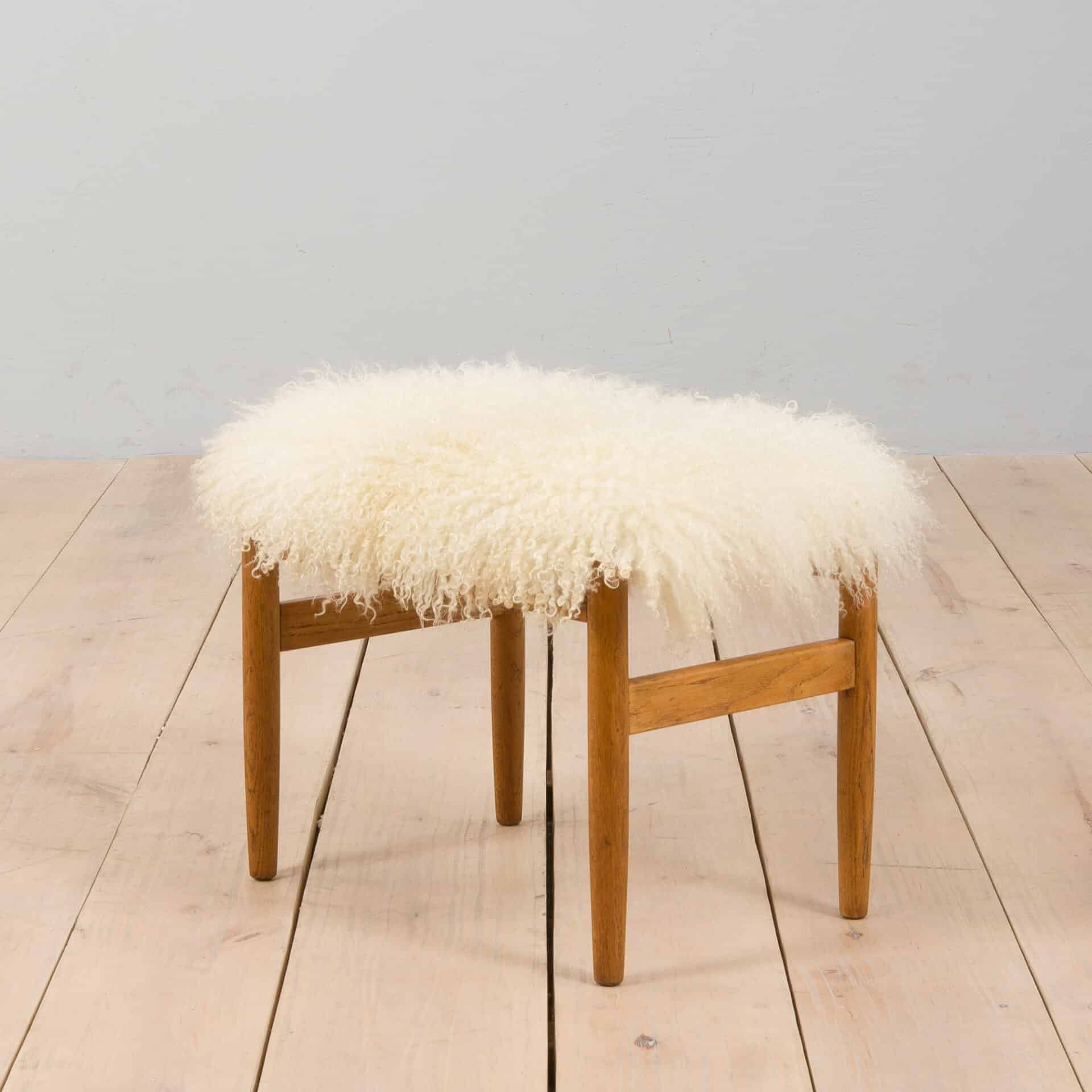 Danish mid century solid oak footstool in long sheepskin wool, 1970s