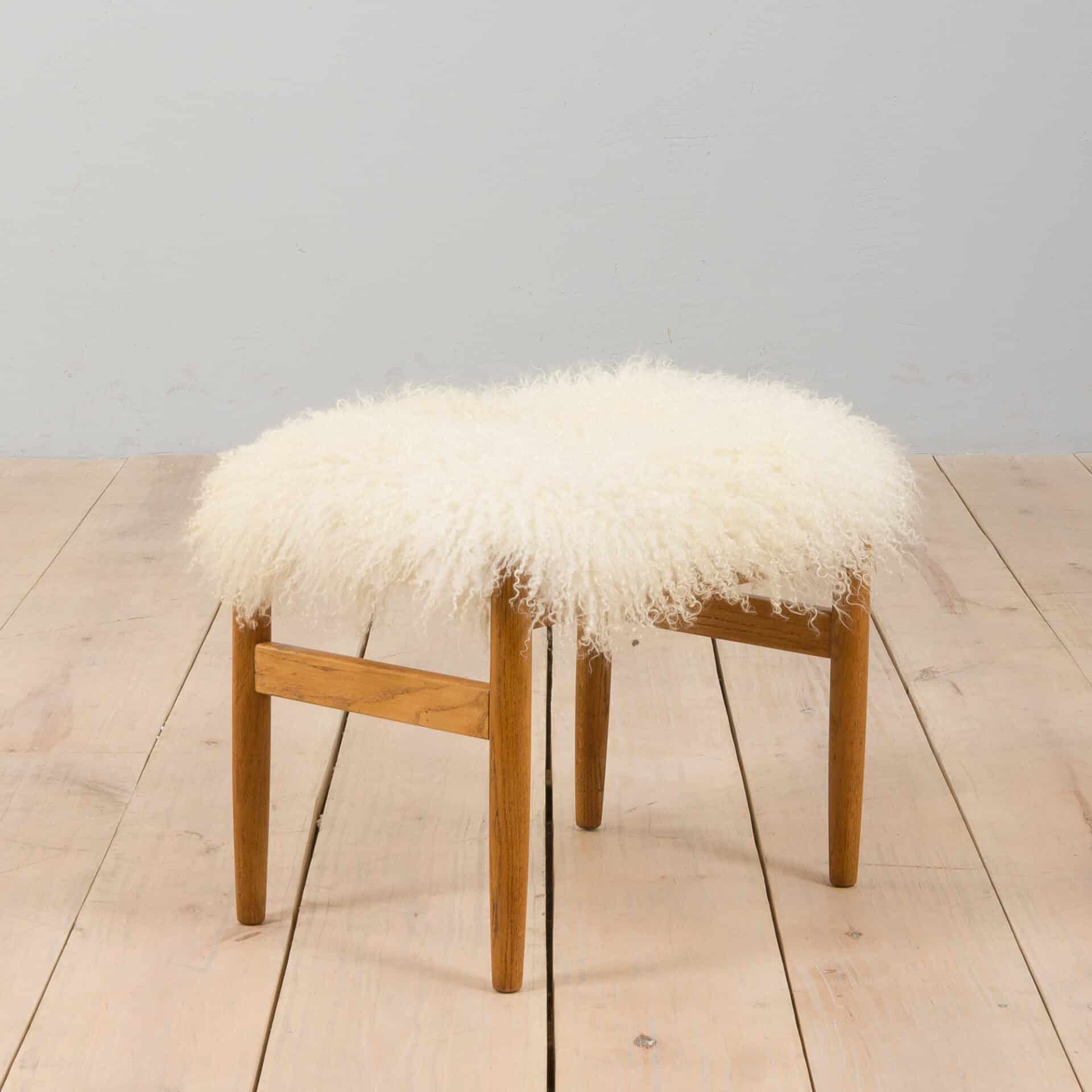 Simple yet stunning, the Danish footstool designed in the 1960s. Reupholstered with white natural long hair sheepskin. The solid oak legs provide elegance and coziness typical for Danish mid-century design. Works perfectly with a fabric or leather upholstered armchair and will give a truly vintage mid-century feeling to any interior. Overall, in fantastic condition, the wood in original condition.