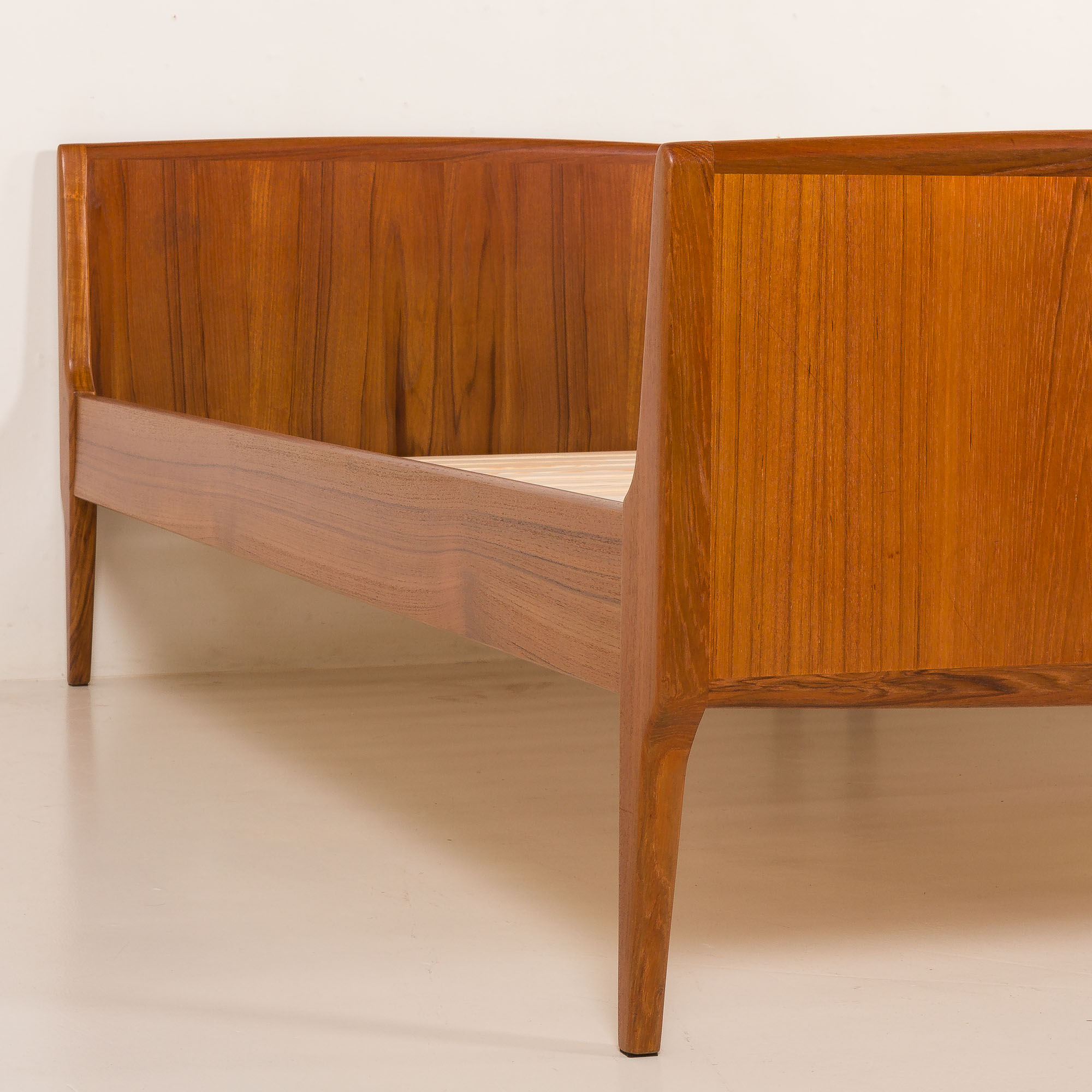 The beds rests on solid teak legs, giving it a light, floating appearance despite its robust construction. Its minimal design allows it to blend seamlessly with both vintage and contemporary interiors.