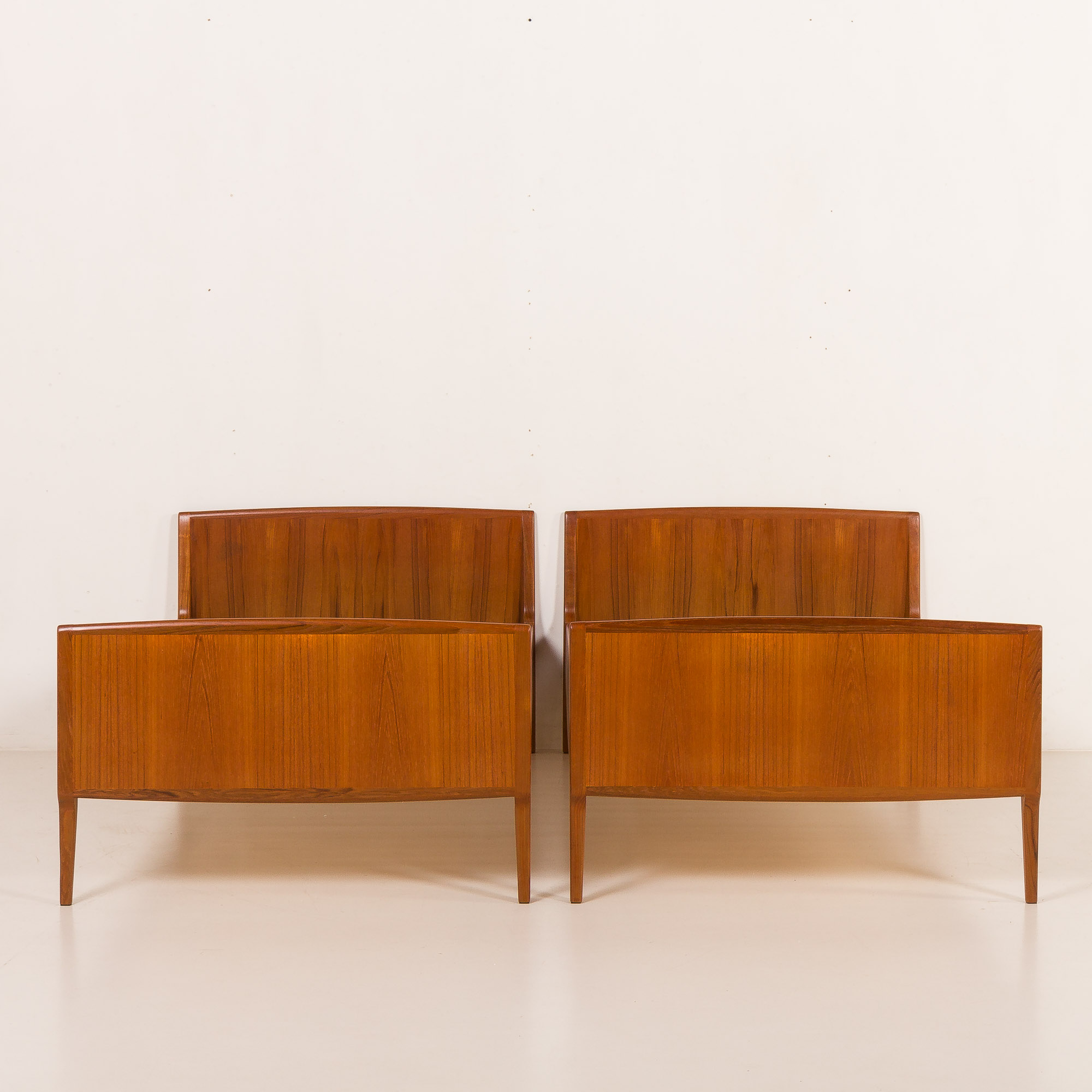 These beds feature a sleek, minimalist silhouette with a sturdy teak frame showcasing the warm tones and rich grain patterns. Constructed with exceptional attention to detail, the joinery and transitions between elements reveal the craftsmanship for which Danish modern design is renowned.