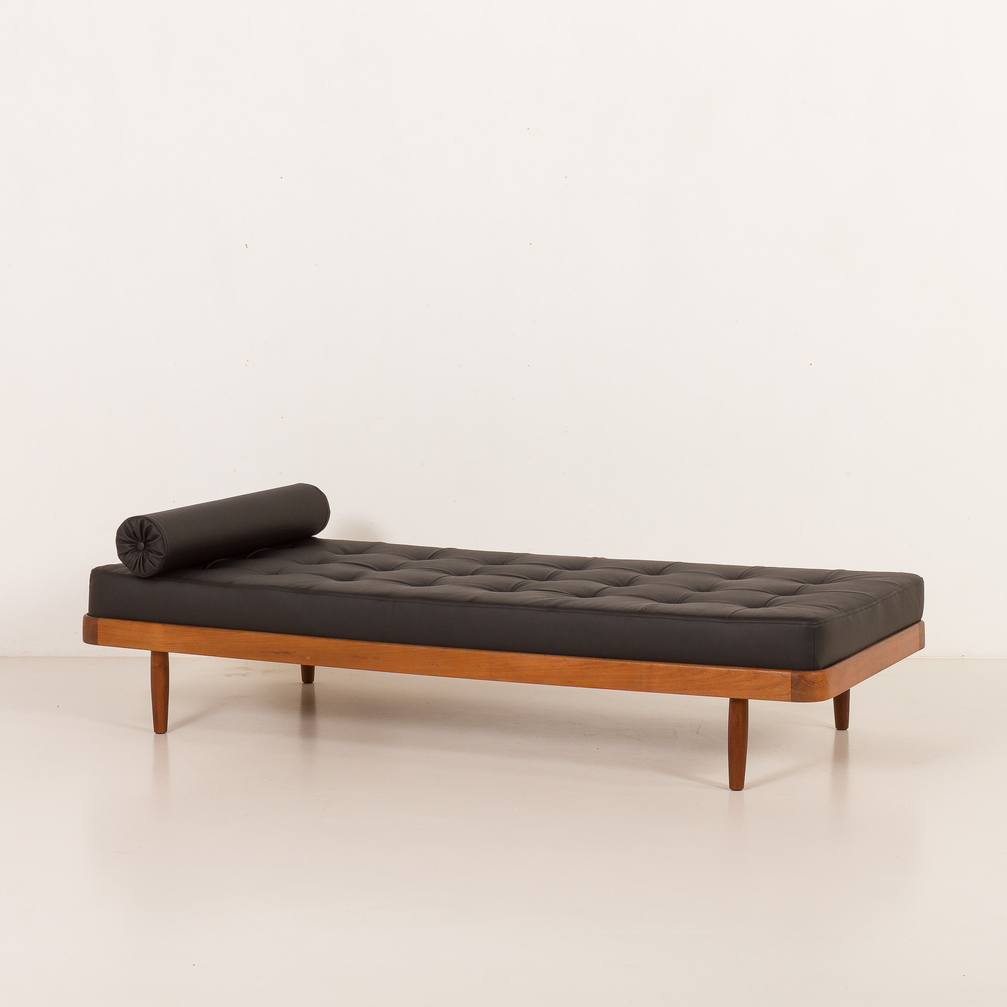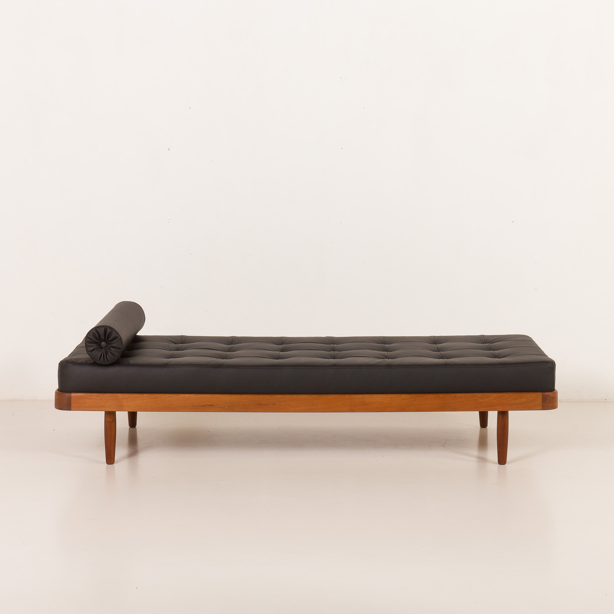 A decorative bolster enhances its elegance and complements the overall design beautifully. Traditionally crafted quilted mattress in black leather with new foam inside—ideal for contemporary interiors often filled with synthetic materials. A nicely profiled wooden frame with gently rounded corners not only keeps the mattress stable but also perfectly harmonizes with the upholstery, creating a timeless design.