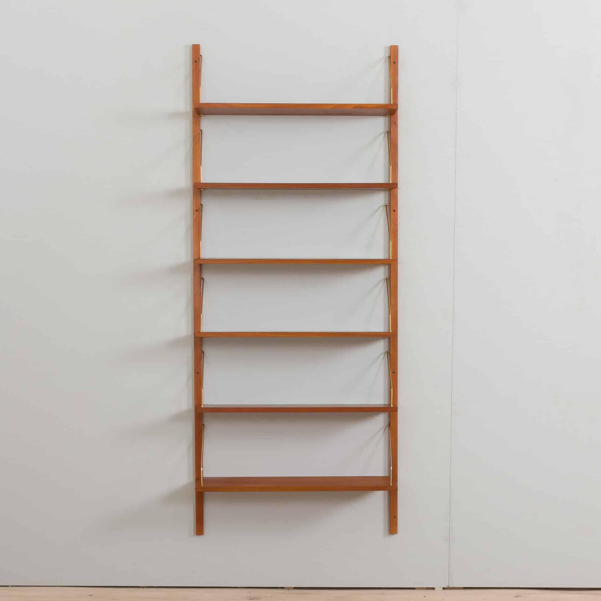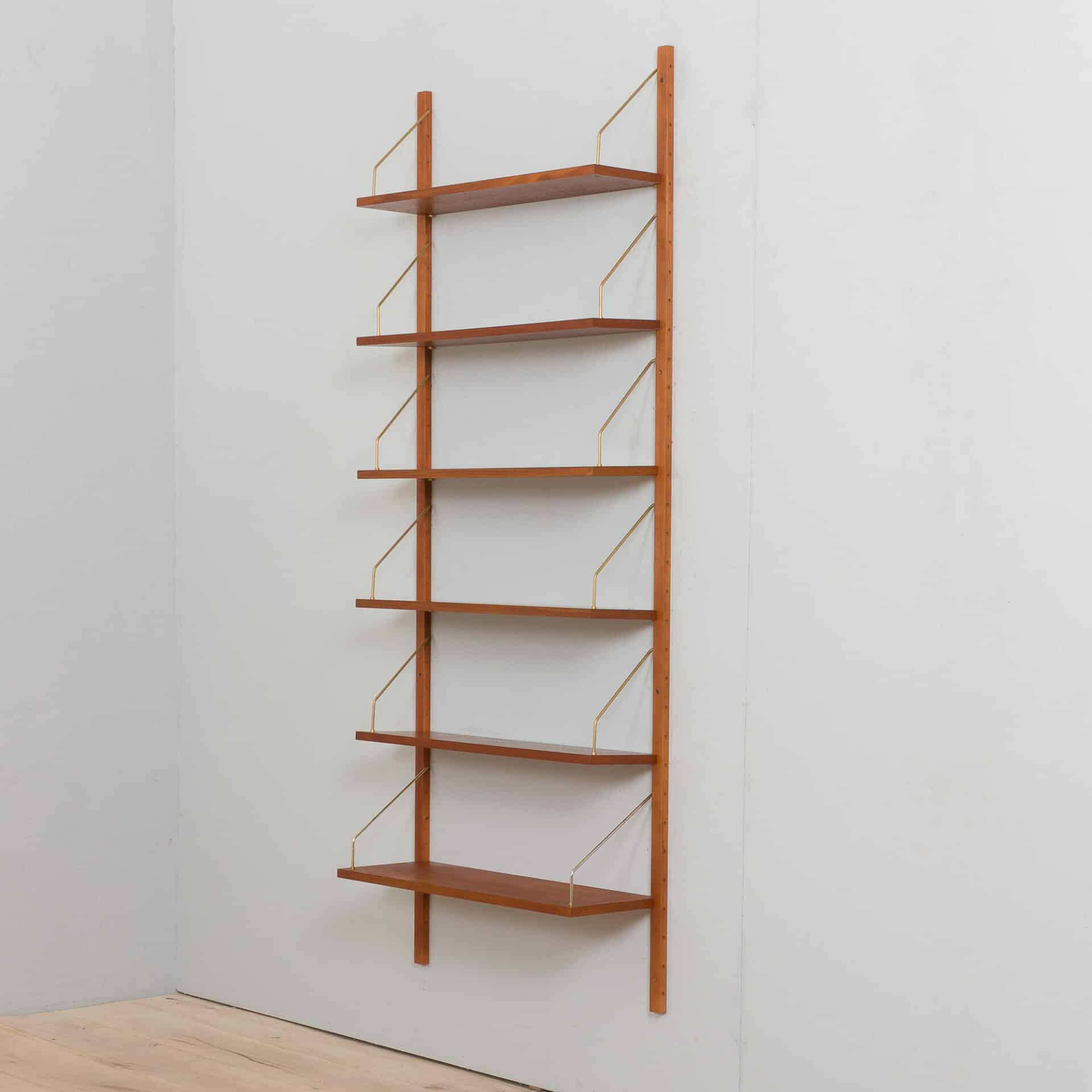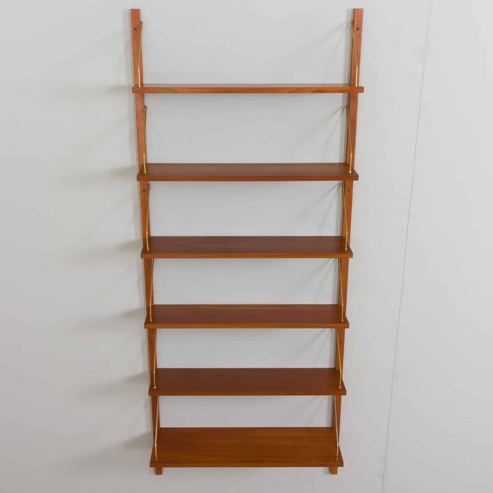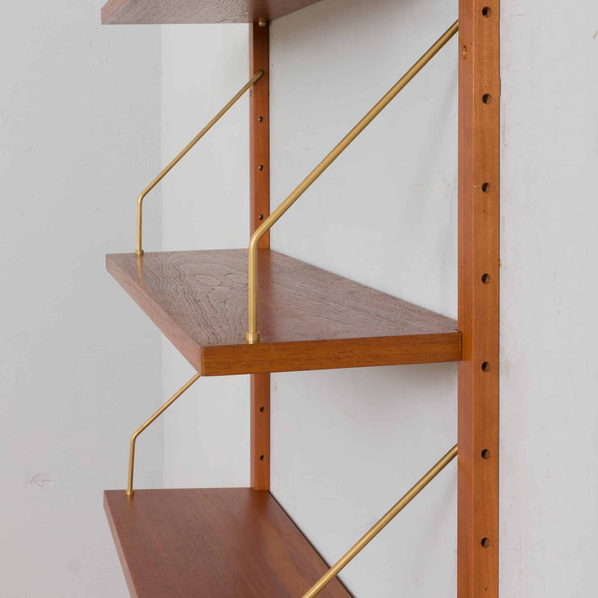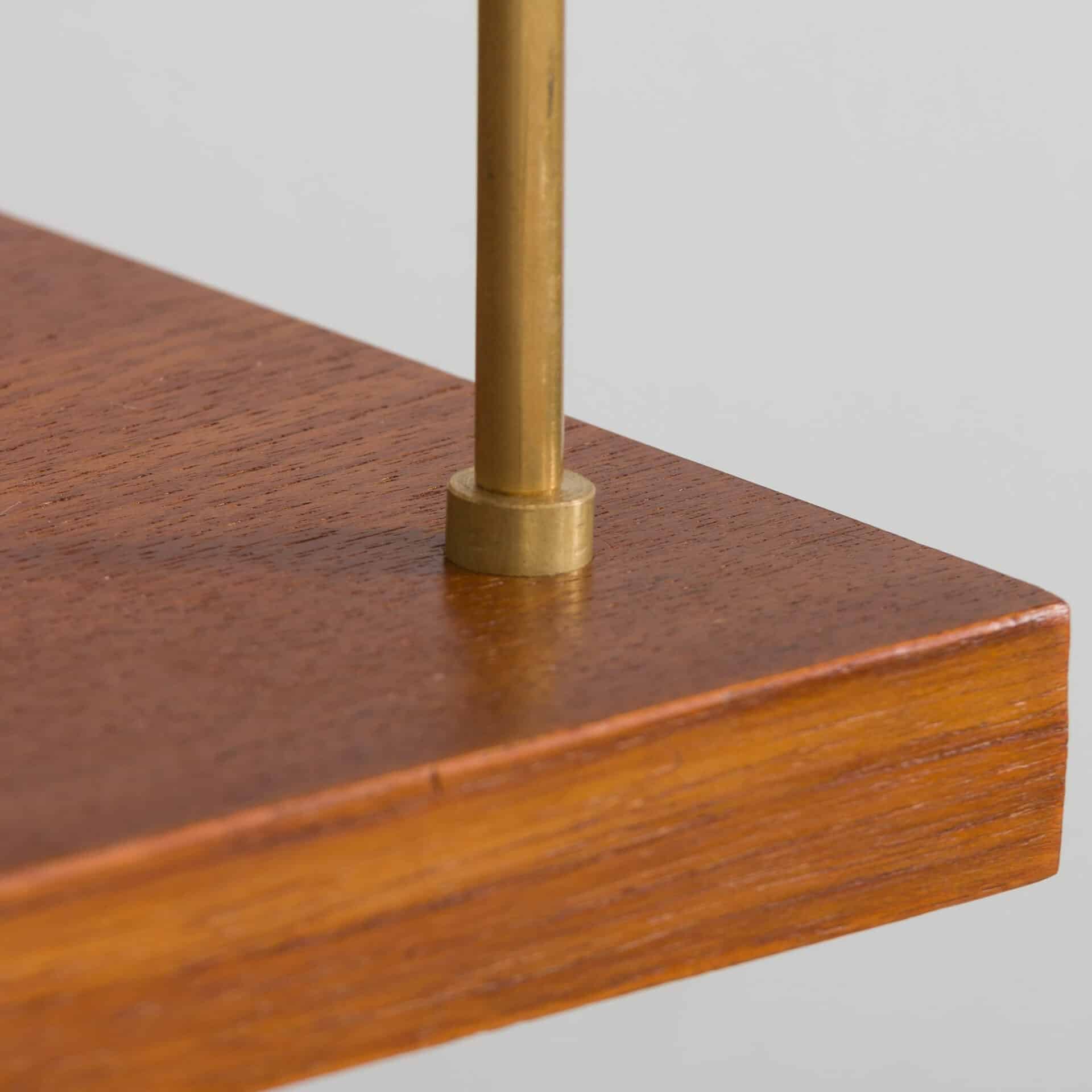 The unit consists of six teak veneered shelves and two solid wood rails, they hang on solid solid brass hangers. The shelves are fully adjustable, one can place them lower or higher. There are holes in the rails every 5 cm.