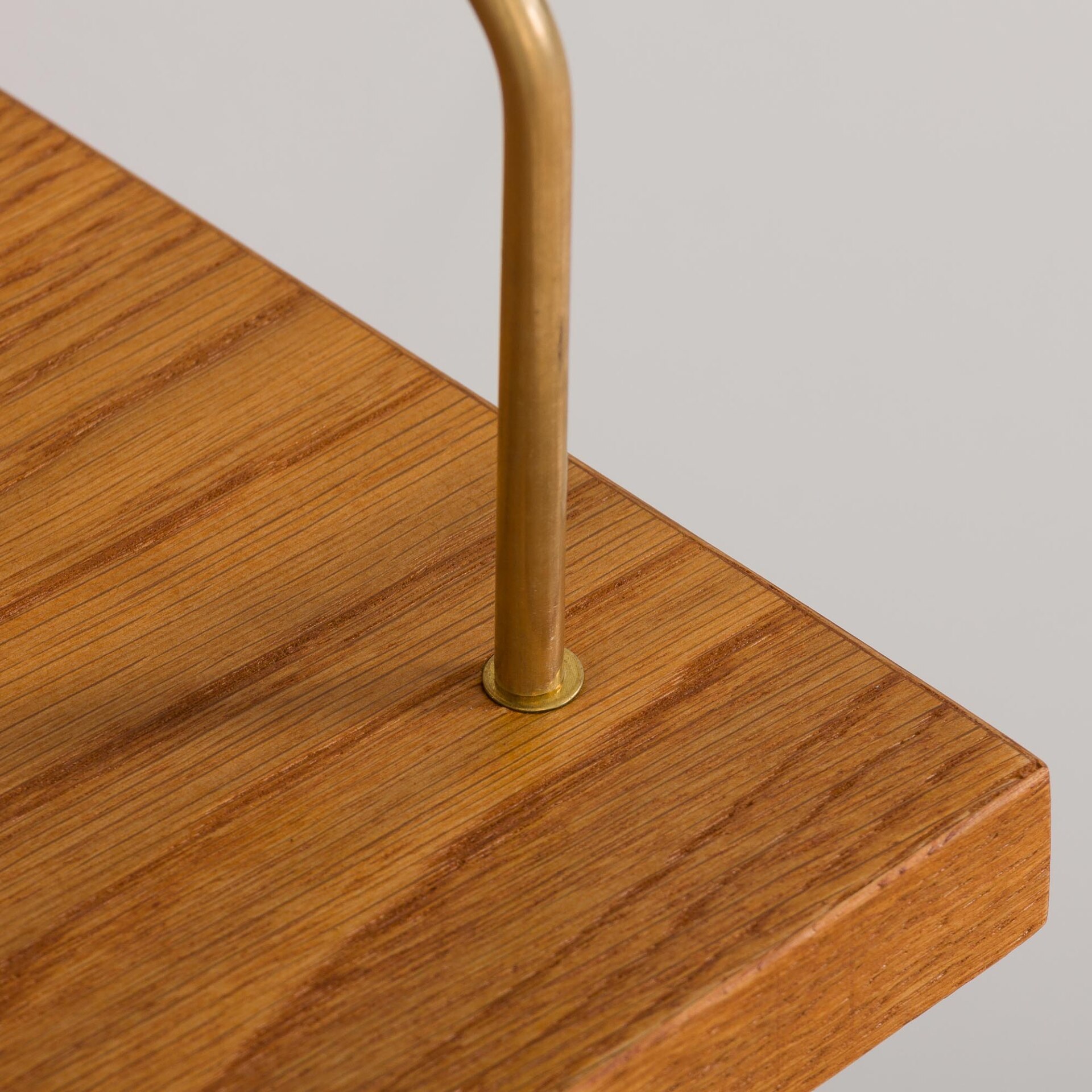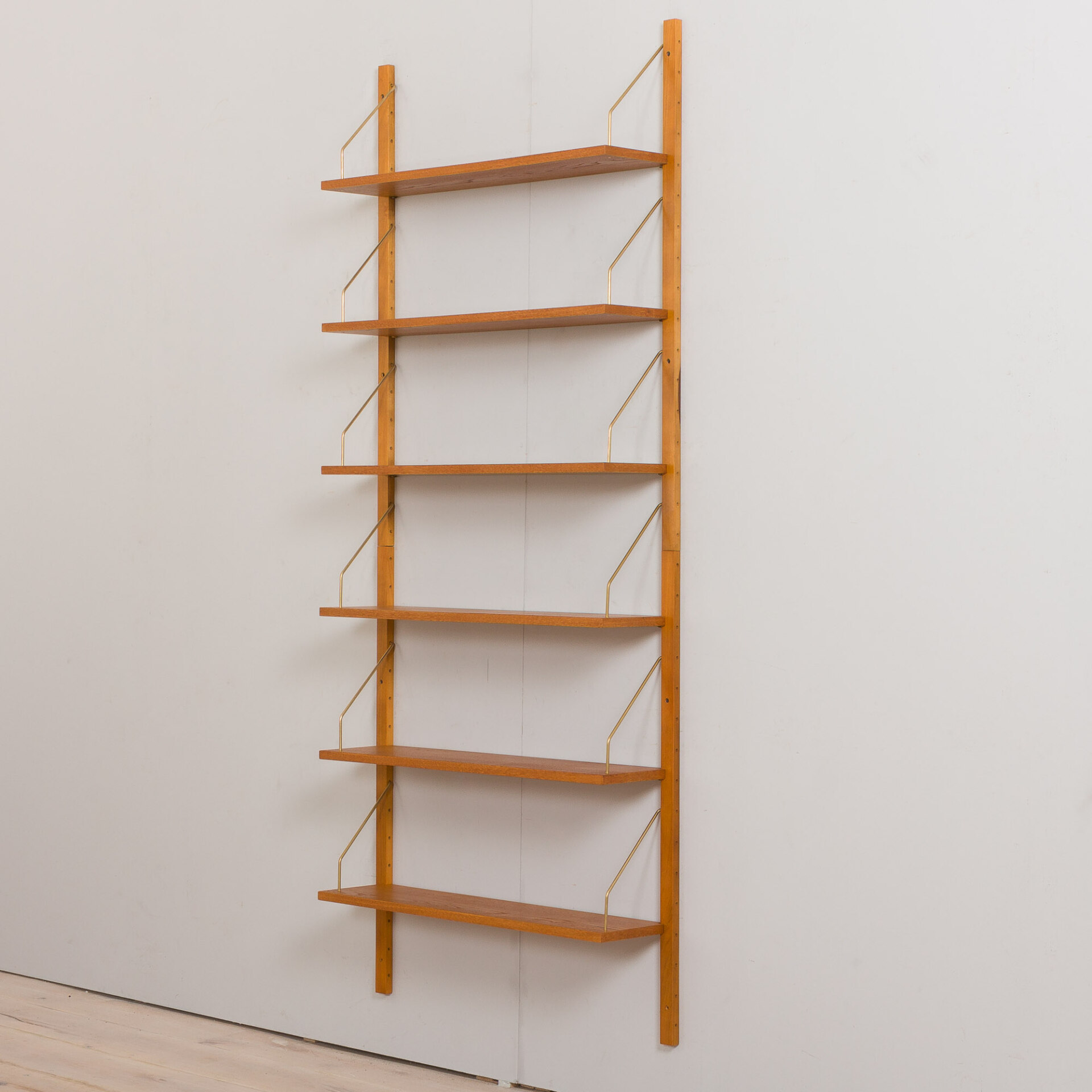 Simple yet elegant, Danish vintage modular shelving system in the style of Cadovius and Preben Sorensen (similar mounting system and carpentry). This Danish wall unit in oak veneer features six shelves supported by brass hangers and mounted on solid wood rails. The spacing between shelves can be arranged upon one’s will. The rails are combined from two independent parts each. This vintage wall unit will works well both in the office as well as living room or bedroom.