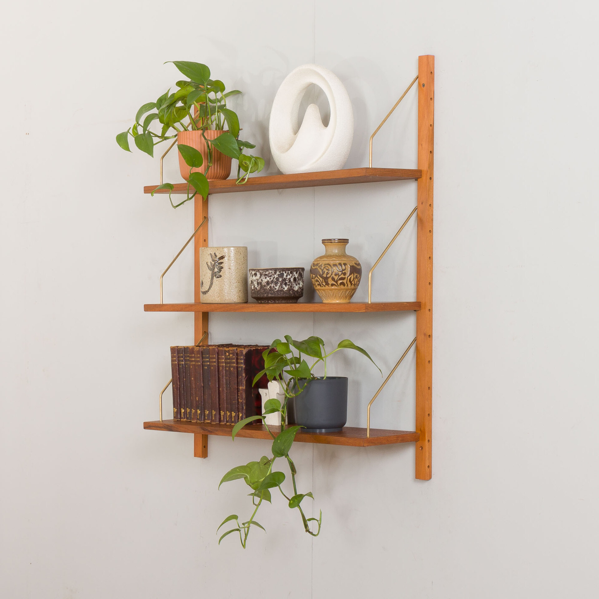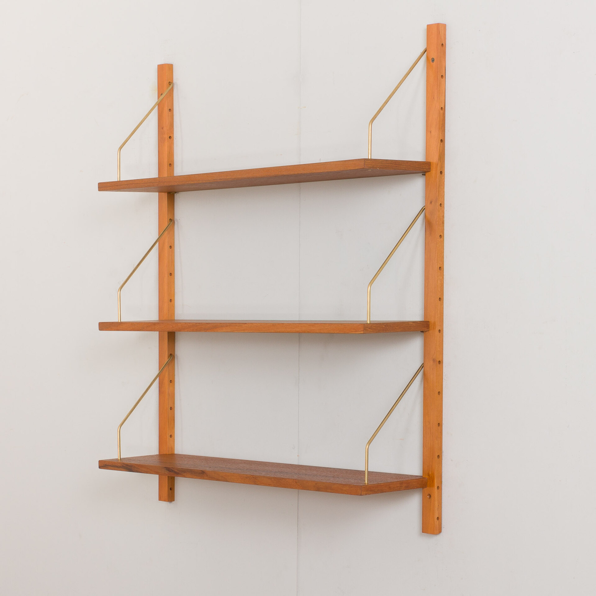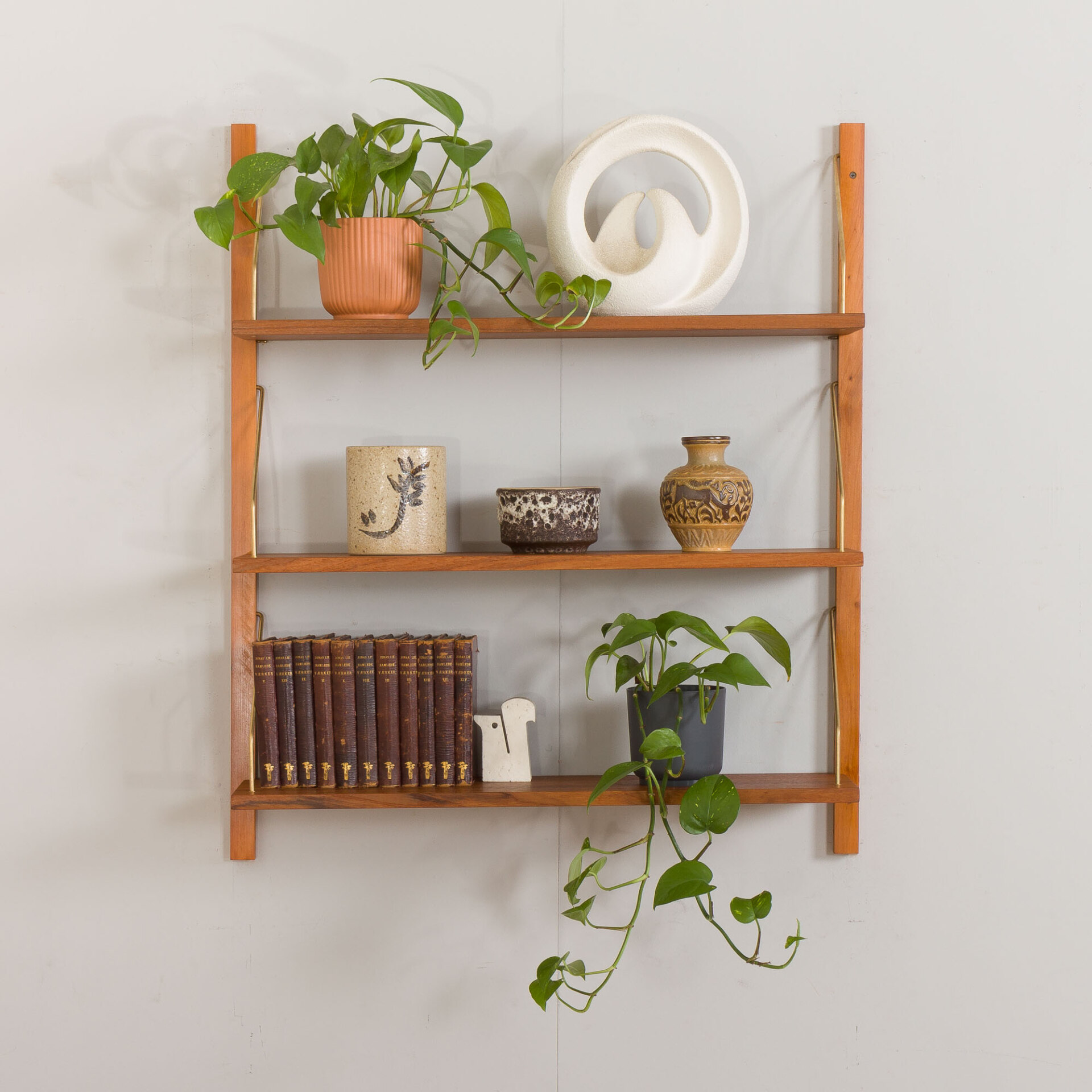 Danish wall unit in teak – modular shelving system w/ 3 shelves in Cadovius PS System Sorensen style