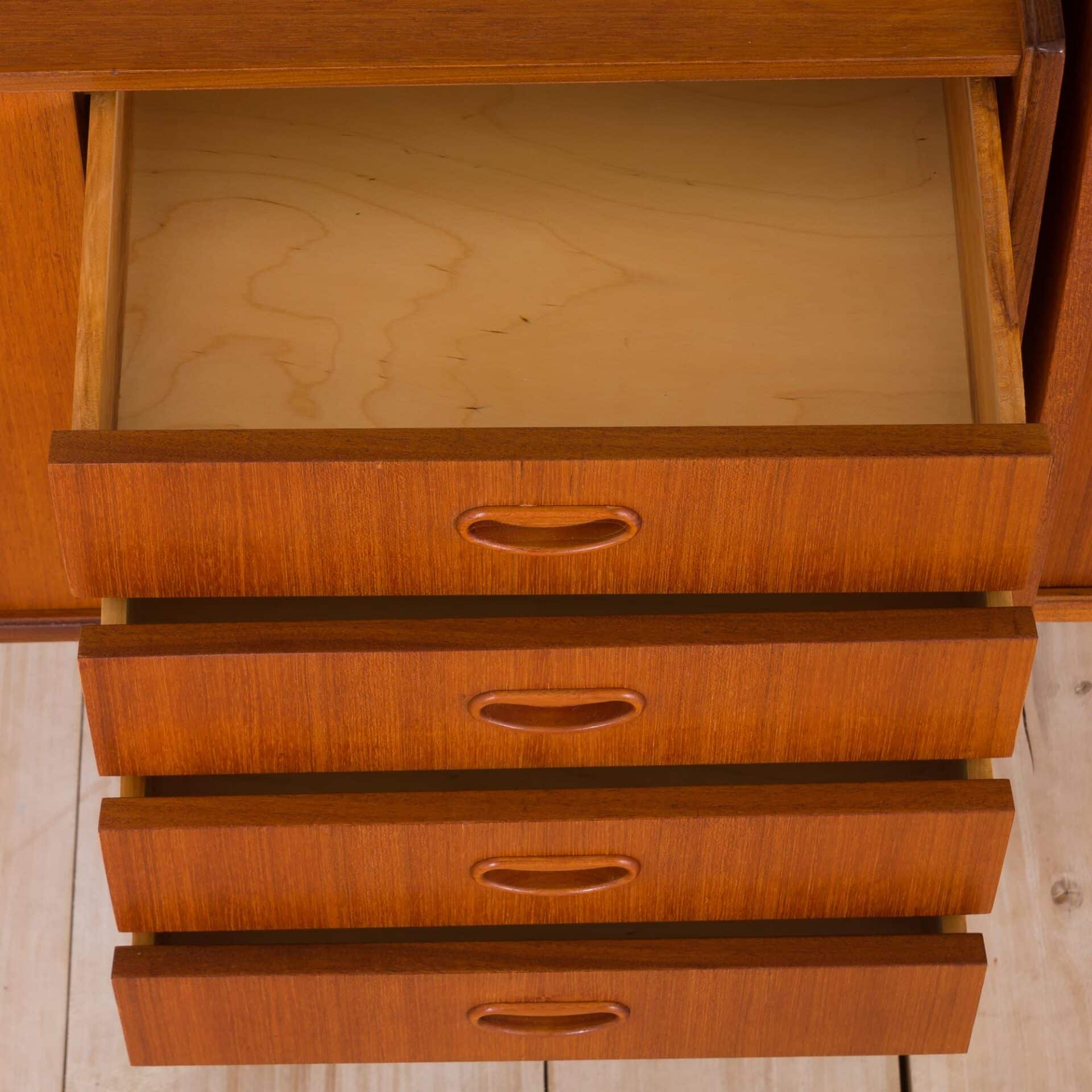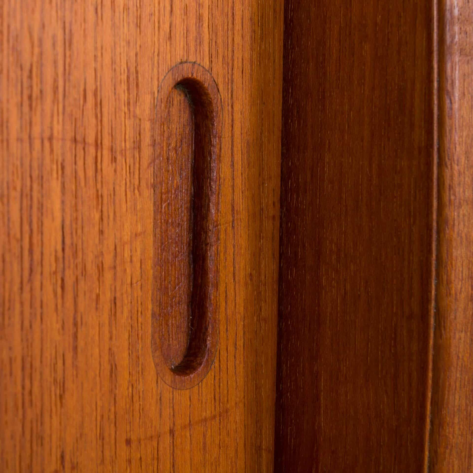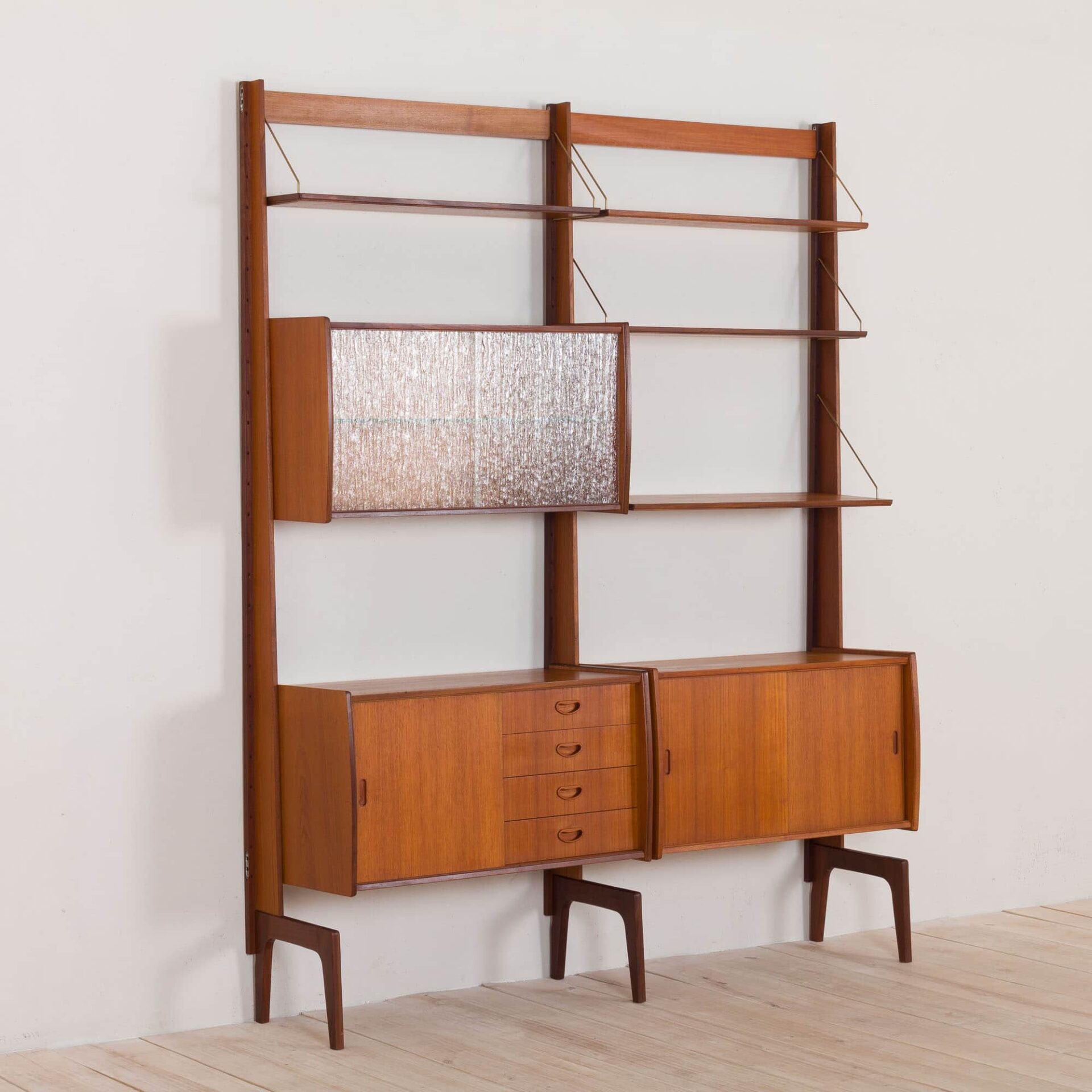 Norwegian free standing wall unit design by Torbjorn Afdal For Bruksbo Scandinavian Tyristrand in Norway in the 60s. It was made wiith great care of details ( mostly in solid teak ) and very fine carpentry solutions. Delicate lines, especially of the base enchance the mid century look of this piece. The unit consists of: – Two bottom cabinets, one with sliding doors,one with 4 drawers , 42cm D. – One display cabinet with glass sliding doors 32cm D. -Three shelves 20cm D. – One shelf 30cm D. – Three teak rails and brass harware Great original condition with very clean interiors of the cabinets and teak wood preserved with layer of teak oil.