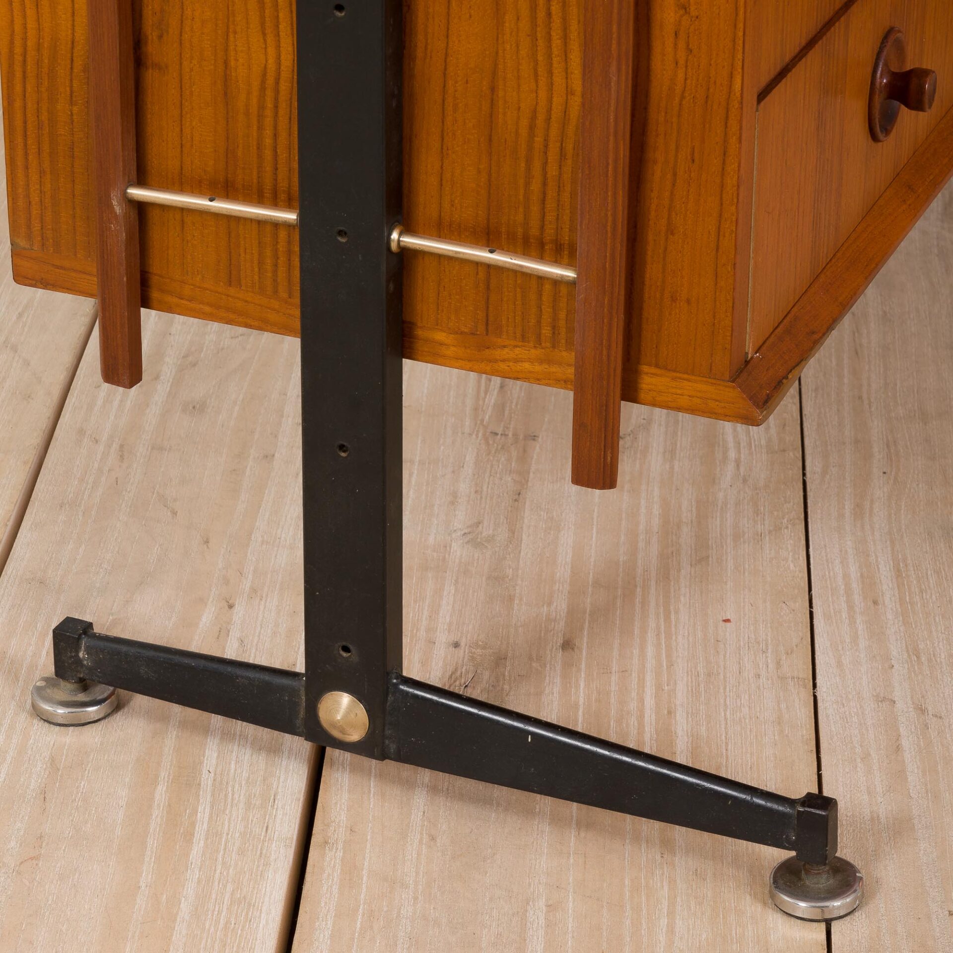 Consisting of two independent modules that can stand together or completely independent. Great quality in every detail, very resemble of Gio Ponti designs from the same period. Made in teak with brass ornamental parts and metal black varnished main rails. Back side also veneered what makes it perfect room devider. Adjustable feet, help level off the unit on uneven ground like tiles, old wood floor etc.