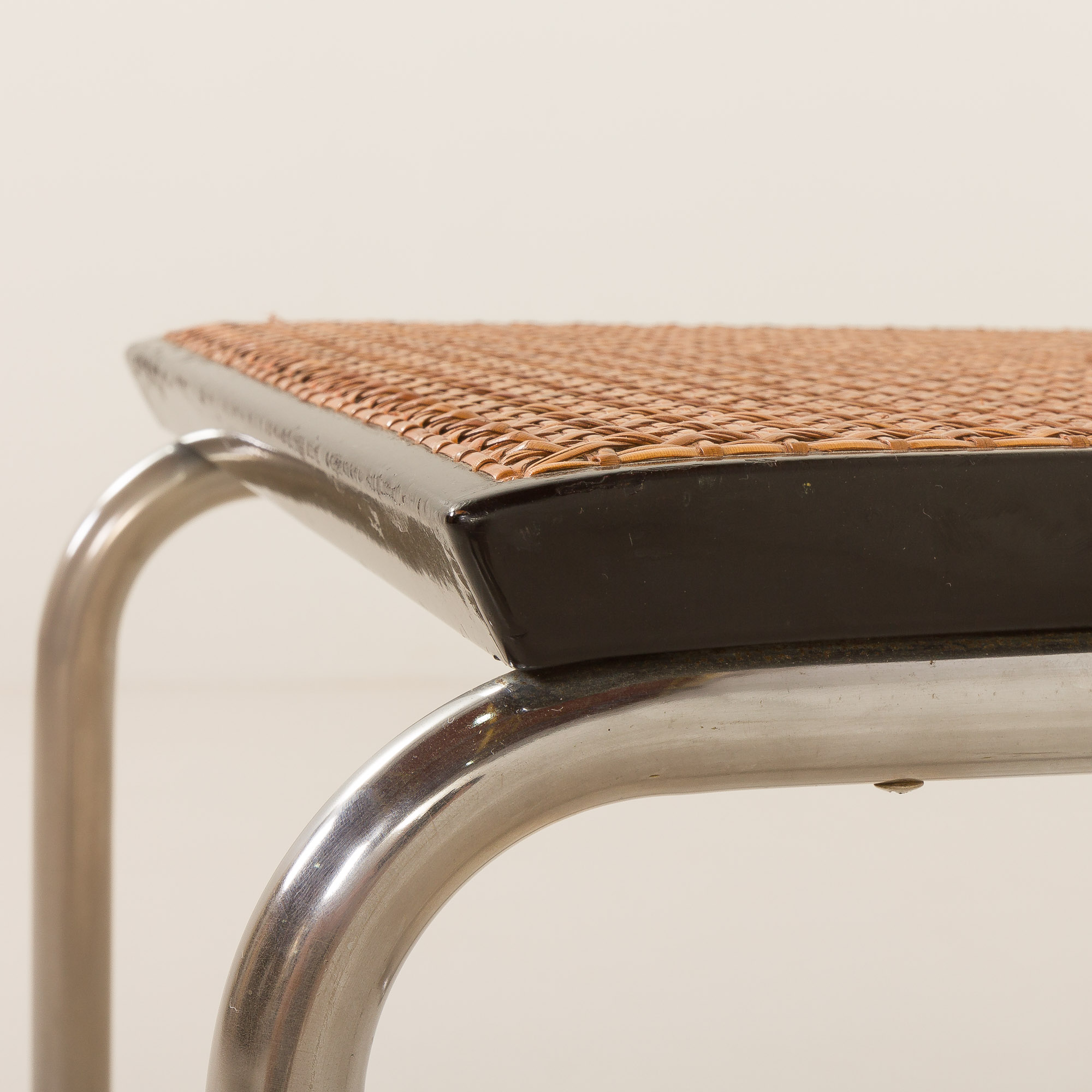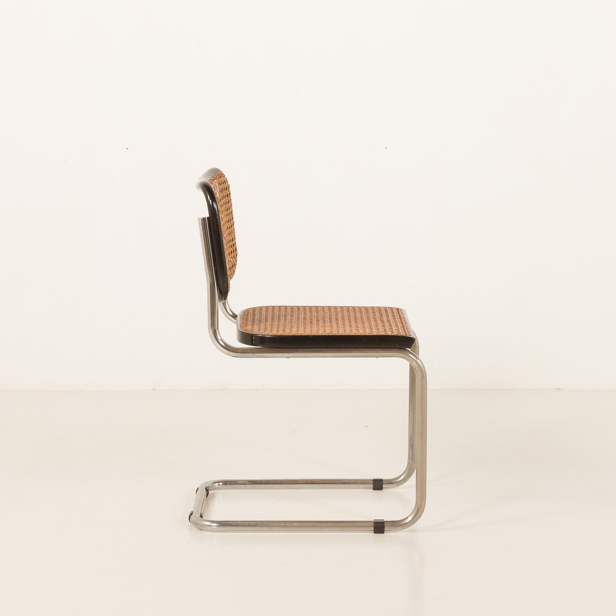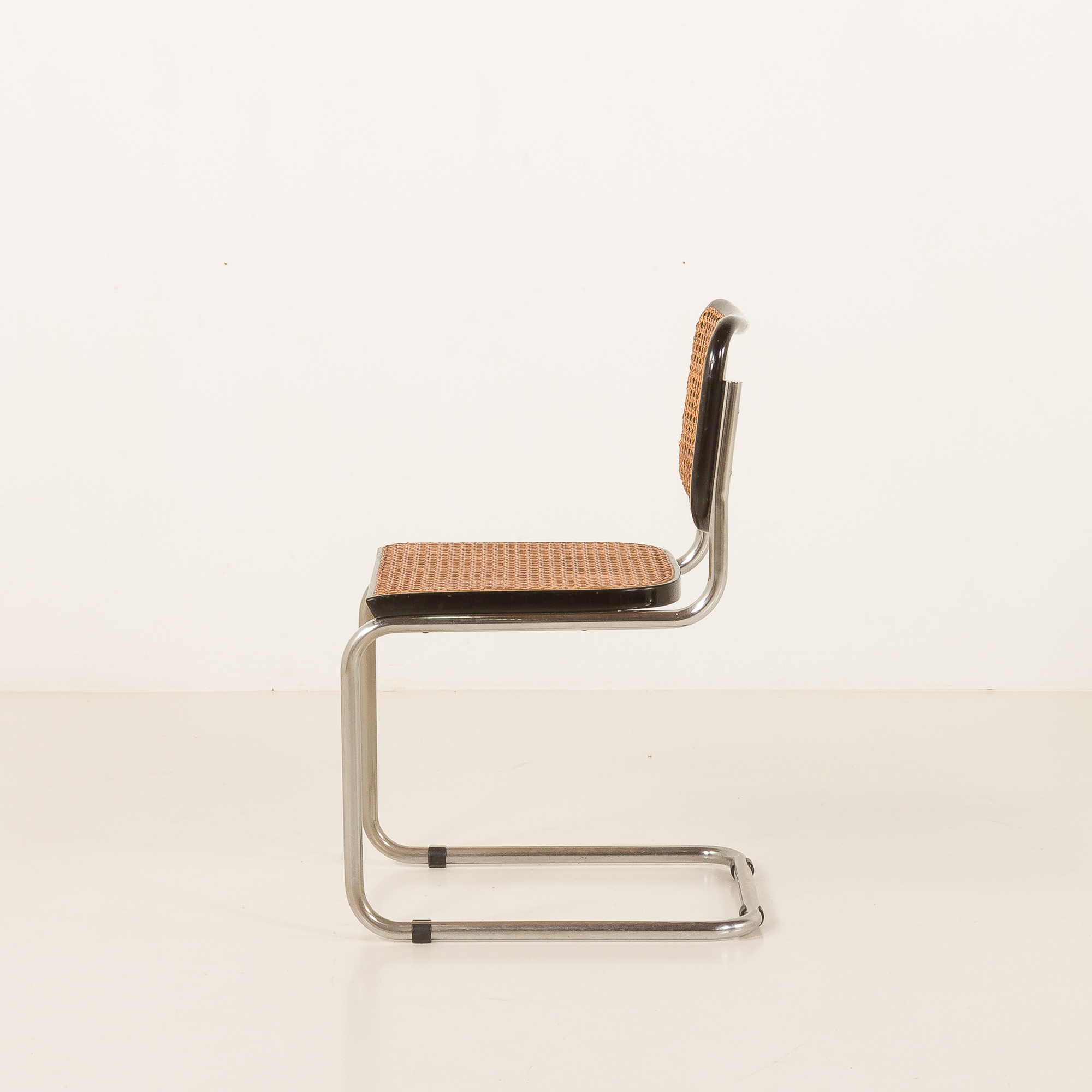 This particular Cesca chair features a classic black varnished beech frame. The seat and back are made from hand woven cane, a natural material that beautifully contrasts with the dark frame and adds a touch of warmth and texture to the design. Manual cross over weaving trough the holes distingushes Gavina chairs from other Italin versions form the period. It is a very labour consuing process that was orignaly introduced in the 1930 in early Breuers versions manufactured by Thonet. The honey-gold color of the cane weaving has aged beautifully over time, with a lovely patina that enhances the chair’s warm appearance. The frame is crafted from tubular steel. This construction provides comfort, support and durability but also gives the chair its timeless silhouette.